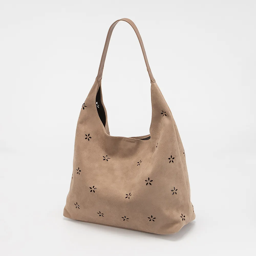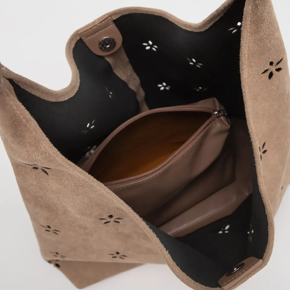 Сумка от торговой марки Valigetti выполнена из искусственной замши. Модель с длинной ручкой, являющейся продолжением сумки. Декорирована перфорацией в виде цветочков. Отделение на магнитной кнопке без подкладки. Внутри имеется компактная сумка-вкладыш на молнии.