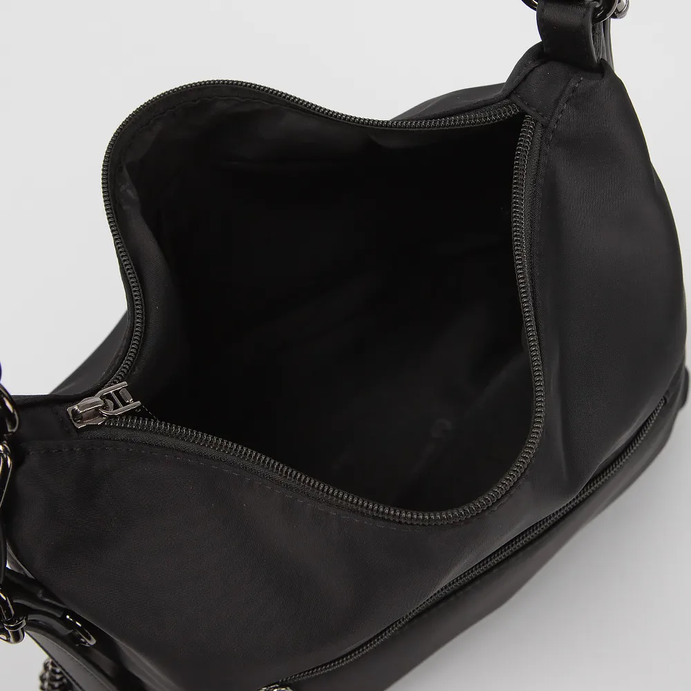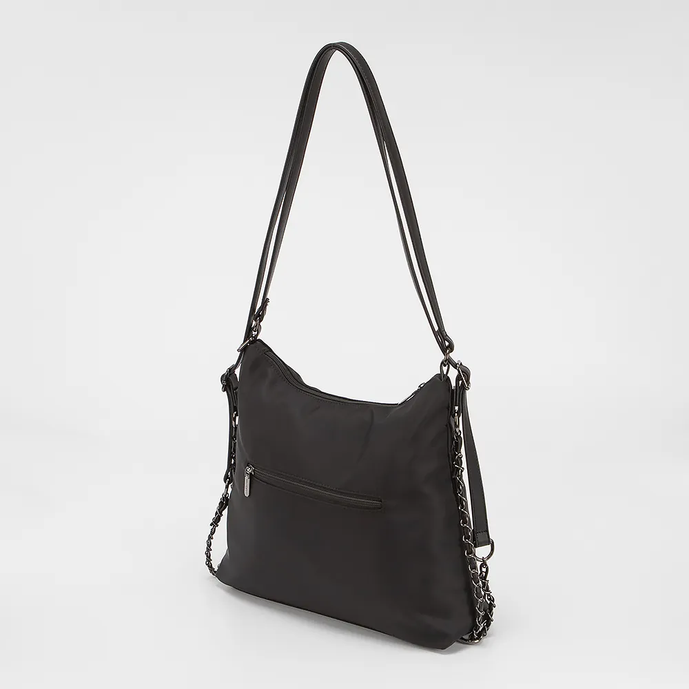 Сумка-рюкзак от торговой марки Valigetti выполнен из текстильного материала черного цвета. Модель с плечевым ремнем, который стягивается в плечевые лямки. Отделение на молнии. Внутри: текстильная подкладка, карман на молнии, накладной карман. На задней стороне - карман на молнии.