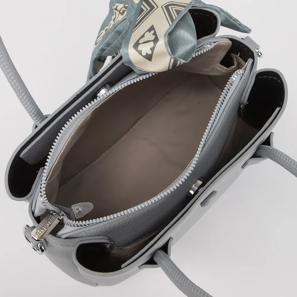 Сумка от торговой марки Valigetti выполнена из искусственной кожи. Модель с двумя ручками и съемным регулируемым плечевым ремнем. Декорирована платком твилли. Три отделения: среднее - на молнии, боковые - на магнитной кнопке. Дно оснащено металлическими ножками для защиты от износа.