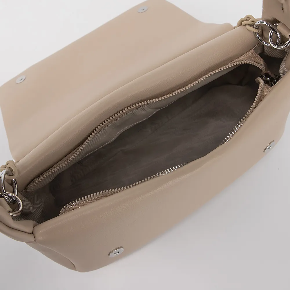 Сумка от торговой марки Valigetti выполнена из искусственной кожи кофейного цвета. Модель с коротким плечевым ремнем. Декорирована цепочкой. Клапан за магнитных кнопках закрывает отделение на молнии. Внутри: текстильная подкладка, карман на молнии, накладной карман.