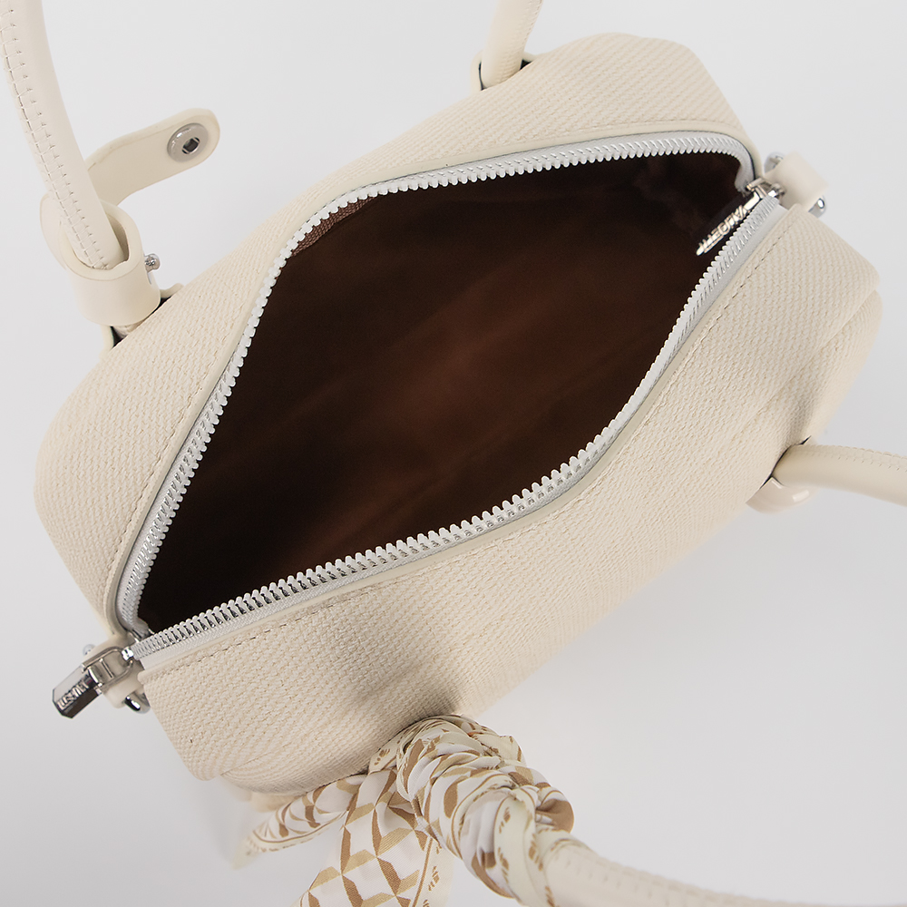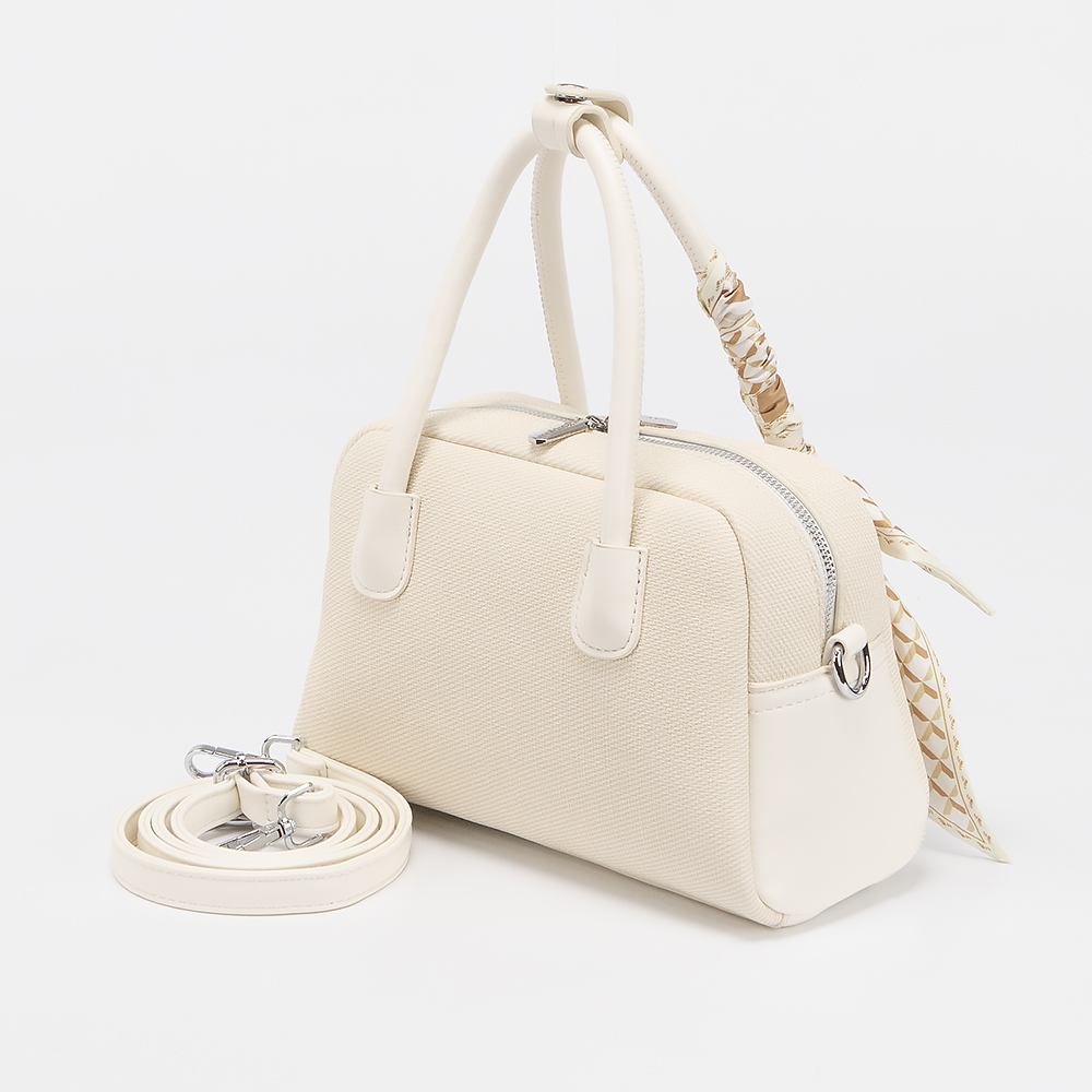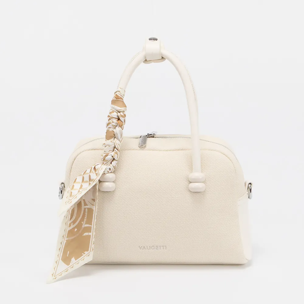 Сумка от торговой марки Valigetti выполнена из искусственной кожи белого цвета. Модель с двумя ручками и съемным регулируемым плечевым ремнем. Декорирована платком твилли. Отделение на молнии. Внутри: текстильная подкладка, карман на молнии, накладной карман.