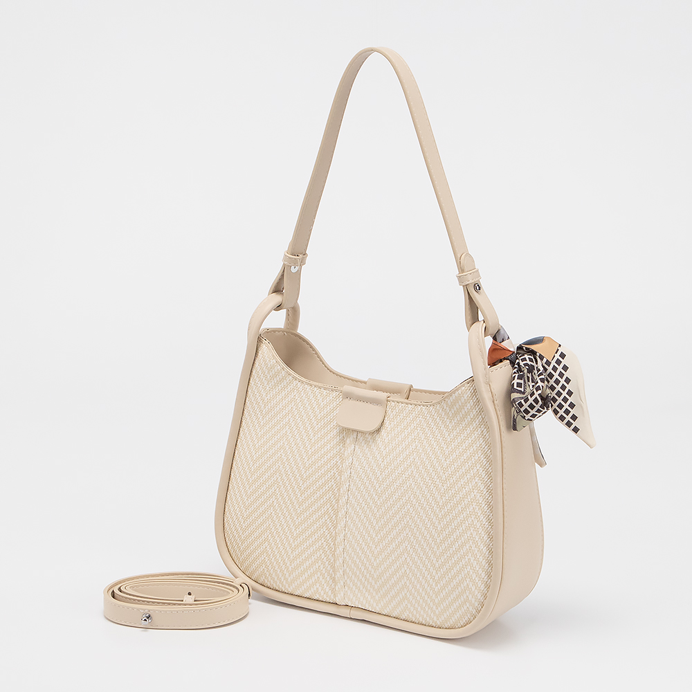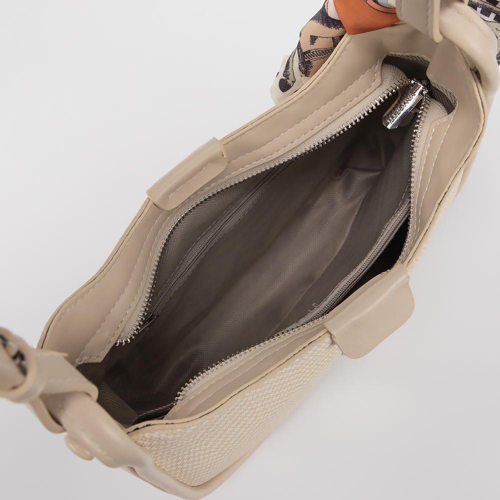 Сумка от торговой марки Valigetti выполнена из искусственной кожи с текстильными вставками с узором. Модель с длинной ручкой и съемным регулириуемым плечевым ремнем. Декорирована платком твилли. Отделение на молнии. Внутри: текстильная подкладка, карман на молнии, накладной карман.