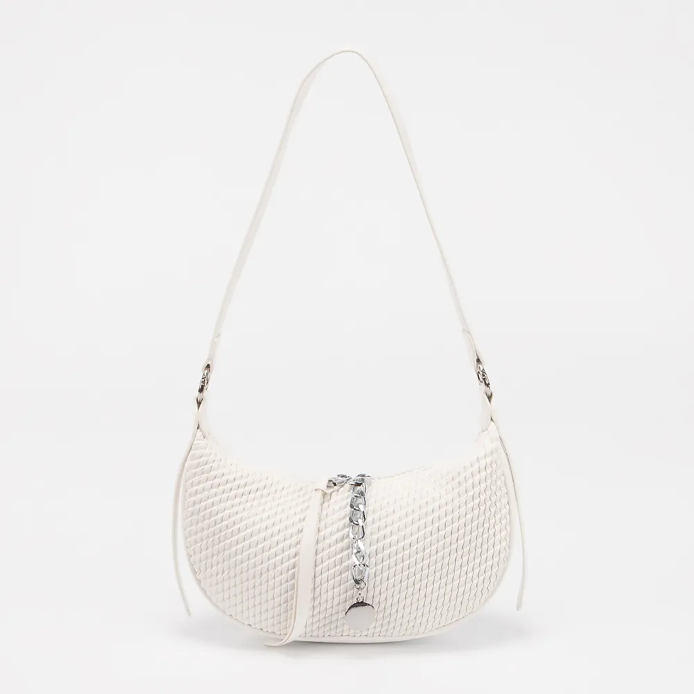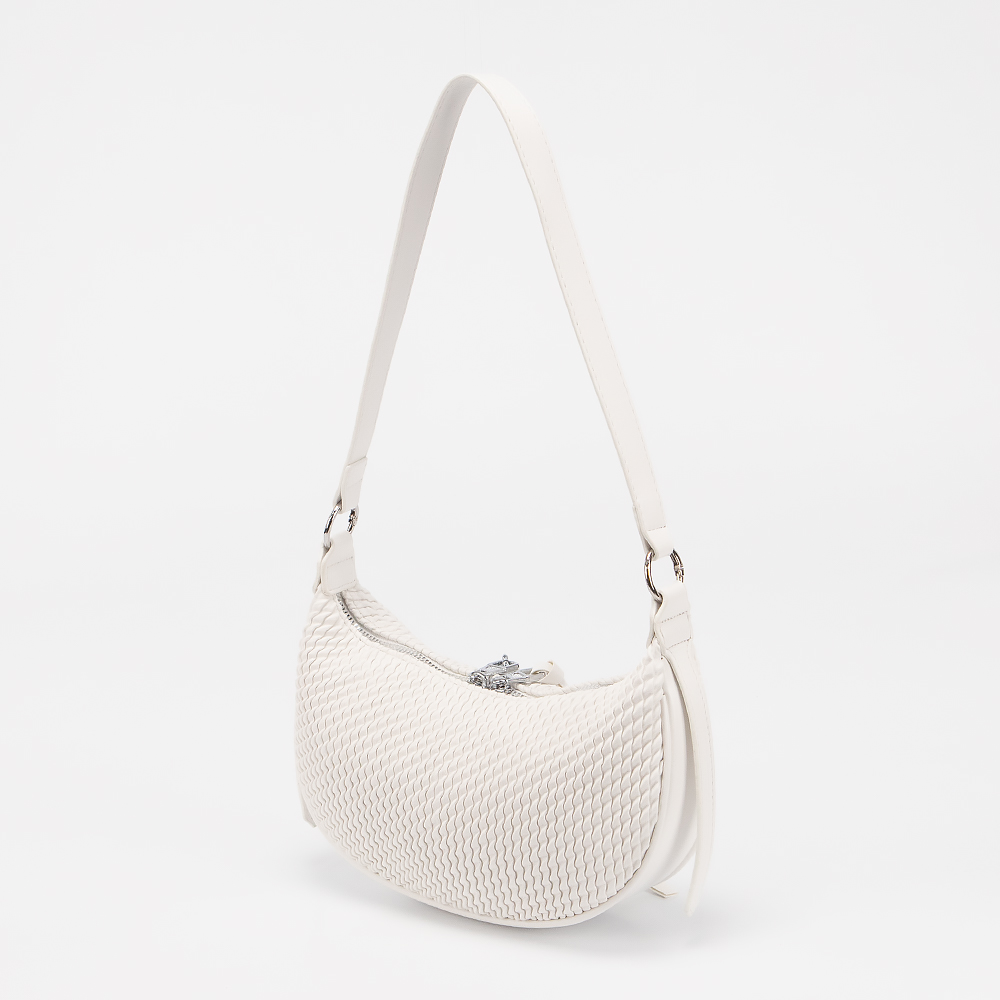 Сумка от торговой марки Valigetti выполнена из искусственной кожи белого цвета с тиснением. Модель с коротким регулируемым плечевым ремнем. Декорирована подвеской. Отделение на молнии. Внутри: текстильная подкладка, карман на молнии.