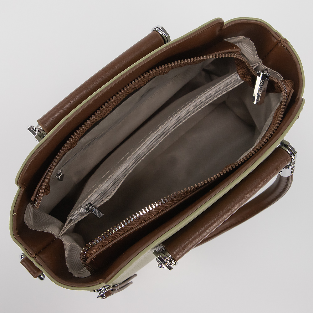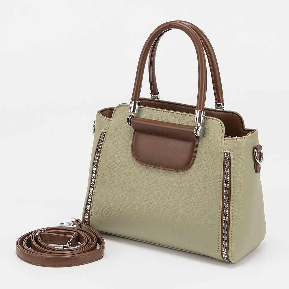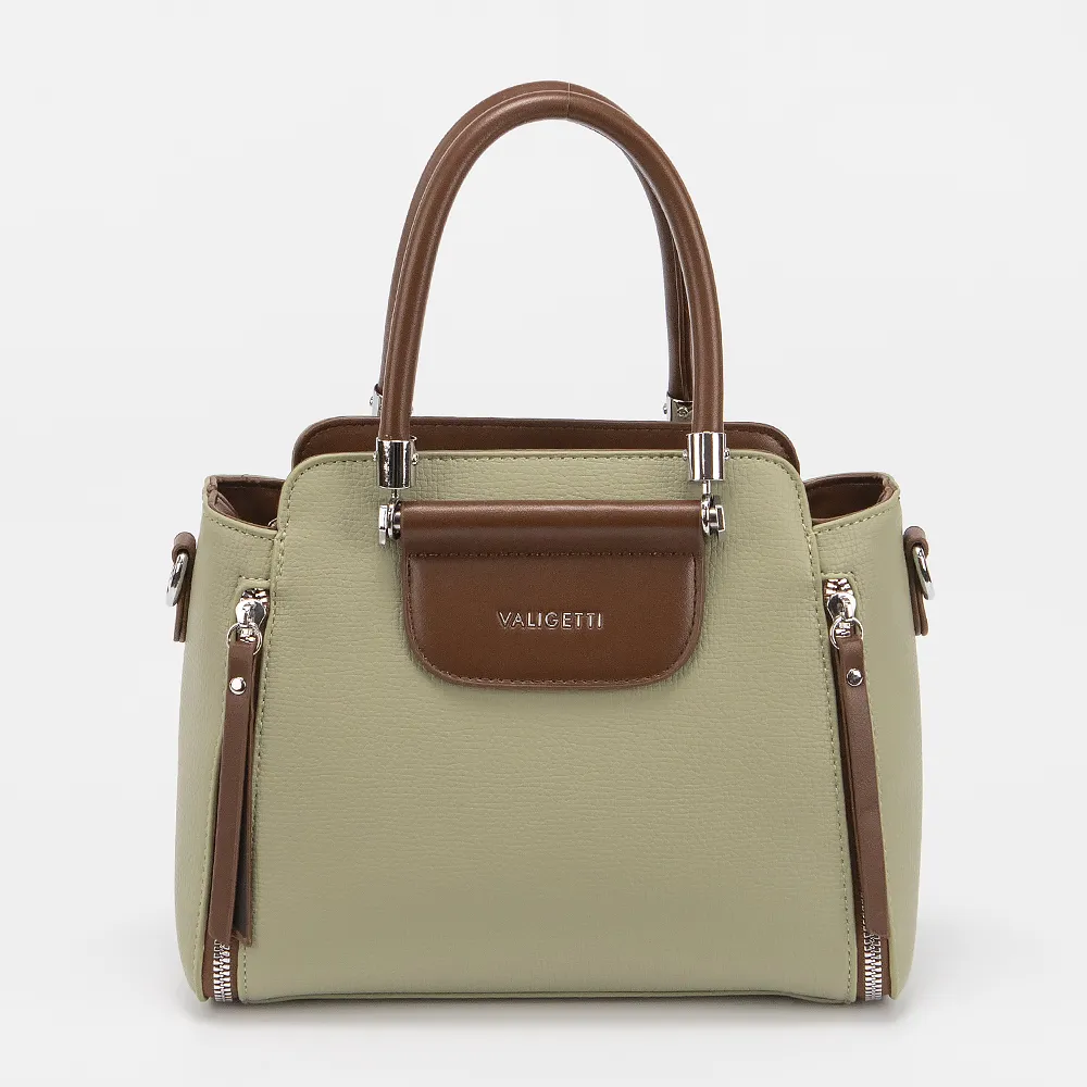 Сумка от торговой марки Valigetti выполнена из искусственной кожи зеленого цвета. Модель с двумя ручками и съемным регулируемым плечевым ремнем. Отделение на молнии. Внутри: текстильная подкладка, карман и средник на молнии, накладной карман.