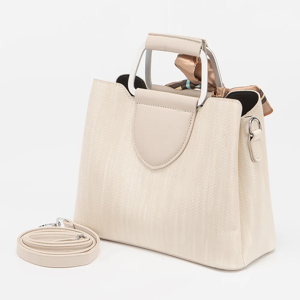 Сумка от торговой марки Valigetti выполнена из искусственной кожи бежевого цвета с тиснением под плетение. Модель с двумя ручками и съемным регулируемым плечевым ремнем. Три отделения: среднее - на молнии, боковые - на магнитной кнопке. Внутри: текстильная подкладка, карман на молнии, накладной карман.
