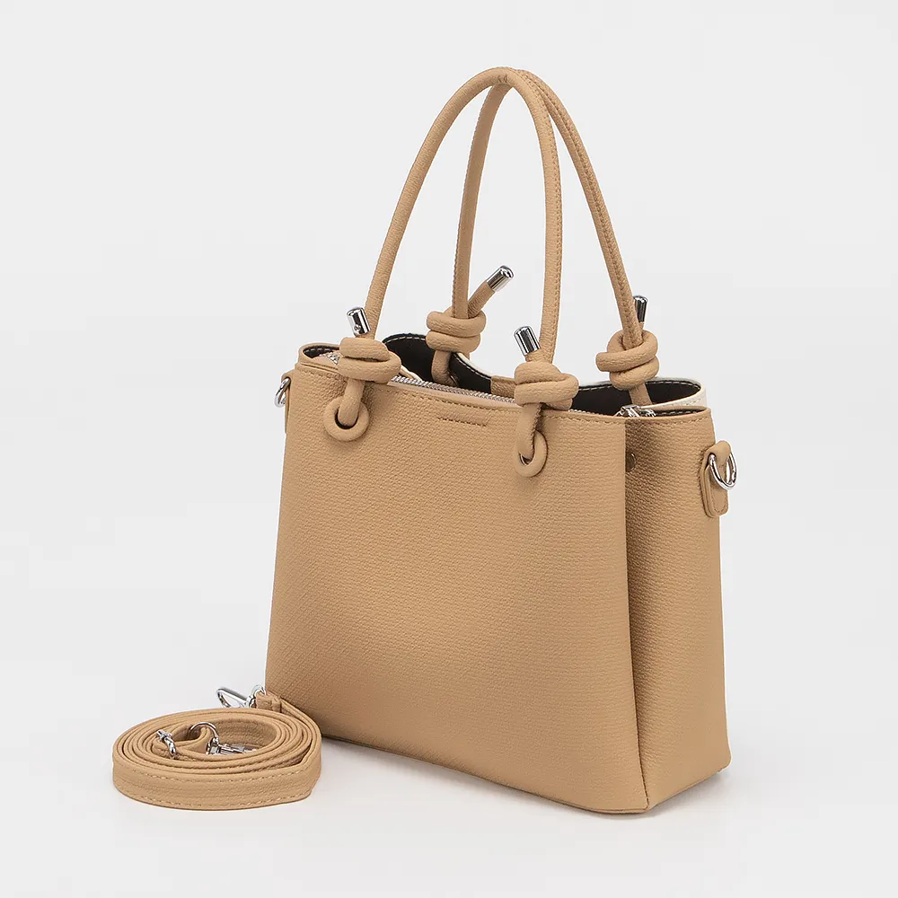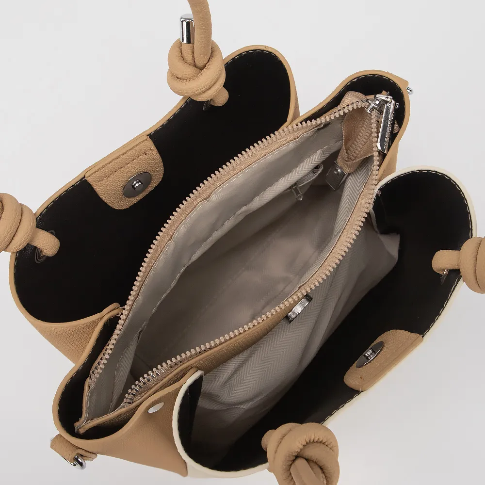 Сумка от торговой марки Valigetti выполнена из искусственной кожи бежевого цвета. Модель с двумя ручками, декорированными узлами и съемным регулируемым плечевым ремнем. Три отделения: среднее - на молнии, боковые - на магнитной кнопке. Внутри: текстильная подкладка, карман на молнии, накладной карман.