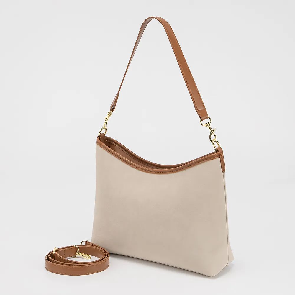 Сумка от торговой марки Valigetti выполнена из искусственной кожи бежевого цвета. Модель с удлиненной ручкой и съемным регулируемым плечевым ремнем. Отделение на молнии. Внутри: текстильная подкладка, карман и средник на молнии, накладной карман.