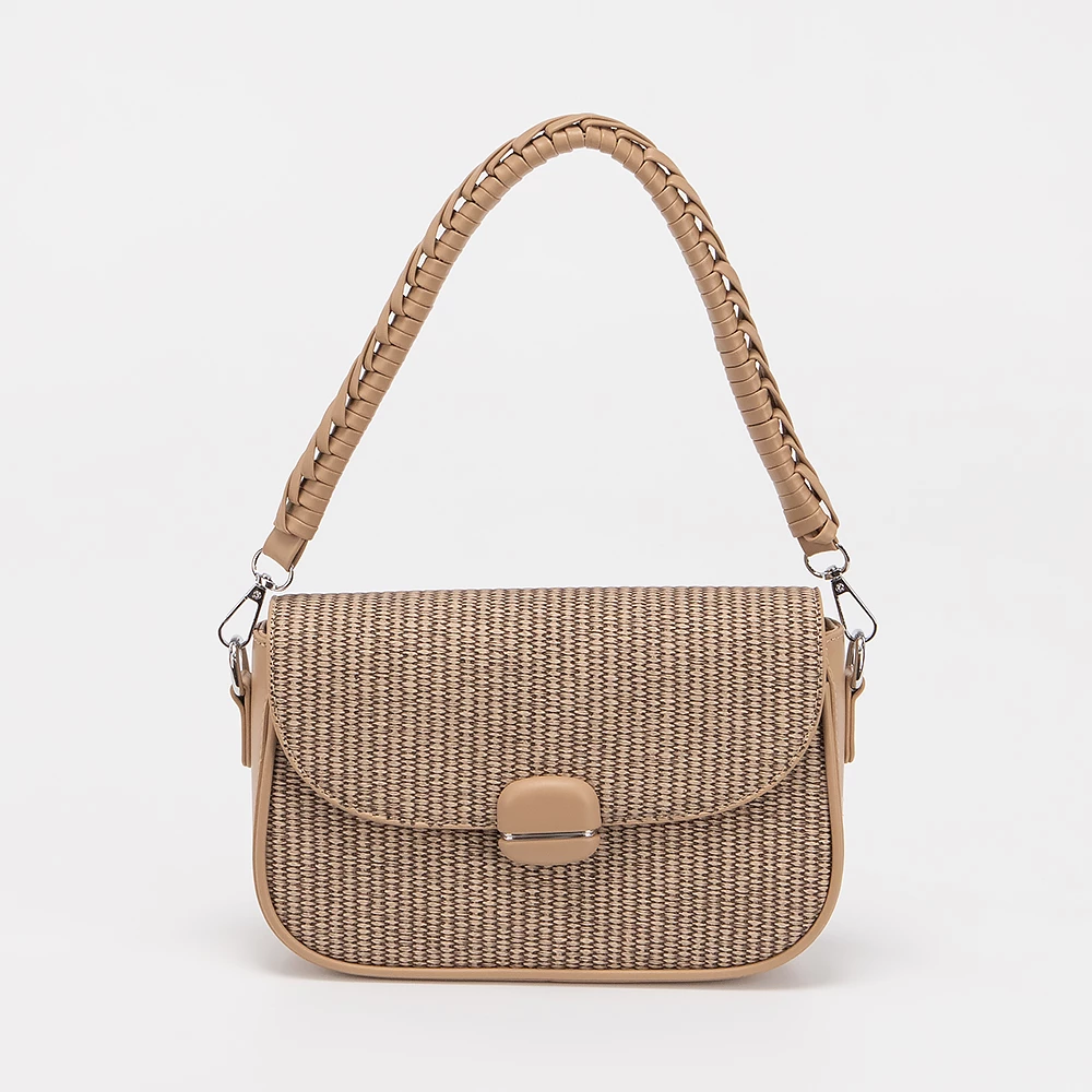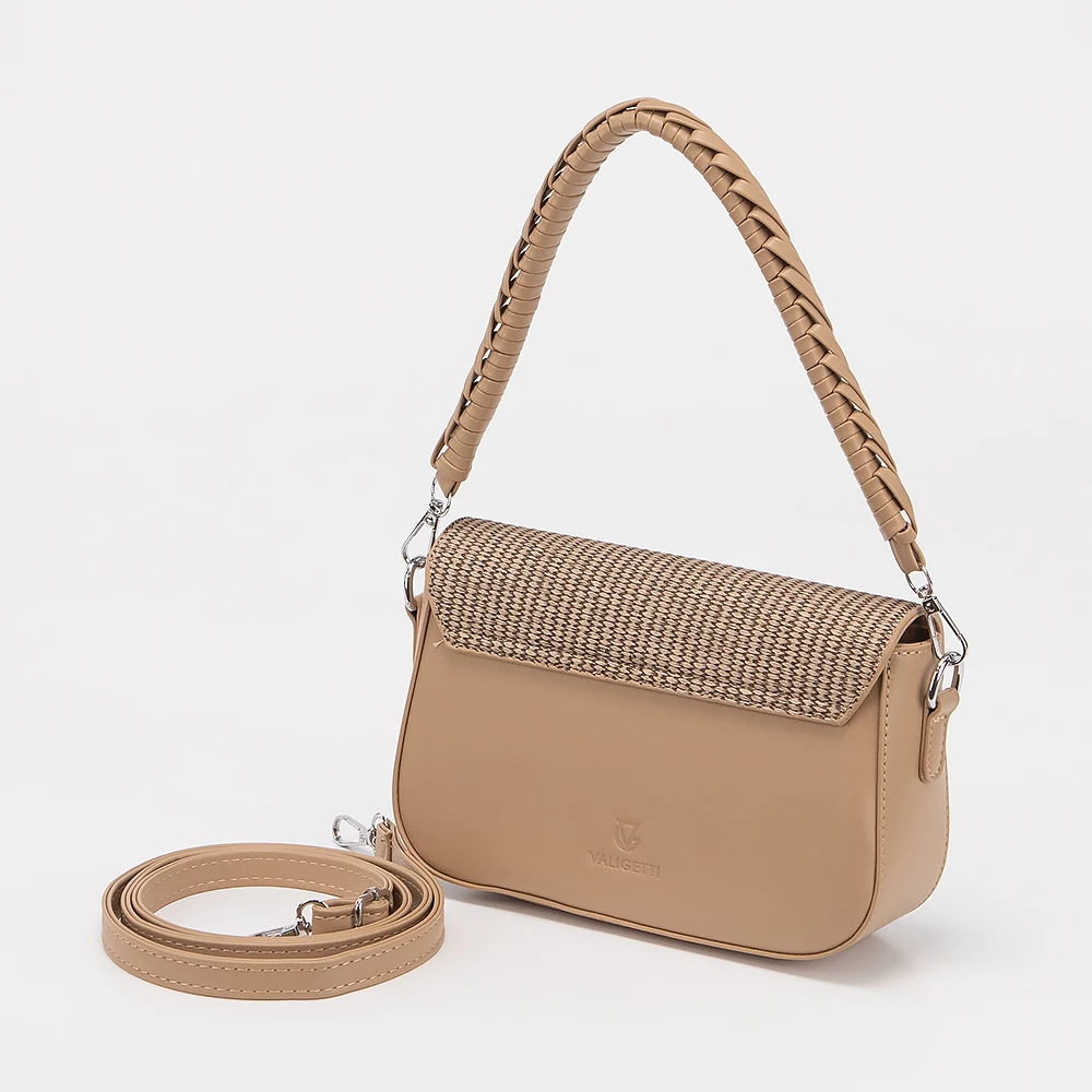 Сумка от бренда Valigetti выполнена из искусственной кожи кофейного цвета с тиснением в виде плетения. Модель с длинной плетеной ручкой и длинным регулируемым плечевым ремнем. Декорирована платком твилли. Клапан на магнитной кнопке закрывает отделение на молнии. Внутри: текстильная подкладка, карман на молнии, накладной карман.