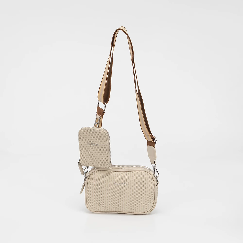 Сумка от бренда Valigetti выполнена из искусственной кожи бежевого цвета. Модель со съемным широким плечевым ремнем, на который крепится небольшой кошелек на молнии. Два отделения на молнии. Внутри: текстильная подкладка, карман на молнии, накладной карман.
