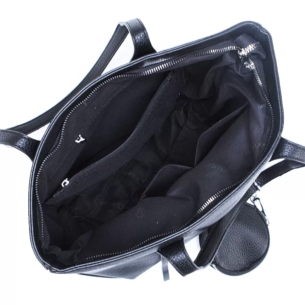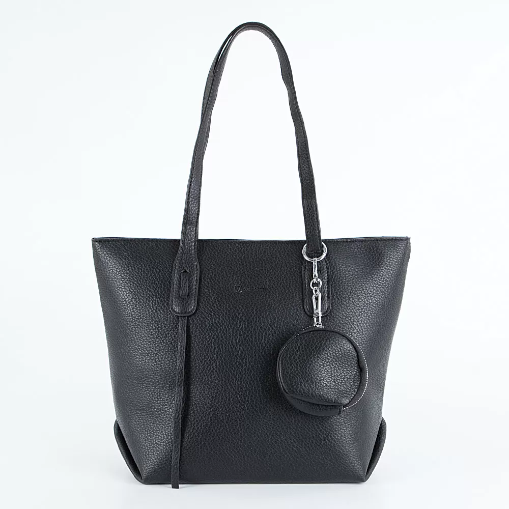 Сумка бренда Valigetti изготовлена из искусственной кожи черного цвета и имеет две длинные ручки. Она оснащена основным отделением на молнии, внутренним карманом на молнии, двумя накладными карманами и перегородкой с карманом на молнии. На задней части сумки также есть карман на молнии. В комплект к сумке входит съемный кошелек круглой формы на молнии. Эта сумка отлично подойдет для повседневного использования и будет прекрасным дополнением к вашему образу. Она не только стильная, но и практичная, благодаря своим функциональным особенностям.