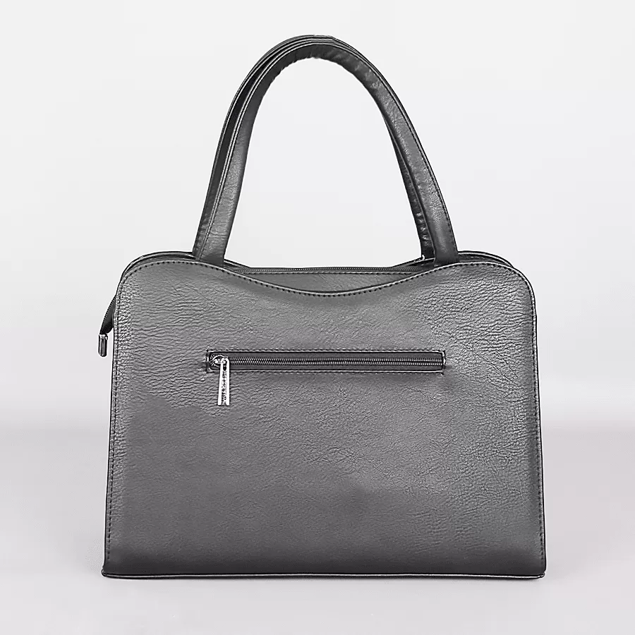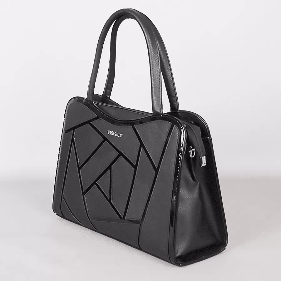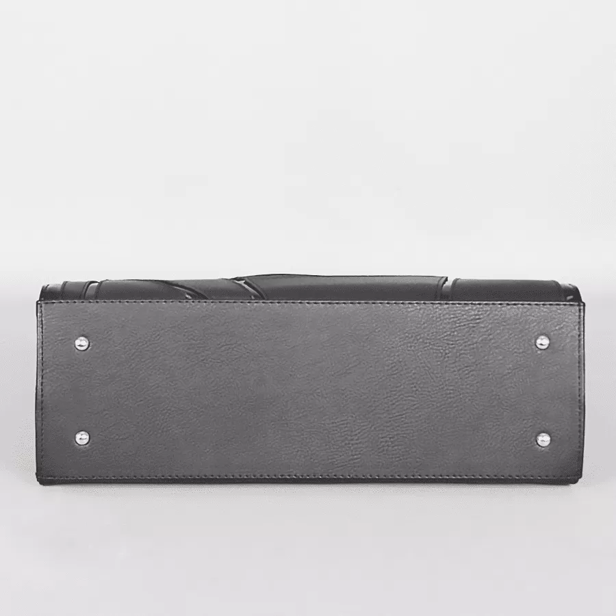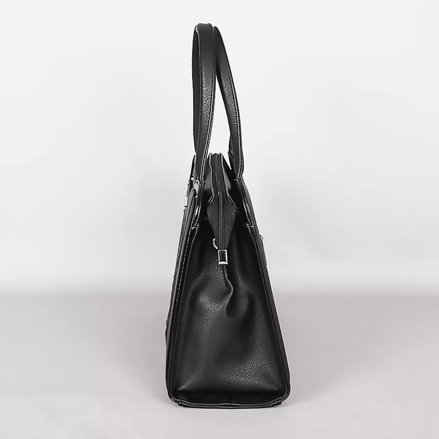 Сумка бренда Valigetti выполнена из искусственной кожи в черном цвете. Она имеет короткие ручки и съемный регулируемый плечевой ремень. На задней стороне расположен карман на молнии для быстрого доступа. Внутри сумки есть одно основное отделение, в котором находится текстильная подкладка, средний отсек на молнии, боковой накладной карман и карман на молнии. У сумки также есть металлические ножки, которые защищают ее от загрязнений и износа.