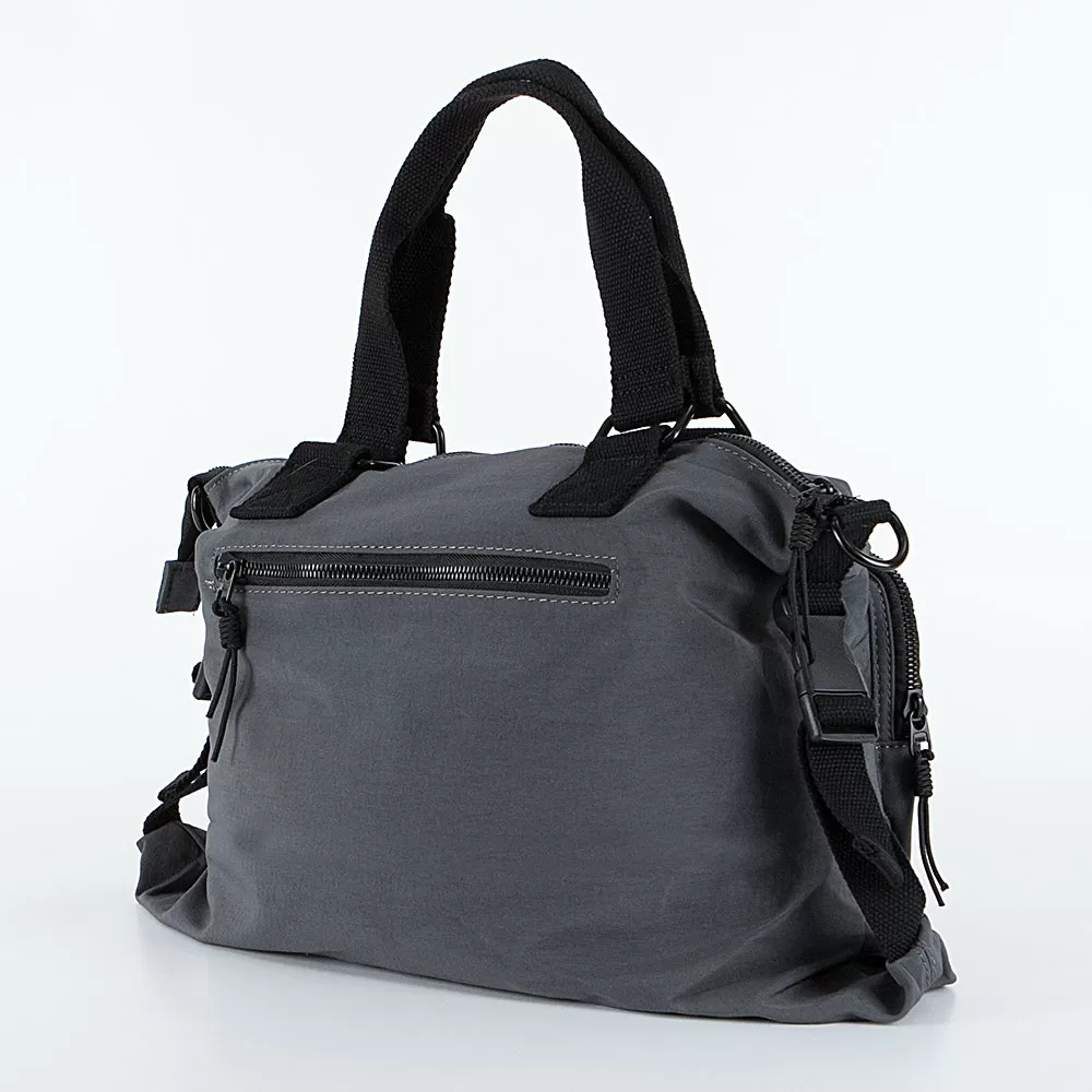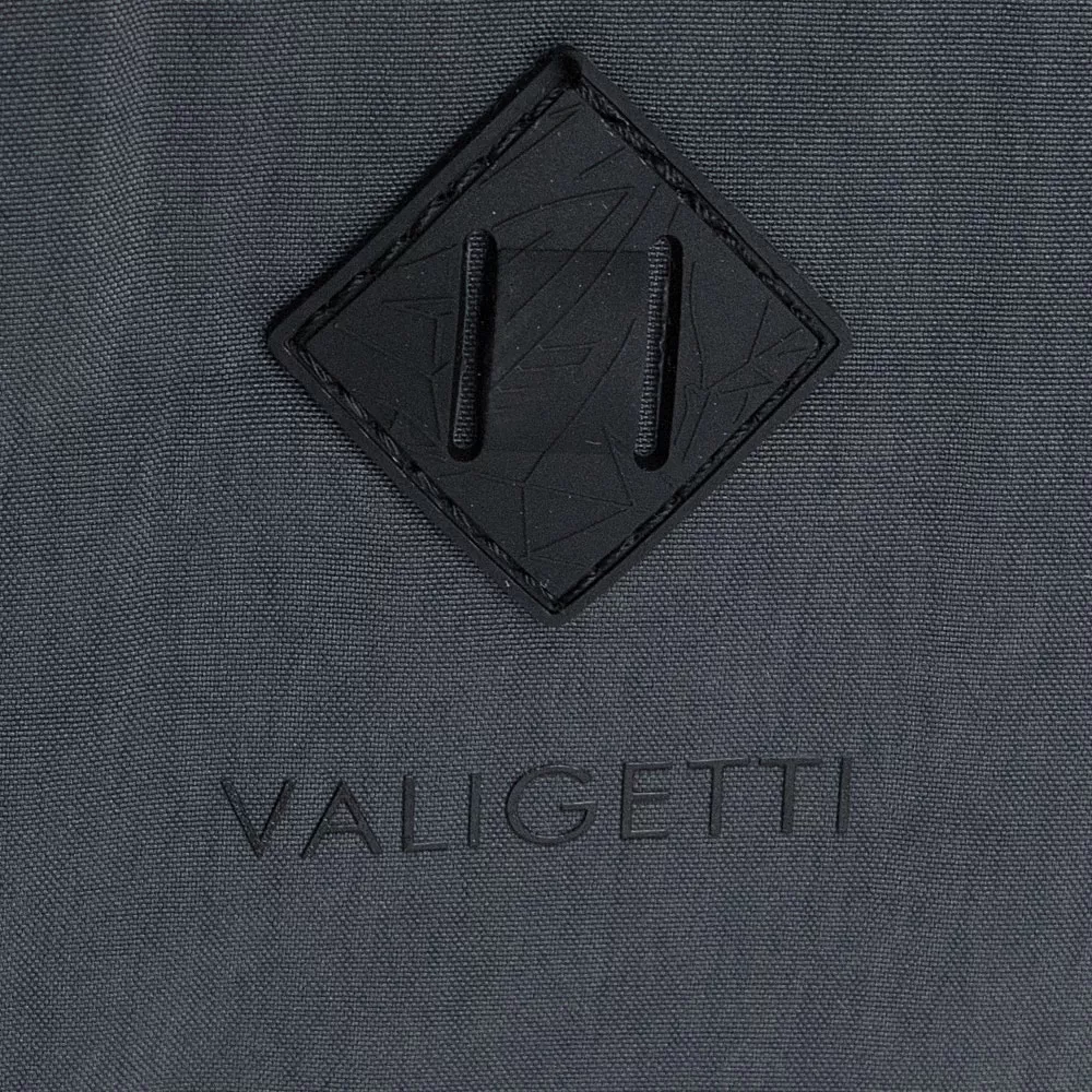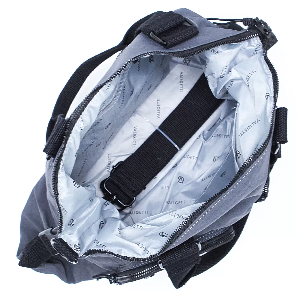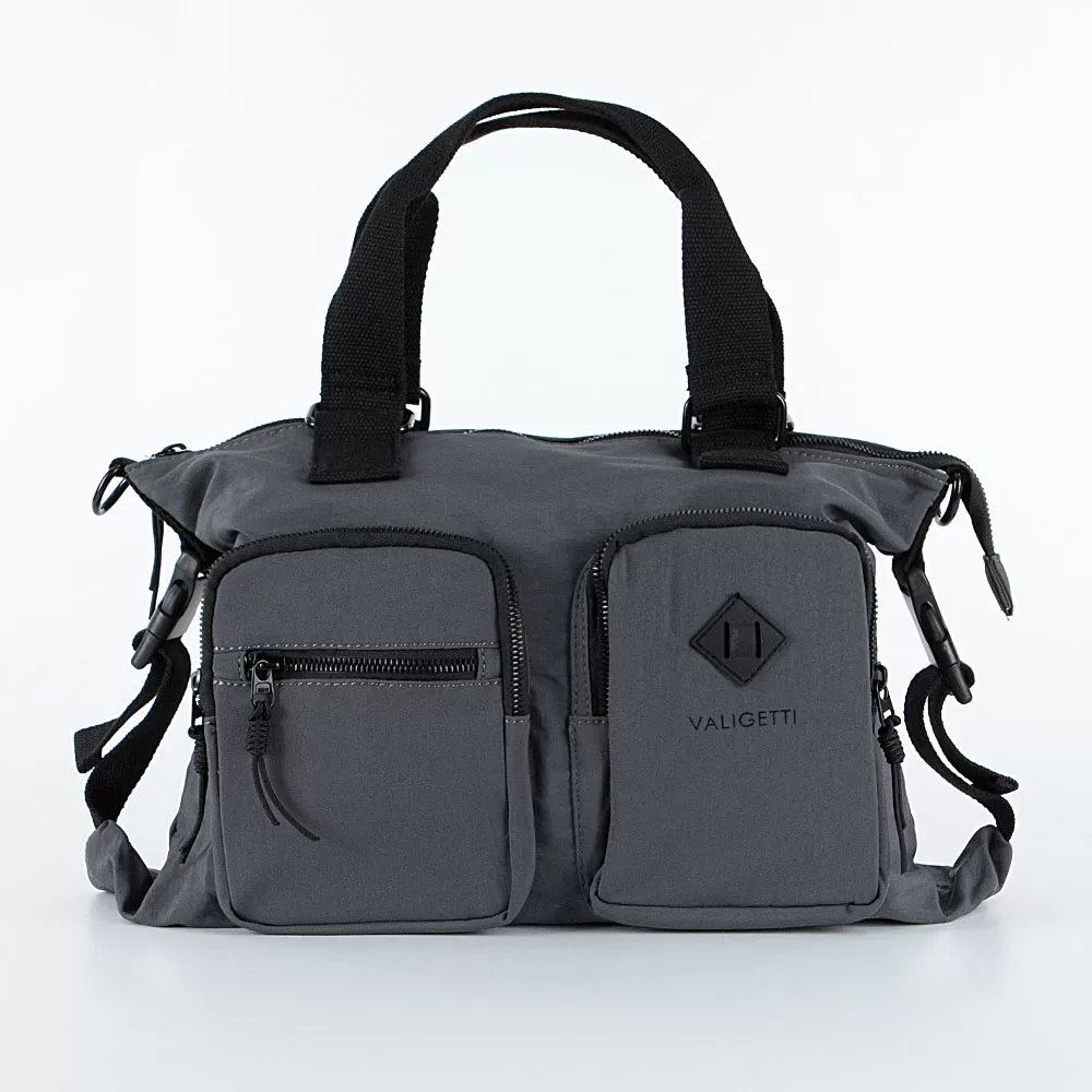 Текстильная сумка бренда Valigetti выполнена в сером цвете. Модель имеет две ручки и съемный регулируемый плечевой ремень. На лицевой стороне расположены два вертикальных и один горизонтальный карманы быстрого доступа на молнии для мелочей. Сзади также есть горизонтальный карман на молнии. Сумка имеет стяжки по бокам, которые позволяют регулировать ее объем. Внутри основного отделения на молнии есть фирменная подкладка, а также два открытых кармана и один потайной карман на молнии.
