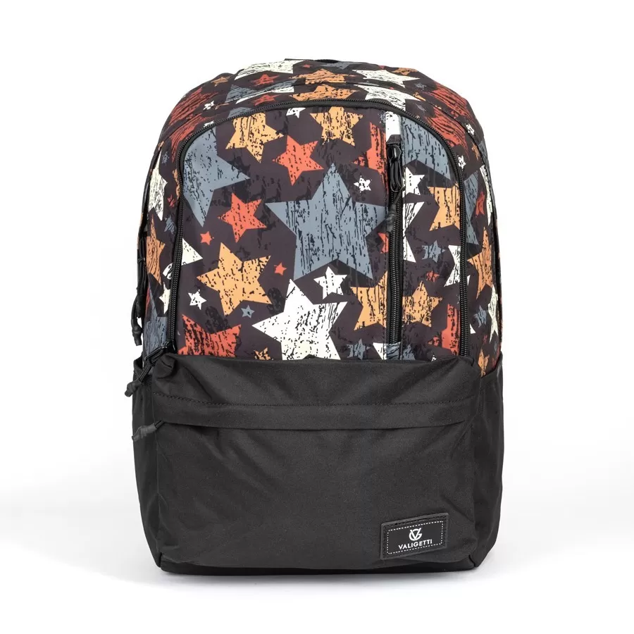 Рюкзак с ярким принтом в виде разноцветных звёзд на тёмном фоне. Нижняя часть выполнена в чёрном цвете, что создаёт контраст и делает дизайн более выразительным. Внутри — отделение для ноутбука с вертикальной стяжкой для фиксации. Два кармана по бокам и спереди.