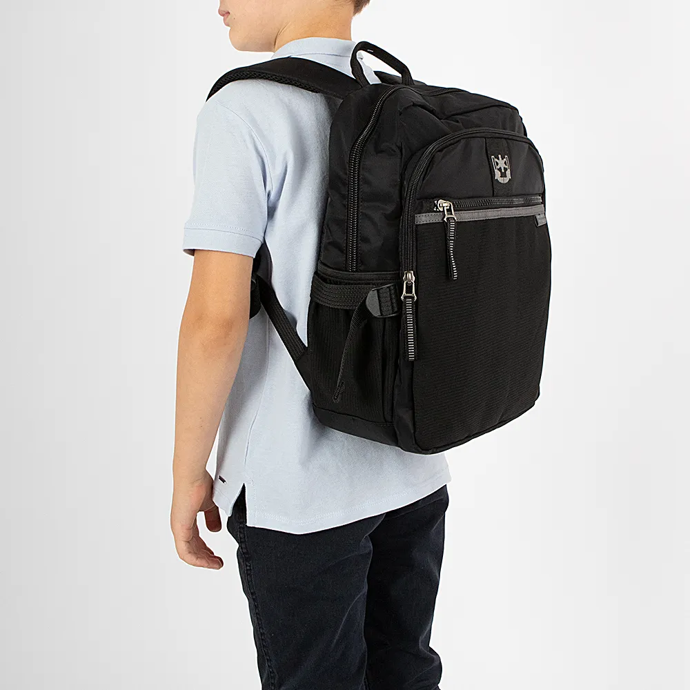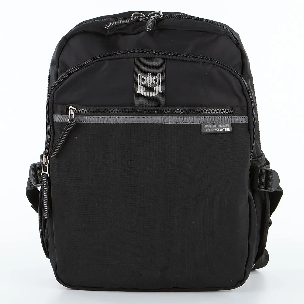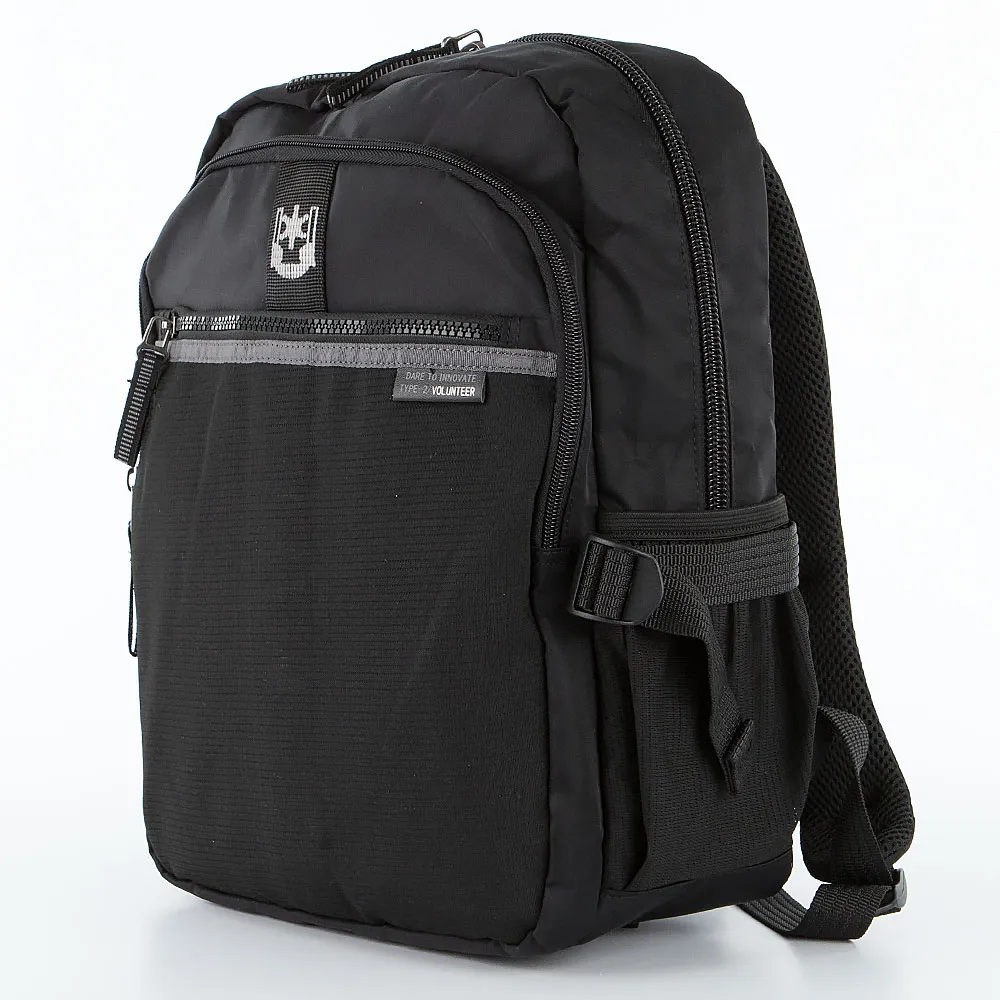 Рюкзак от торговой марки Volunteer из практичного текстильного материала черного цвета. Модель с лямкой-переноской и регулируемыми плечевыми лямками с нагрудным фиксатором для равномерного распределения нагрузки. Отделение на молнии. Внутри: текстильная подкладка, накладной карман с уплотненной стенкой для ноутбука, органайзер, карман на молнии. На лицевой стороне – два кармана на молнии. По бокам – накладной карман-сетка на резинке, стягивающие ремни. Спинка с верхним дышащим сетчатым слоем, лямка для крепления на выдвижную ручку чемодана.