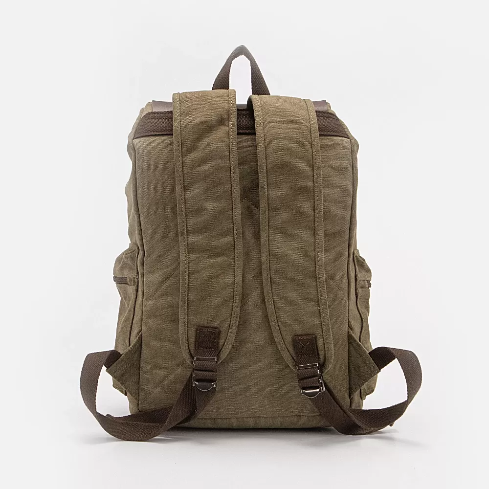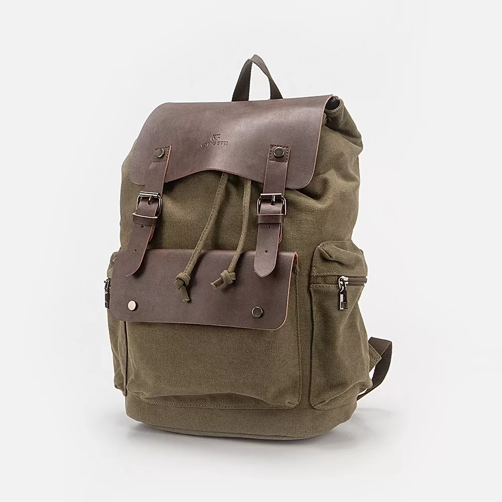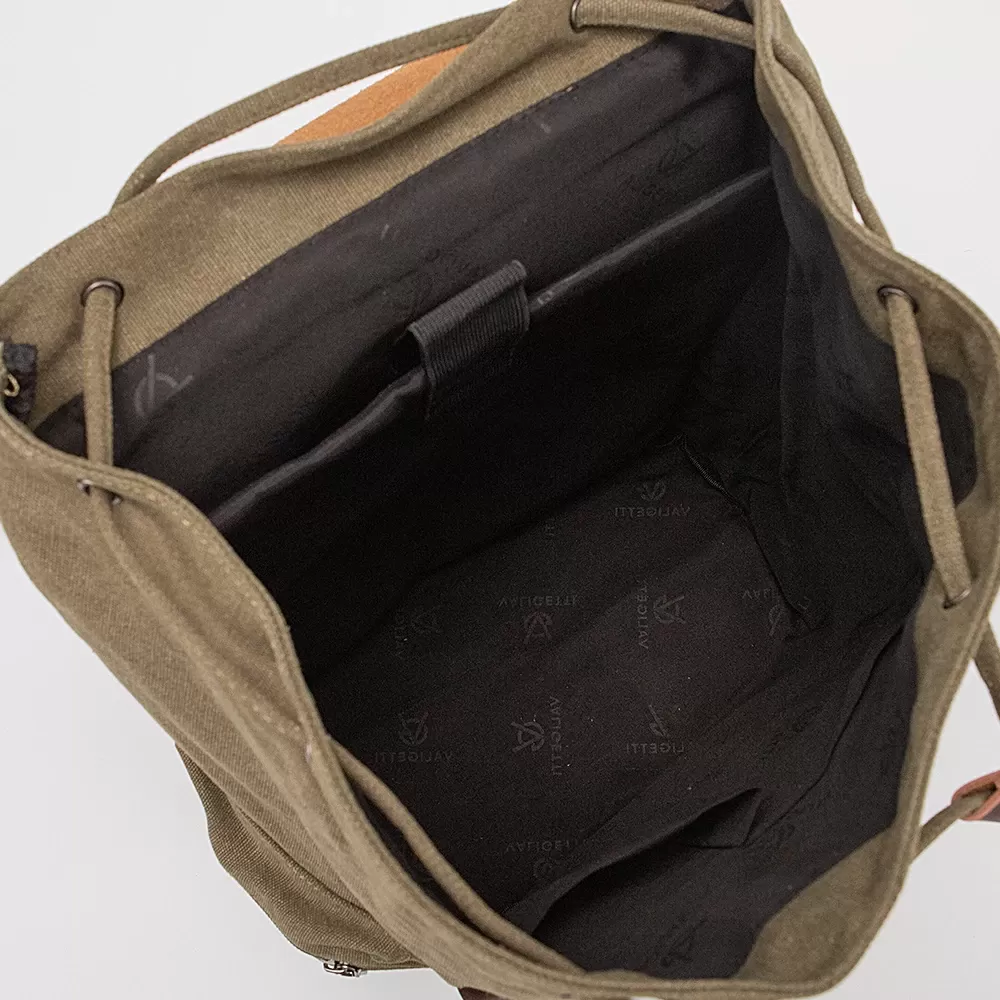 Рюкзак закрывается при помощи кожаного клапана на двух магнитных кнопках, что делает его герметичным и надежным. Основное отделение затягивается шнурками со стоппером, что позволяет регулировать его объем.