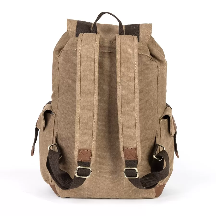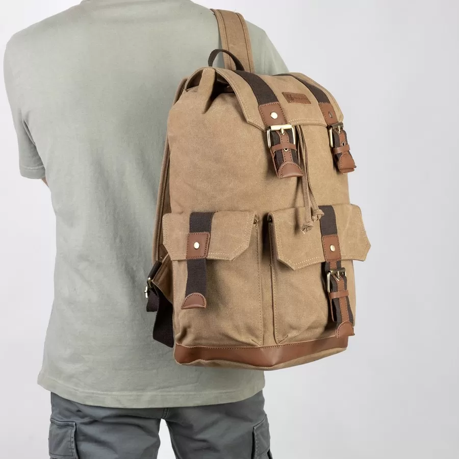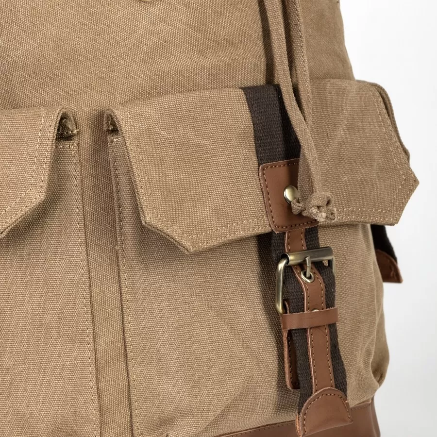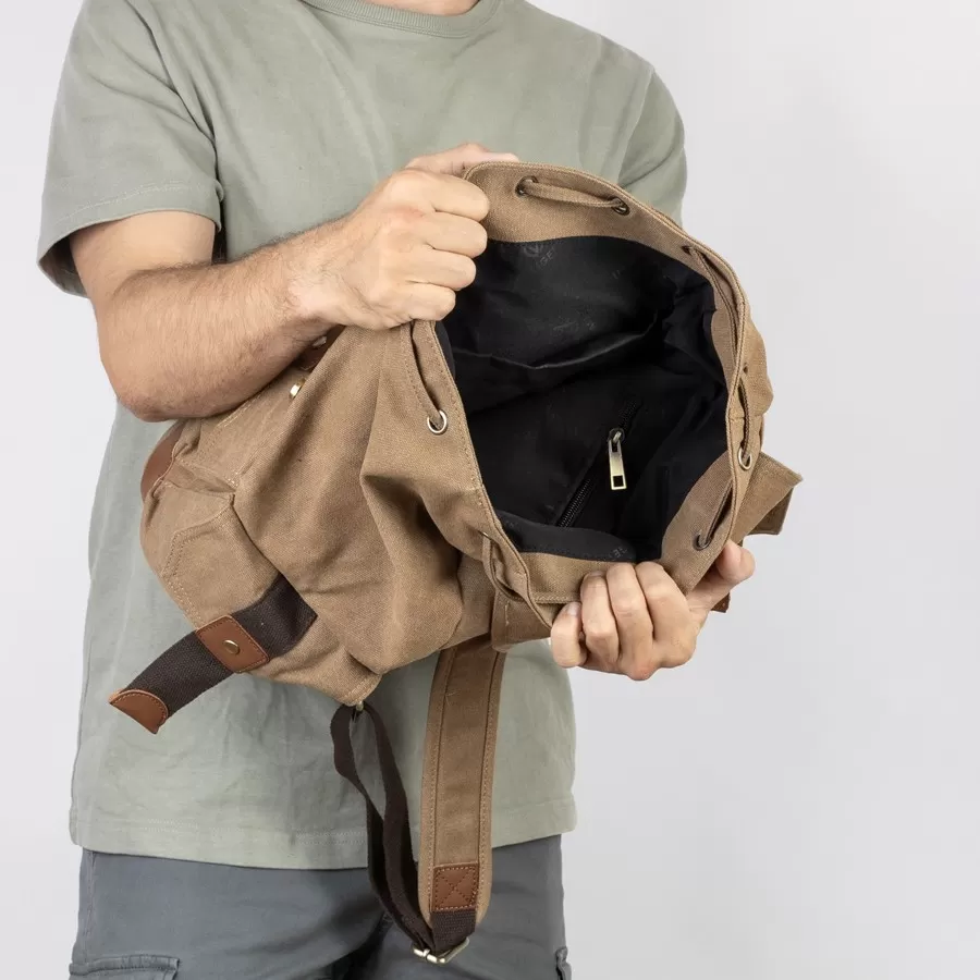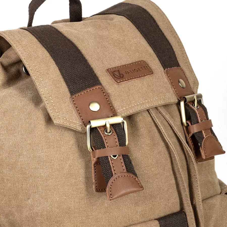 Рюкзак от торговой марки Valigetti выполнен из прочного текстильного материала цвета хаки. Модель с лямкой для переноски и регулируемыми плечевыми ремнями. Отделение закрывается клапаном на магнитных кнопках и стягивается шнуром. Внутри: текстильная подкладка. На лицевой стороне и по бокам - накладной карман с клапаном, декорированный пряжкой.