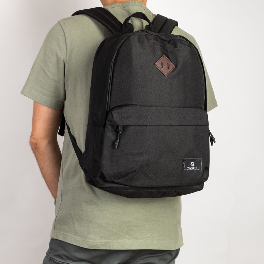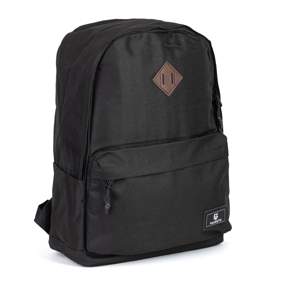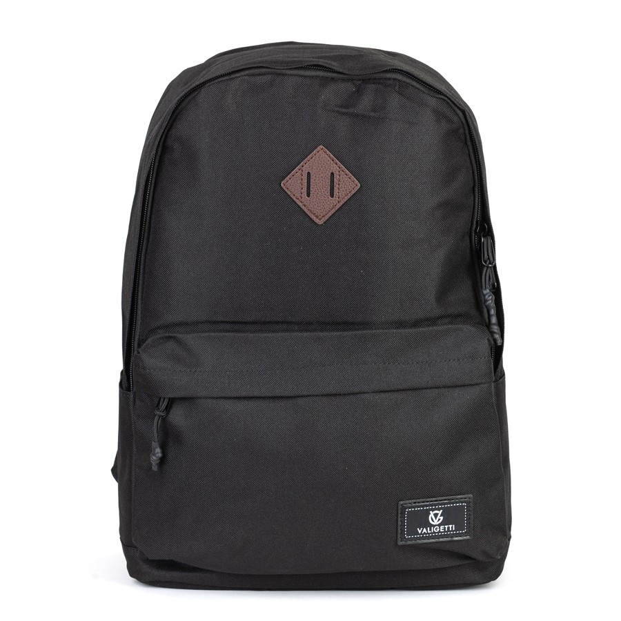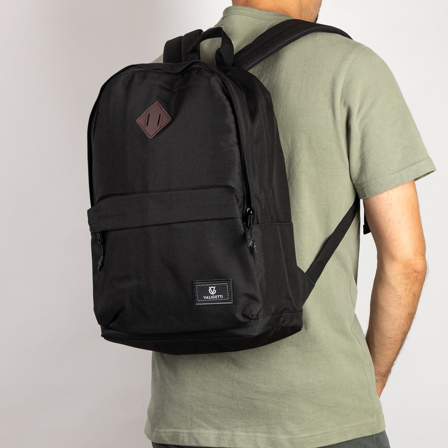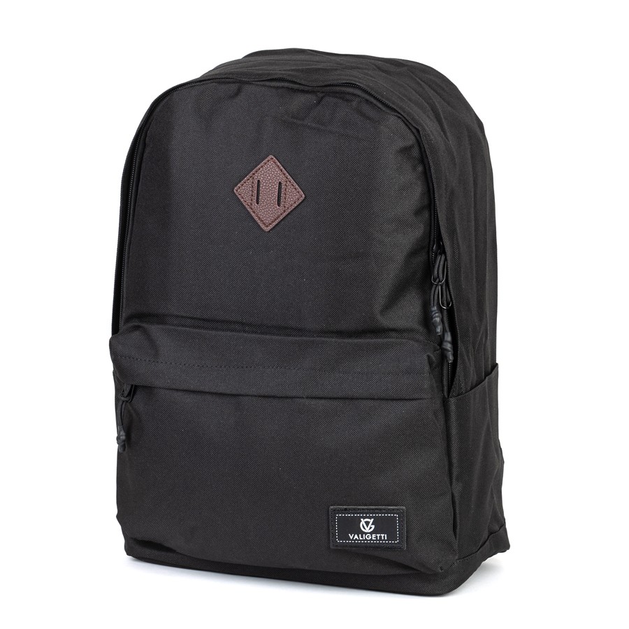 Рюкзак от торговой марки Valigetti из текстильного материала черного цвета. Модель с лямкой-переноской и широкими плотными регулируемыми плечевыми лямками. Отделение на молнии. Внутри: текстильная подкладка, два накладных кармана, один из которых с уплотненной стенкой для гаджета. На лицевой стороне – один карман на молнии. По бокам – накладной карман.