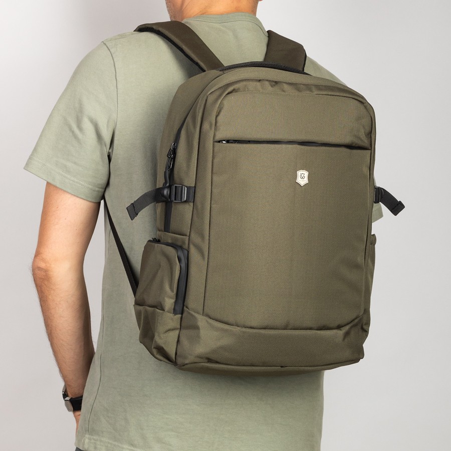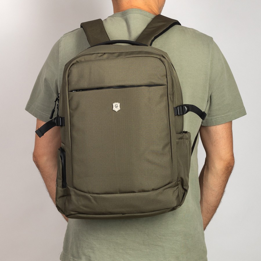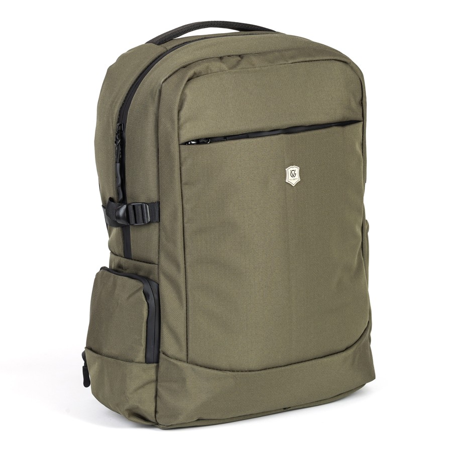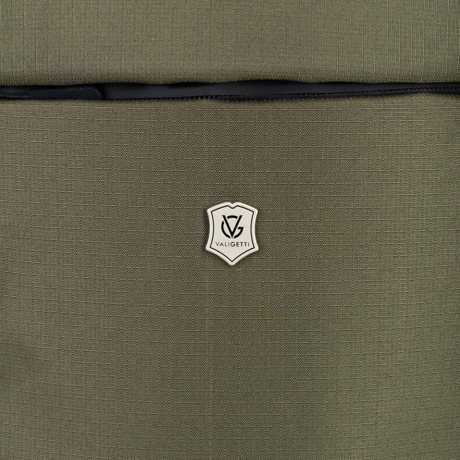 Рюкзак от торговой марки Valigetti из практичного текстильного материала цвета хаки. Модель с одной ручкой, уплотненными регулируемыми плечевыми лямками. Отделение на молнии с двумя встречными бегунками. Внутри: фирменная подкладка, карман на молнии, карман с уплотненной стенкой. На лицевой стороне – карман на молнии. На задней стороне лямка для одевания на ручку чемодана.