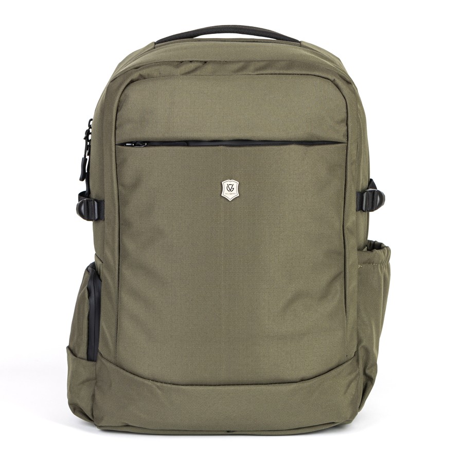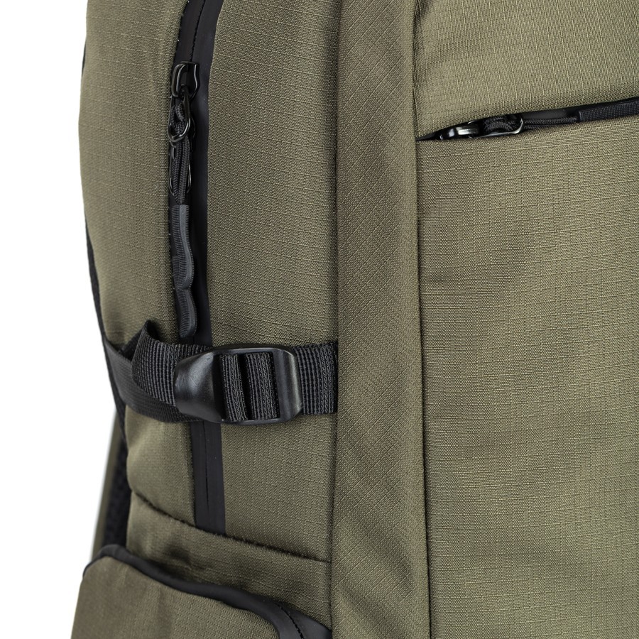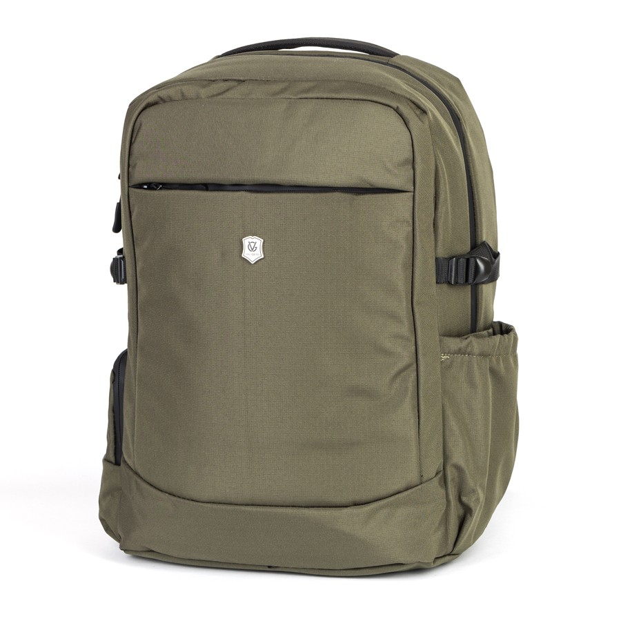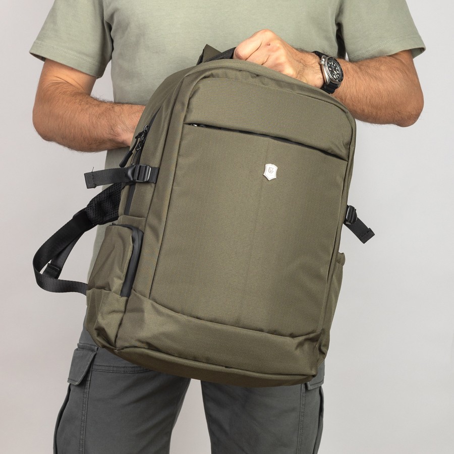 Рюкзак от торговой марки Valigetti из практичного текстильного материала цвета хаки. Модель с одной ручкой, уплотненными регулируемыми плечевыми лямками. Отделение на молнии с двумя встречными бегунками. Внутри: фирменная подкладка, карман на молнии, карман с уплотненной стенкой. На лицевой стороне – карман на молнии. На задней стороне лямка для одевания на ручку чемодана.