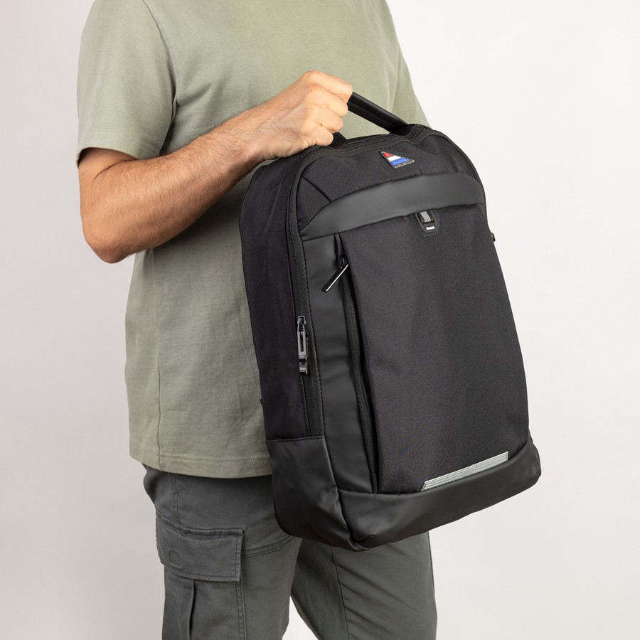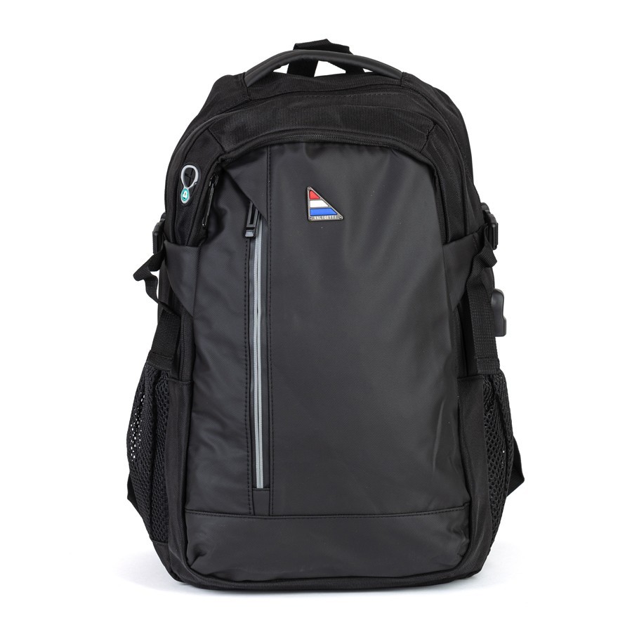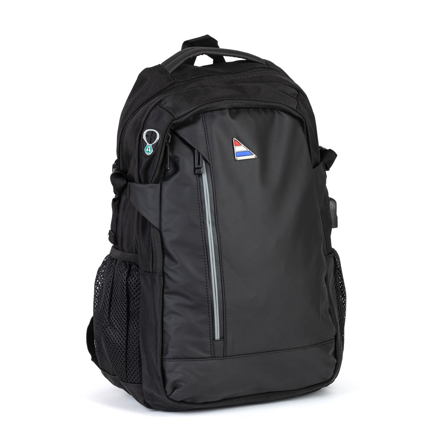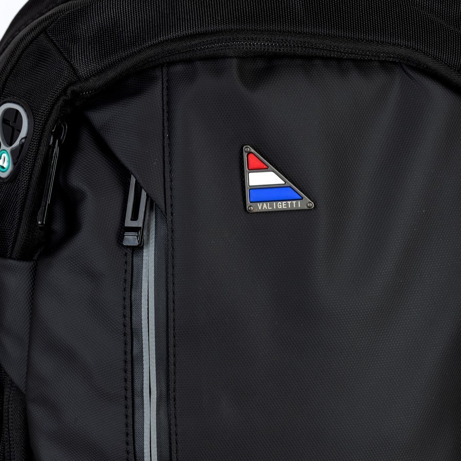 Рюкзак от торговой марки Valigetti из прочного практичного текстильного материала черного цвета. Модель с лямкой-переноской, регулируемыми плечевыми лямками. Одно отделение на молнии, с текстильной подкладкой. В основном отделении: накладной карман с уплотненной стенкой и два накладных маленьких кармана. На лицевой стороне – два кармана на молнии. По бокам – карман-сетка. Спинка с дышащим сетчатым верхним слоем и карманом на молнии. Есть лямка для транспортировки на ручки чемодана.
