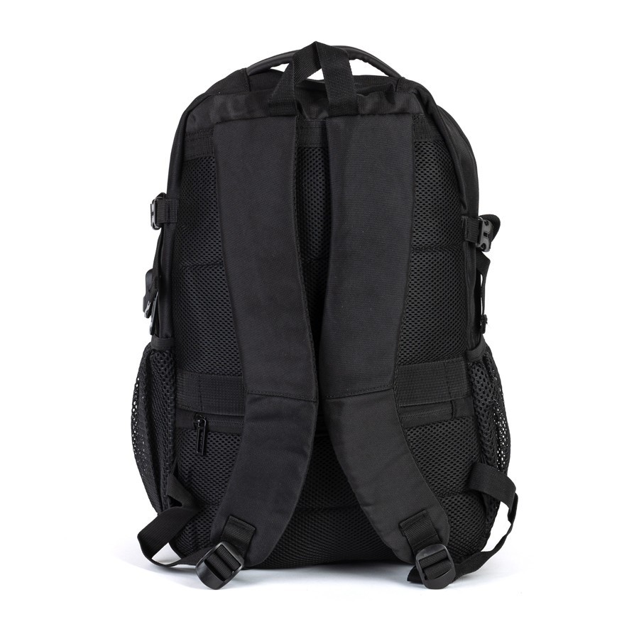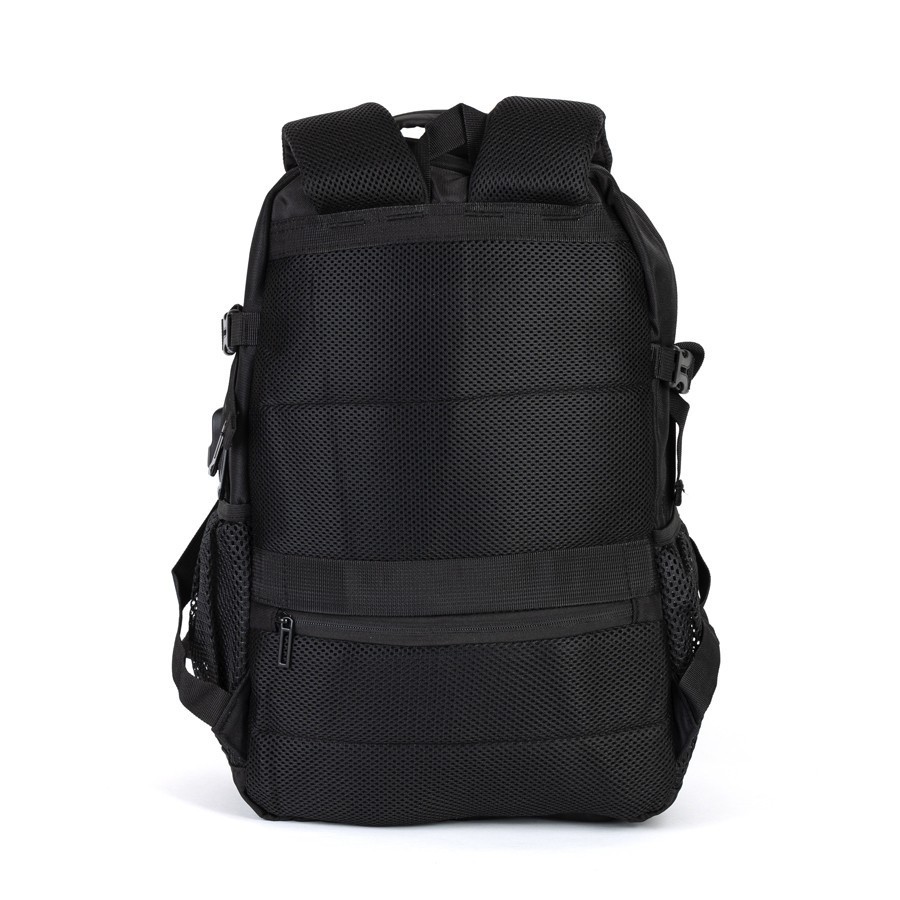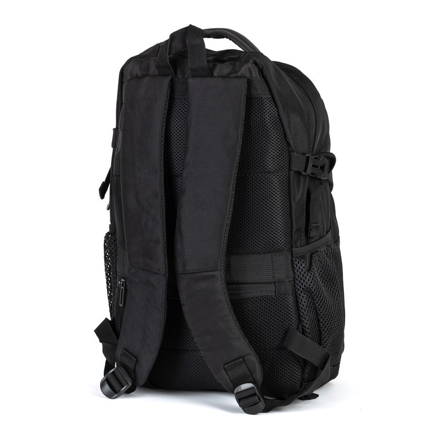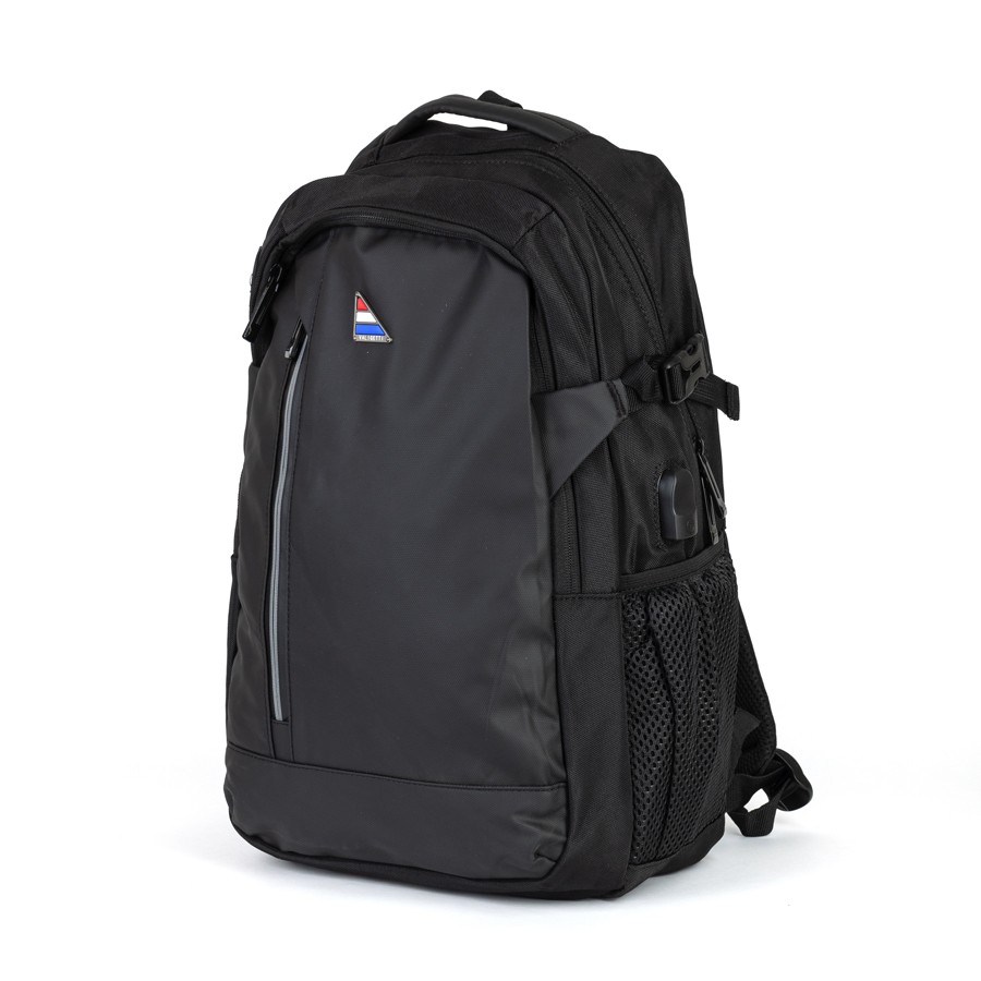Рюкзак от торговой марки Valigetti из прочного практичного текстильного материала черного цвета. Модель с лямкой-переноской, регулируемыми плечевыми лямками. Одно отделение на молнии, с текстильной подкладкой. В основном отделении: накладной карман с уплотненной стенкой и два накладных маленьких кармана. На лицевой стороне – два кармана на молнии. По бокам – карман-сетка. Спинка с дышащим сетчатым верхним слоем и карманом на молнии. Есть лямка для транспортировки на ручки чемодана.