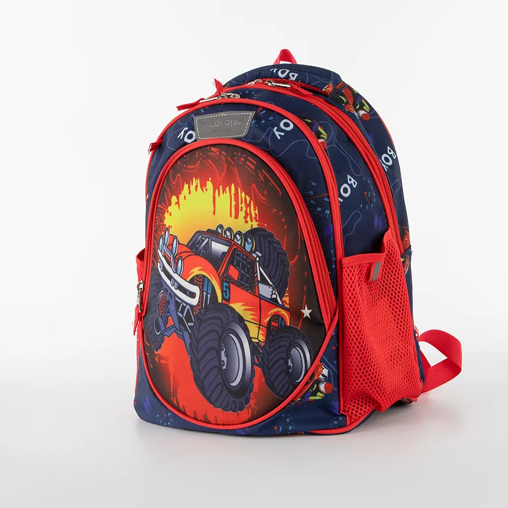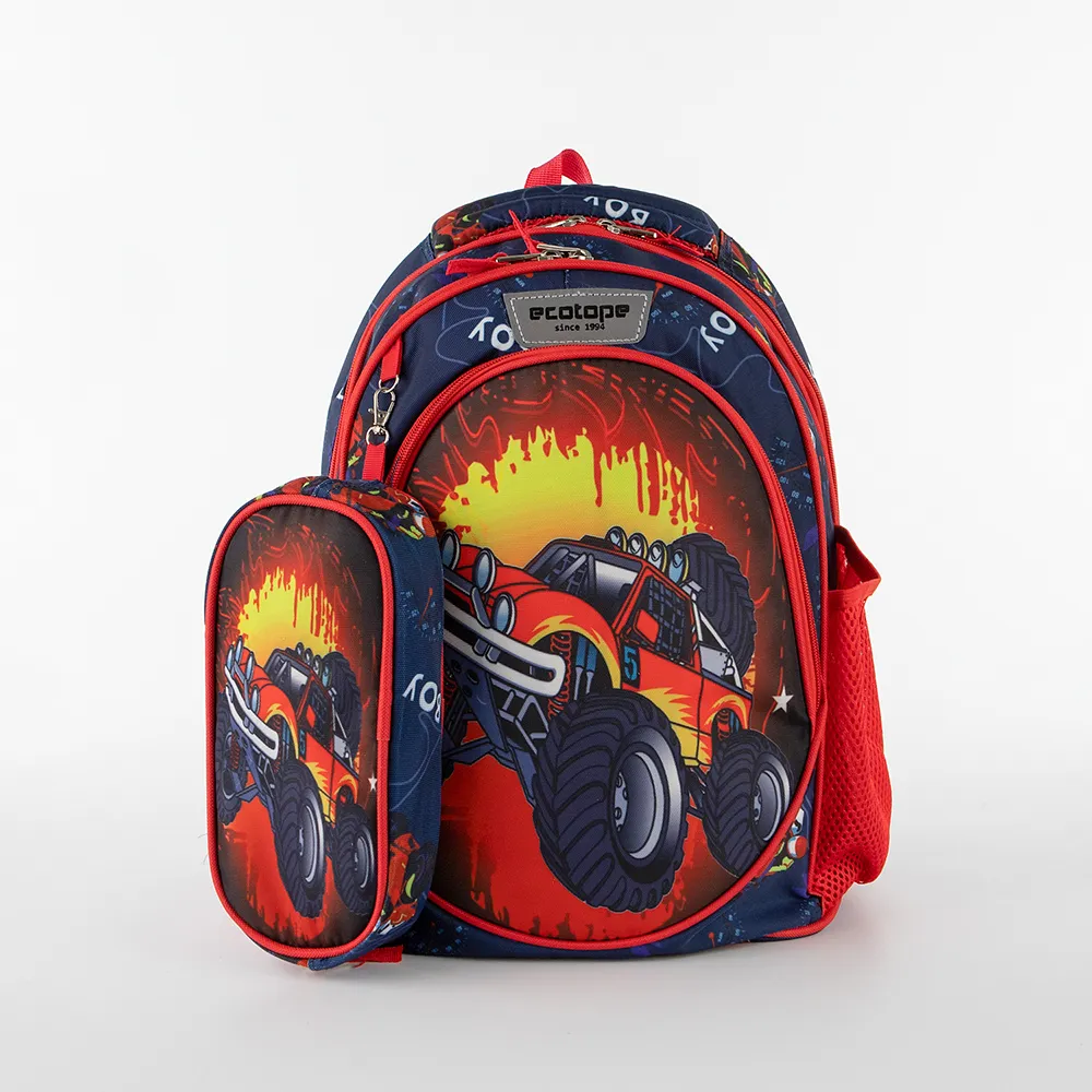 Рюкзак от торговой марки Ecotope из текстильного материала. Декорирован оригинальным принтом с изображением внедорожника. Модель с лямкой-переноской, ручкой и регулируемыми плечевыми лямками. Два отделения на молнии, с текстильной подкладкой. В основном отделении – накладной карман. На лицевой стороне – карман на молнии. По бокам – карман-сетка на резинке. Уплотненная спинка с дышащей накладкой. В комплекте имеется пенал, который крепится карабином к кольцу на лицевой стороне рюкзака; пенал с отделением на молнии и текстильной подкладкой.