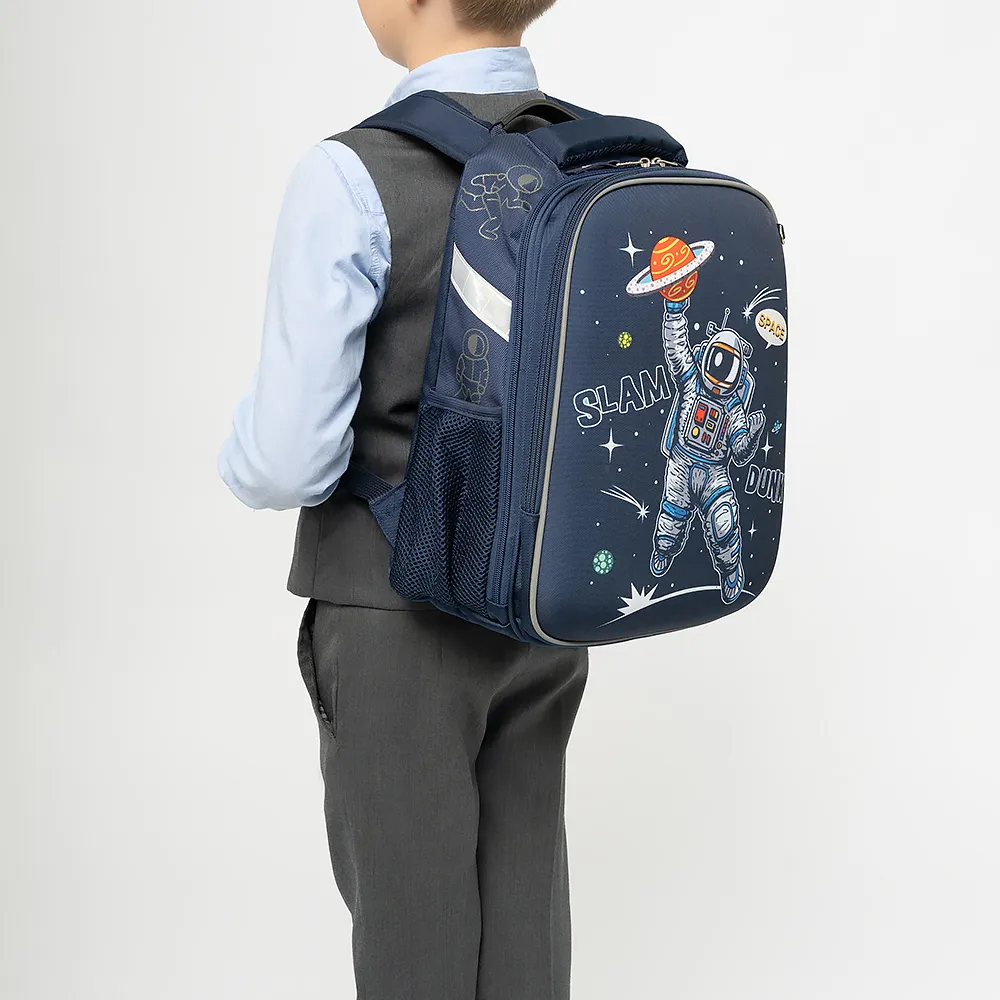 Ранец от торговой марки Ecotope из плотного текстильного материала. Декорирован рисунком с изображением космонавта со светоотражающими элементами. Модель с лямкой-переноской с пластиковой накладкой, мягкой набивной ручкой, регулируемыми плечевыми лямками с более износостойкой конструкцией в форме майки со светоотражателями, повышающими безопасность в темное время. Ортопедическая спинка с анатомическими вставками с верхним дышащим слоем. Два отделения на молнии, с текстильной подкладкой. В основном отделении – накладной карман и фиксирующая резинка. По бокам – карман-сетка. На лицевой стороне – кольцо для крепления брелока.