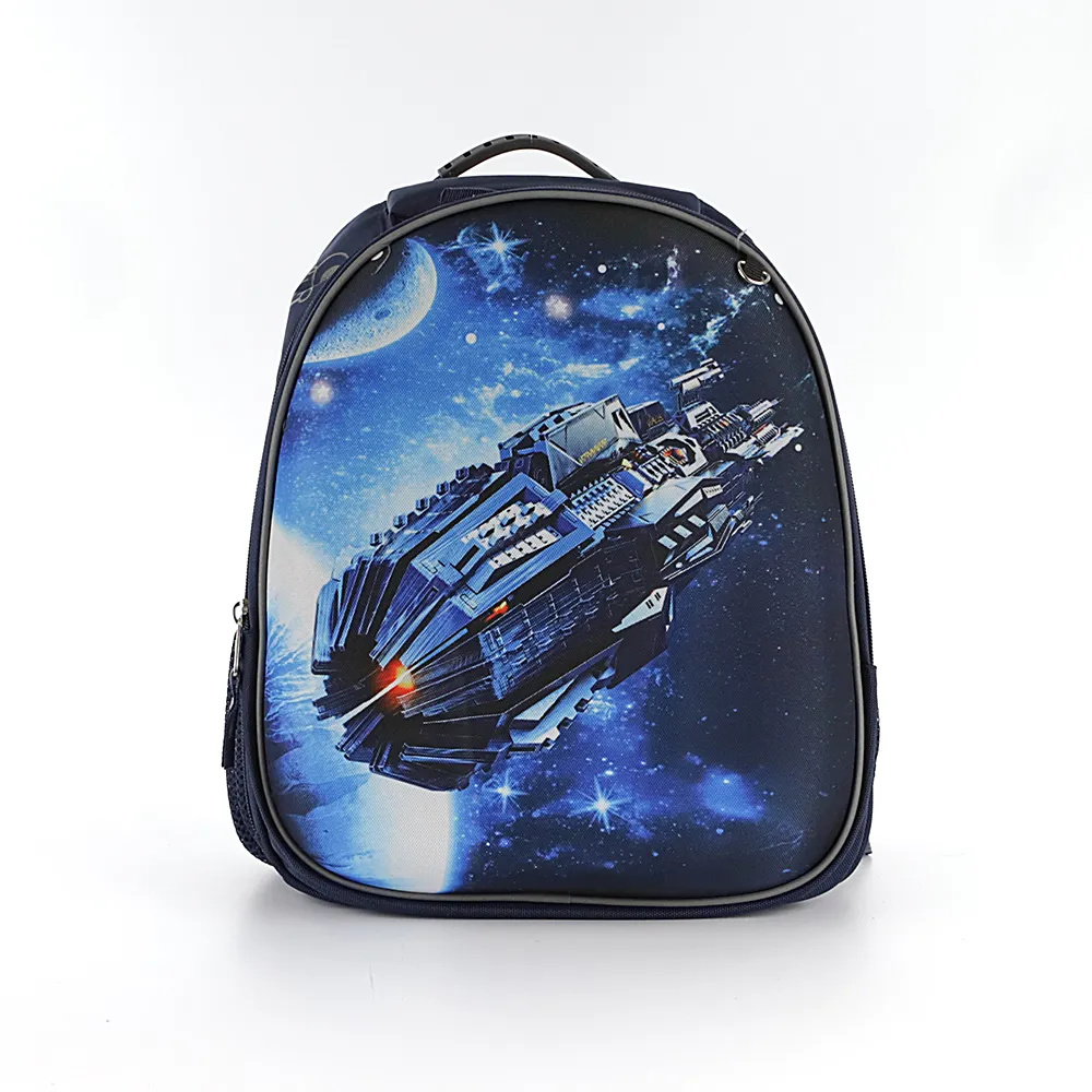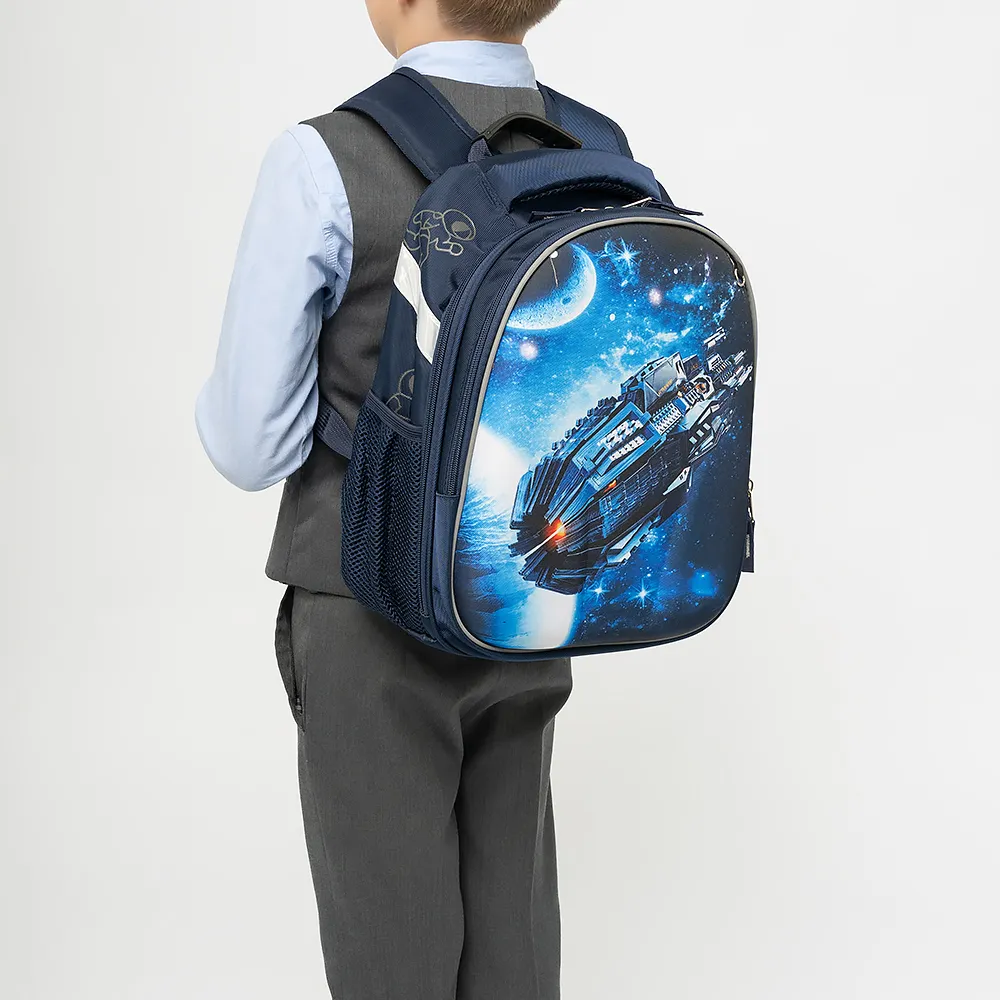 Ранец от торговой марки Ecotope из плотного текстильного материала. Декорирован рисунком с изображением космического корабля и космонавтами по бокам со светоотражающим эффектом. Модель с лямкой-переноской с пластиковой накладкой, мягкой набивной ручкой, регулируемыми плечевыми лямками с более износостойкой конструкцией в форме майки со светоотражателями, повышающими безопасность в темное время. Ортопедическая спинка с анатомическими вставками с верхним дышащим слоем. Два отделения на молнии, с текстильной подкладкой. В основном отделении – накладной карман и фиксирующая резинка. По бокам – карман-сетка. На лицевой стороне – кольцо для крепления брелока.