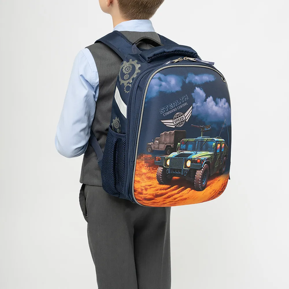 Ранец от торговой марки Ecotope из плотного текстильного материала. Декорирован рисунком в военной тематике с изображением бронемашины с радиолокатором. Модель с лямкой-переноской с пластиковой накладкой, мягкой набивной ручкой, регулируемыми плечевыми лямками с более износостойкой конструкцией в форме майки со светоотражателями, повышающими безопасность в темное время. Ортопедическая спинка с анатомическими вставками с верхним дышащим слоем. Два отделения на молнии, с текстильной подкладкой. В основном отделении – накладной карман и фиксирующая резинка. По бокам – карман-сетка. На лицевой стороне – кольцо для крепления брелока.