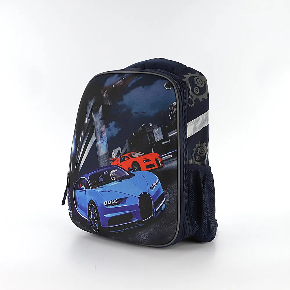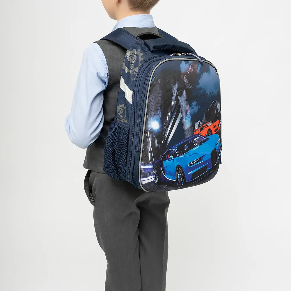 Ранец от торговой марки Ecotope из плотного текстильного материала темно-синего цвета. Формованная панель декорирована принтом с изображением автомобилей. Модель с лямкой с прорезиненной накладкой, плотной ручкой и регулируемыми лямками прочной конструкции в виде майки со светоотражателями, повышающими безопасность в темное время. Ортопедическая спинка с анатомическими вставками с верхним дышащим слоем. Два отделения на молнии с текстильной подкладкой. Основное отделение со встречными бегунками широко раскрывается благодаря вытачкам и молнии по трем сторонам. Внутри: накладной карман с уплотненной стенкой и фиксирующая лямка-резинка. По бокам – карман-сетка на резинке, светоотражатели. На лицевой стороне – кольцо для крепления брелока. Дно оснащено прорезиненными накладками для защиты от износа.