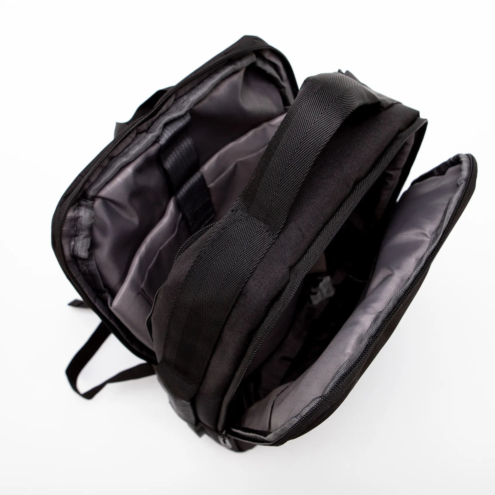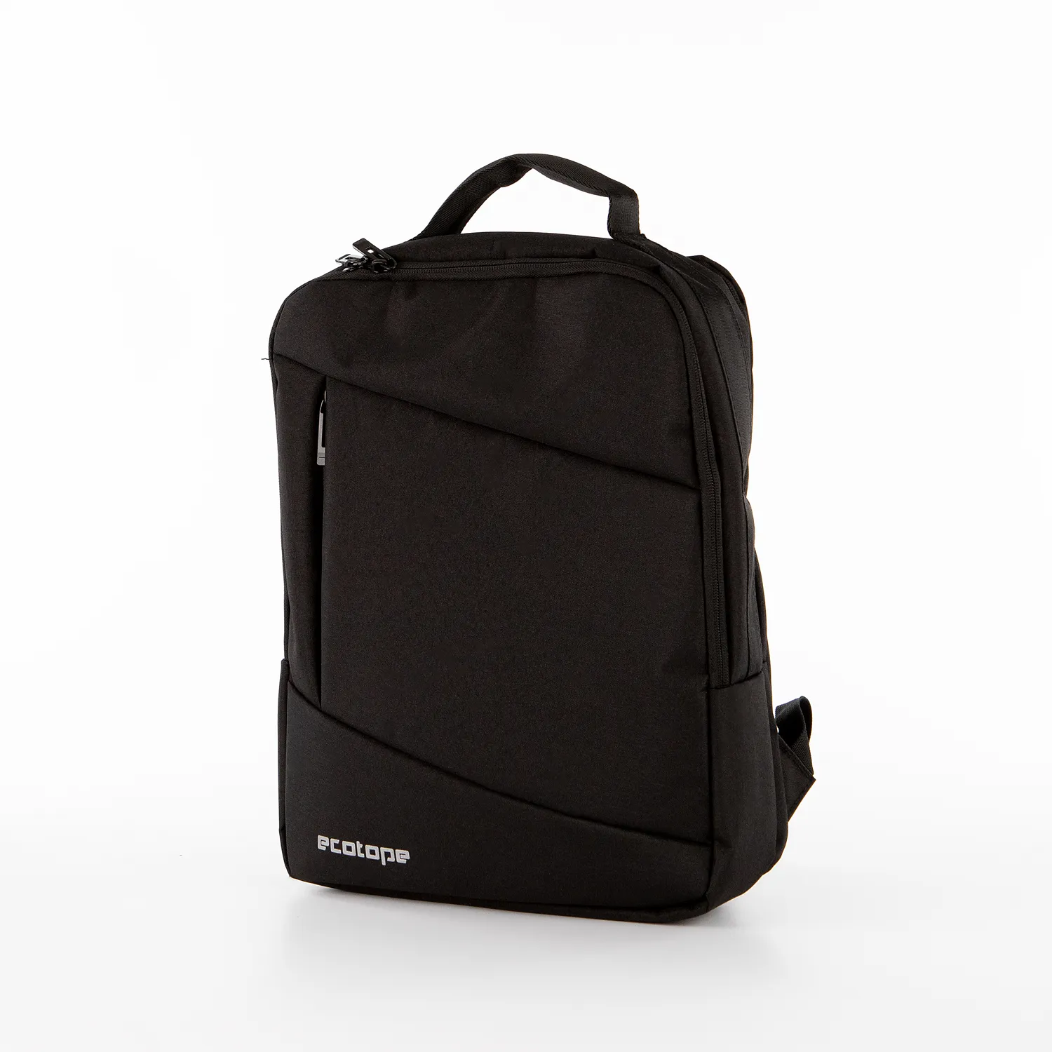 Сумка-рюкзак от торговой марки Ecotope из прочного текстильного материала черного цвета. Модель с двумя ручками сверху и сбоку, лямкой-переноской, регулируемыми плечевыми лямками. Два отделения на молнии, с текстильной подкладкой. В переднем – перекрестные ремни для фиксации багажа, органайзер из накладных карманов. В заднем отделении – уплотненный накладной карман для ноутбука и планшета. На лицевой стороне – карман на молнии. На спинке с верхним дышащим сетчатым слоем – лямка для крепления на выдвижную ручку чемодана.
