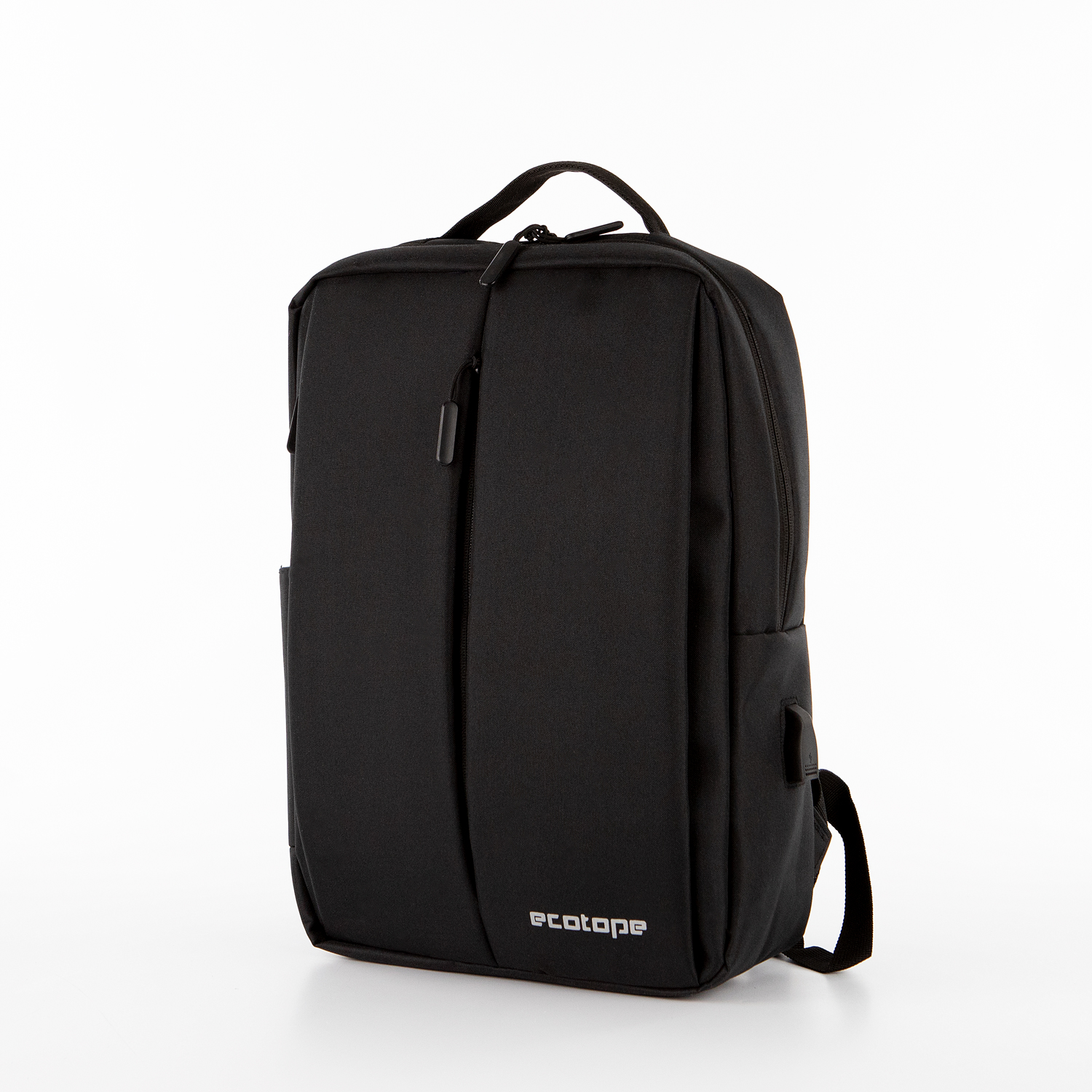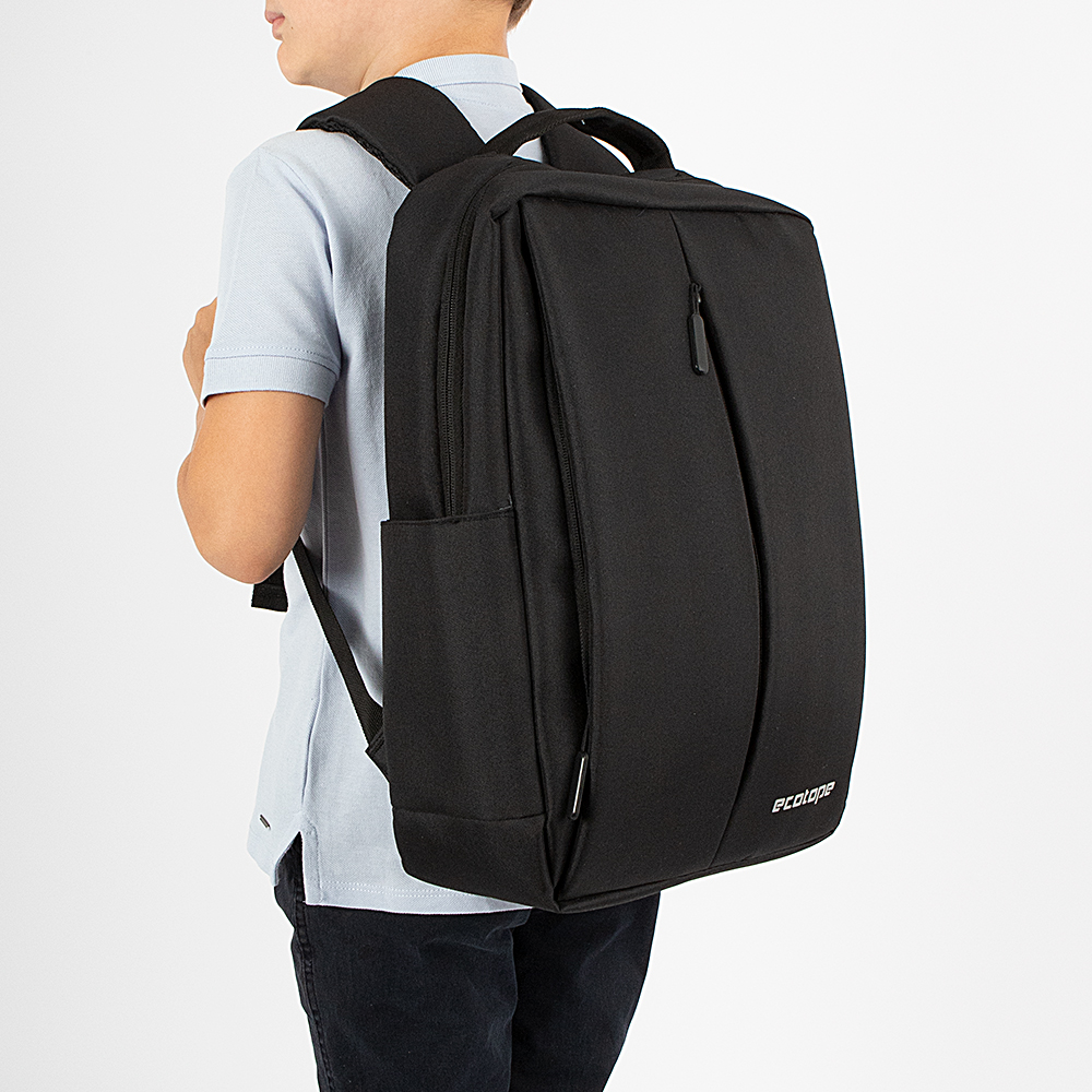 Рюкзак от торговой марки Ecotope из прочного текстильного материала черного цвета. Модель с лямкой-переноской, ручкой и регулируемыми плечевыми лямками. Отделение на молнии, с текстильной подкладкой. Внутри: карман с уплотненной стенкой для ноутбука, органайзер из накладных карманов, отверстие к USB-выходу, расположенному снаружи сбоку. На лицевой стороне – вертикальный карман на молнии. Сбоку с одной стороны – накладной карман без застежки. На спинке имеется лямка для крепления на выдвижную ручку чемодана.