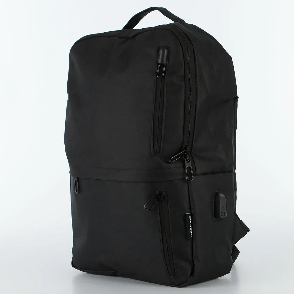 Рюкзак от торговой марки Ecotope из текстильного материала черного цвета. Модель с одной ручкой, лямкой-переноской, широкими регулируемыми плечевыми лямками с дышащим сетчатым верхним слоем. Отделение на молнии. Внутри: текстильная подкладка, накладной карман с уплотненной стенкой для ноутбука. На лицевой стороне – три кармана на молнии. По бокам – карман без застежки, встроенный USB-порт обеспечивает удобное соединение для подзарядки аккумуляторов мобильных устройств от внешнего источника питания.