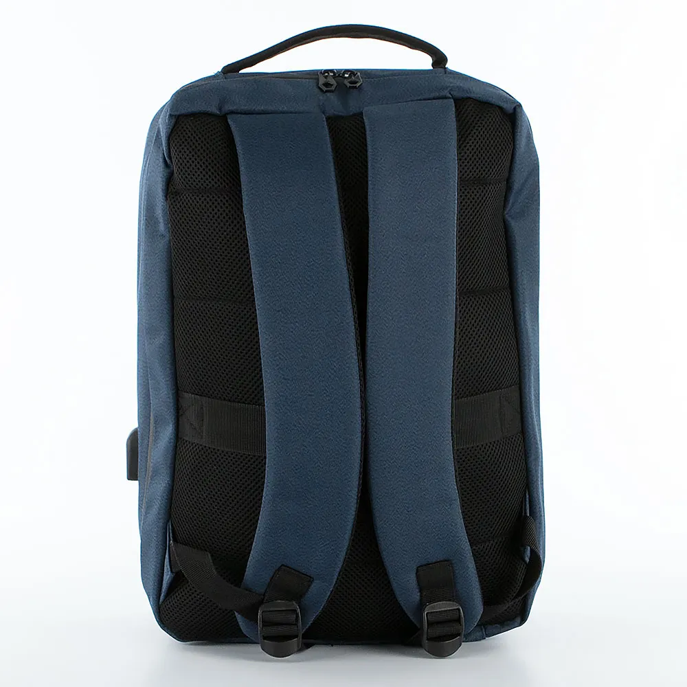 Рюкзак от торговой марки Ecotope из практичного текстильного материала синего цвета с формованной лицевой панелью. Модель с мягкой набивной ручкой, широкими регулируемыми лямками. Уплотненная спинка с верхним дышащим сетчатым слоем и лямкой для крепления на выдвижную ручку чемодана. Отделение на молнии по трем сторонам раскрывается на 180°, что обеспечивает удобный доступ. Внутри: текстильная подкладка, накладной карман с уплотненной стенкой для ноутбука и планшета, карман-сетка. Сбоку имеется встроенный USB-порт, обеспечивающий удобное соединение для подзарядки аккумуляторов мобильных устройств от внешнего источника питания.
