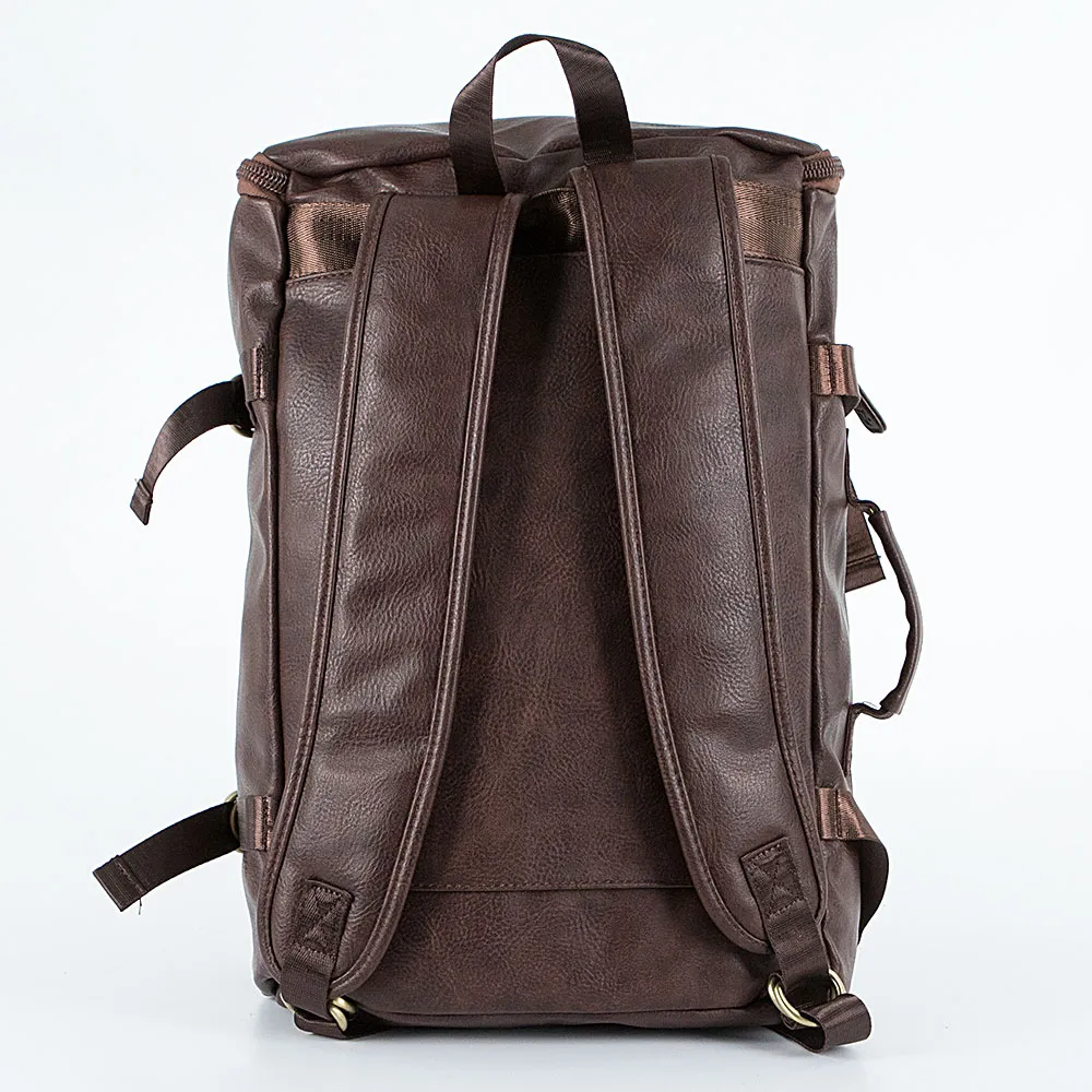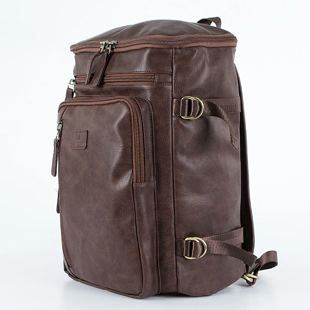 Сумка-рюкзак от торговой марки Valigetti из искусственной кожи коричневого цвета. Модель вертикальной и горизонтальной ориентации с одной ручкой, лямкой-переноской, съемным регулируемым плечевым ремнем длиной до 102 см, регулируемыми плечевыми лямками, которые можно спрятать за широкой лямкой на спинке. Два входа в отделение на молнии – в двух положениях. Внутри: фирменная подкладка, карман на молнии, накладной карман с уплотненной стенкой для ноутбука, два накладных кармана. На лицевой стороне – три кармана на молнии. По бокам имеются стягивающие ремни.