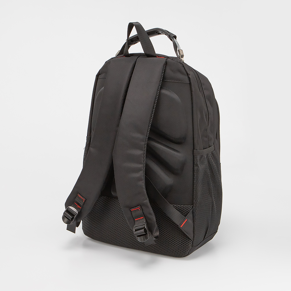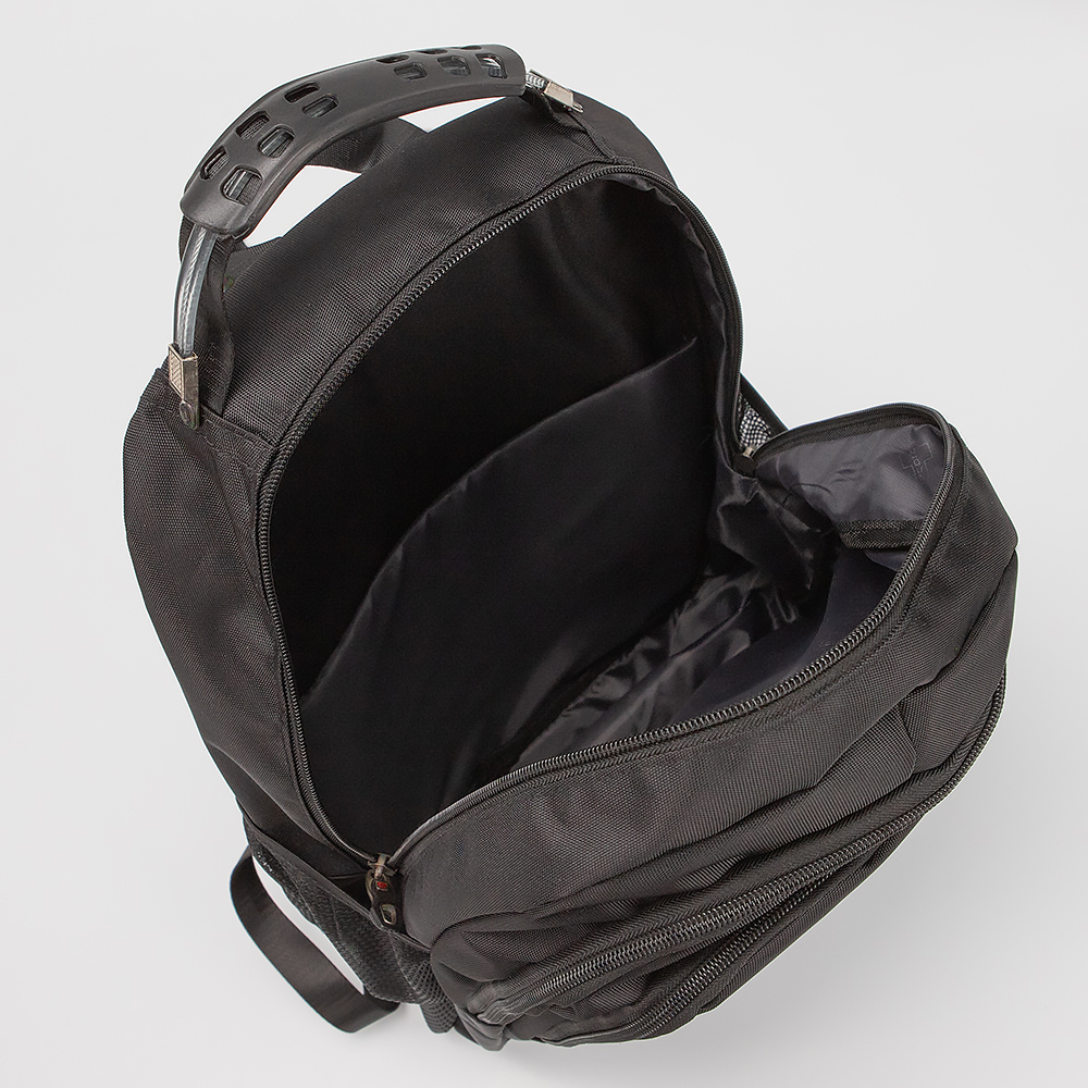 Рюкзак от торговой марки Ecotope из практичного плотного текстильного материала черного цвета. Модель с лямкой-переноской, ручкой с металлическим тросом и прорезиненной накладкой и широкими регулируемыми плечевыми лямками. Три отделения на молнии, с текстильной подкладкой. В основном отделении – накладной карман с уплотненной стенкой; имеется кодовый замок. На лицевой стороне – карман на молнии. По бокам – карман-сетка; имеется USB-порт и выход для наушников. Удобная спинка с анатомическими вспененными вставками и нижней частью с верхним дышащим сетчатым слоем.