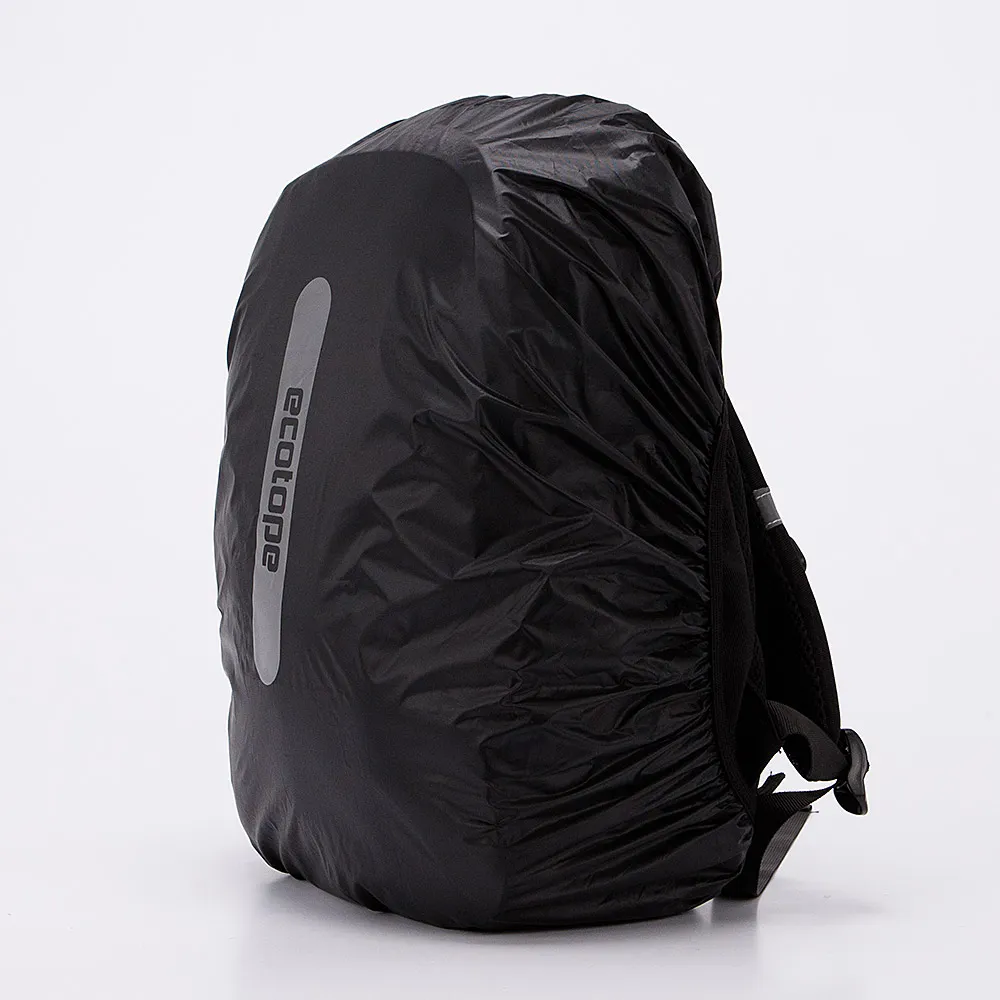 Чехол от торговой марки Ecotope из прочного практичного текстильного материала с полиуретановым покрытием, отражающим ультрафиолетовые лучи, что защищает от нагрева, а также обеспечивает водонепроницаемость и ветрозащиту. Модель с эластичной фиксирующей резинкой по краям. На лицевой стороне – светоотражающий принт с названием бренда. Чехол надежно защитит рюкзак от загрязнений, влаги и солнечных лучей. Модель черного цвета; размер L.