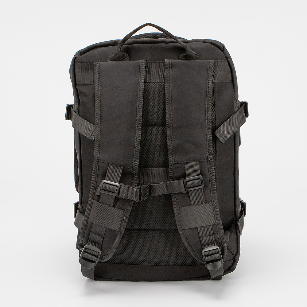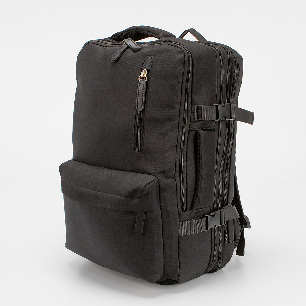 Рюкзак из текстильного материала черного цвета. Модель с лямкой и двумя ручками-переносками (сверху и сбоку), широкими регулируемыми плечевыми лямками с дышащим сетчатым верхним слоем и фиксирующим ремнем с застежкой. Отделение на молнии. Внутри: текстильная подкладка, накладной карман. На лицевой стороне - два кармана на молнии. По бокам имеются дополнительные ремни для фиксации с застежками фастекс, а так же встроенный USB-порт, обеспечивающий удобное соединение для подзарядки аккумуляторов мобильных устройств от внешнего источника питания.