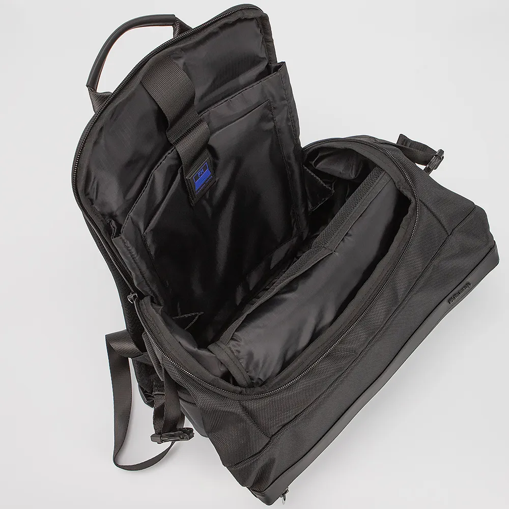 Рюкзак от торговой марки Francesco Molinary выполнен из плотного практичного текстильного материала черного цвета. Модель с ручкой и регулируемыми плечевыми ремнями. Основное отделение на молнии, дополнительно фиксируется ремнями на застежке фастекс. Второе отделение на молнии, раскрывается по трем сторонам. Внутри: текстильная подкладка, карман с уплотненной стенкой для ноутбука, накладные карманы. С лицевой стороны - карман на молнии. По бокам - карман без застежки. На задней стороне - вертикальная лямка для крепления на выдвижную ручку чемодана.
