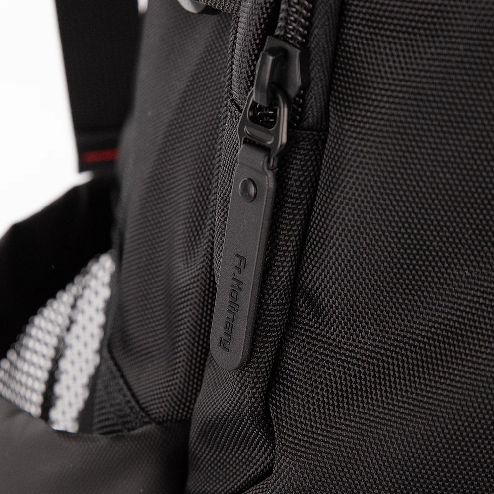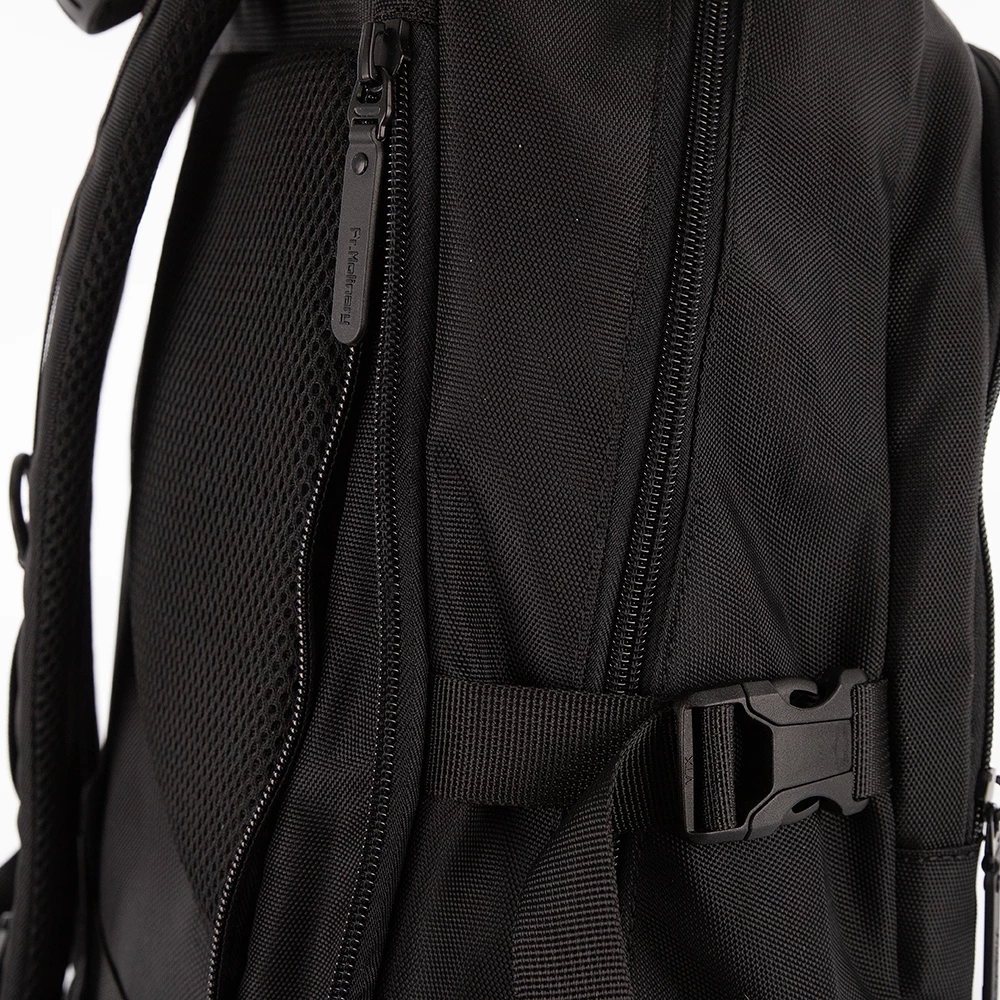 Функциональный рюкзак от бренда Francesco Molinary из прочного износостойкого текстильного материала черного цвета. Модель большого размера с лямкой-переноской с прорезиненной накладкой, плотными широкими регулируемыми плечевыми лямками с ремнями для крепления и нагрудным фиксатором для распределения нагрузки. Спинка с дышащими вставками; имеется лямка для крепления на выдвижную ручку чемодана. Глубокое отделение на молнии. Внутри: фирменная подкладка, накладной карман с уплотненной стенкой для ноутбука, USB-кабель для внешнего портативного аккумулятора Power Bank, при подключении которого можно подзаряжать гаджеты через USB-порт, расположенный снаружи сбоку. По бокам – стягивающие ремни, карман-сетка на резинке. На лицевой стороне – два накладных кармана, вместительное отделение с органайзером для канцелярских принадлежностей; снизу карман на молнии, представляющий собой непромокаемое вентилируемое отделение для обуви (снаружи на нем имеется лямка для крепления). На задней стороне – раздвижка на молнии для увеличения объема. Рюкзак идеален для поездок и путешествий.