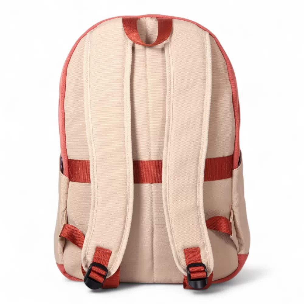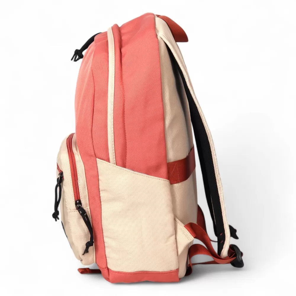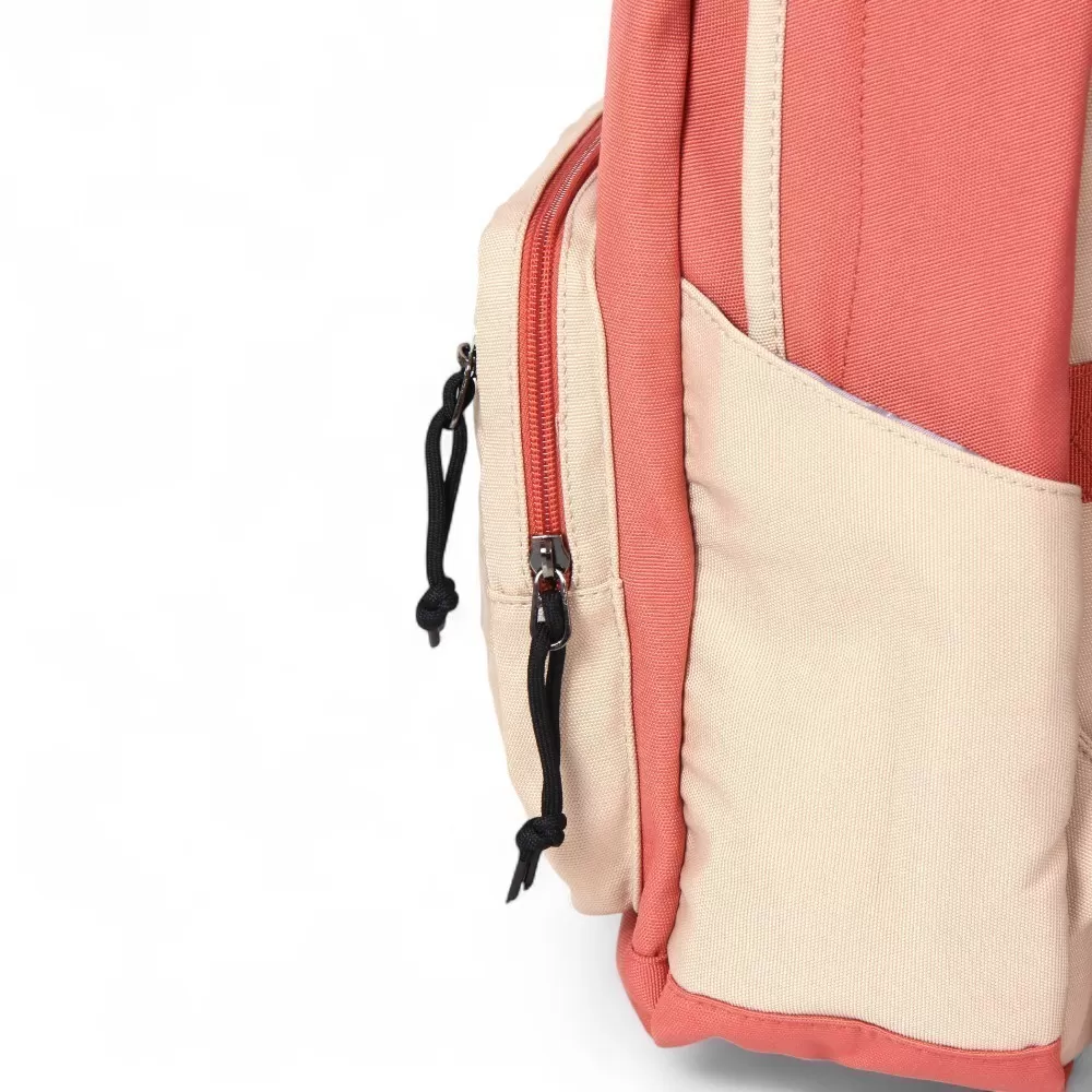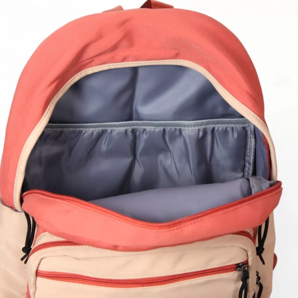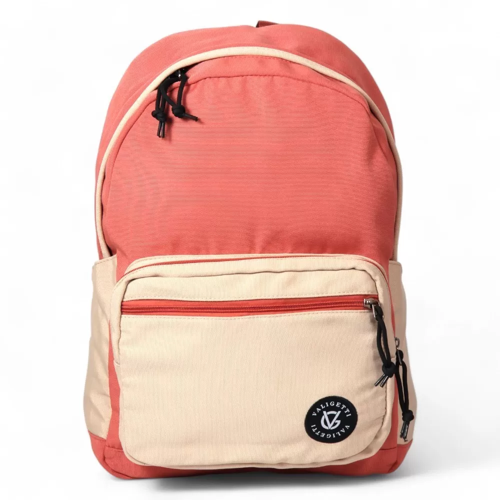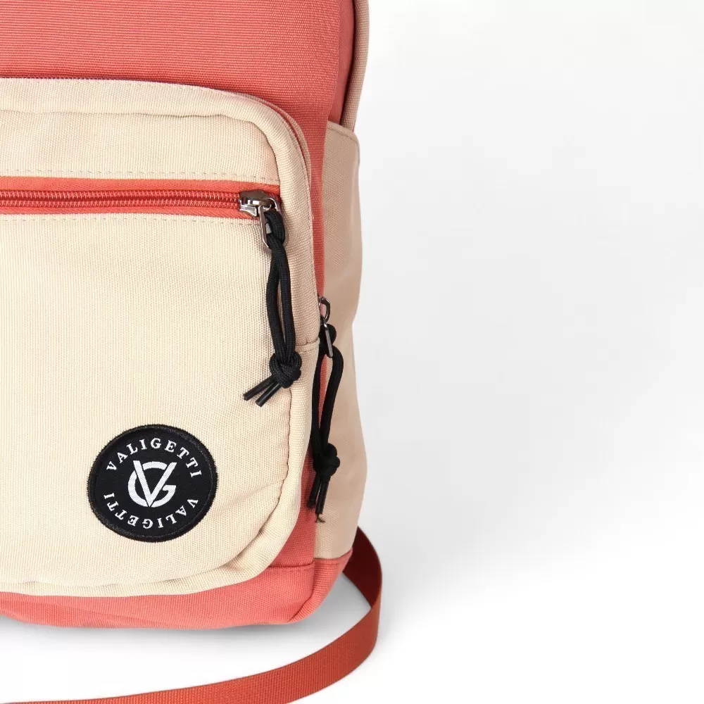 Рюкзак от бренда Valigetti из текстильного материала в персиковый с бежевым цвета. Модель с лямкой-переноской и широкими плотными регулируемыми плечевыми лямками. Отделение на молнии. Внутри: текстильная подкладка, один накладной карман для гаджета. На лицевой стороне – два накладных кармана на молнии. На спинке – лямка для крепления на выдвижную ручку чемодана. По бокам – накладной карман.