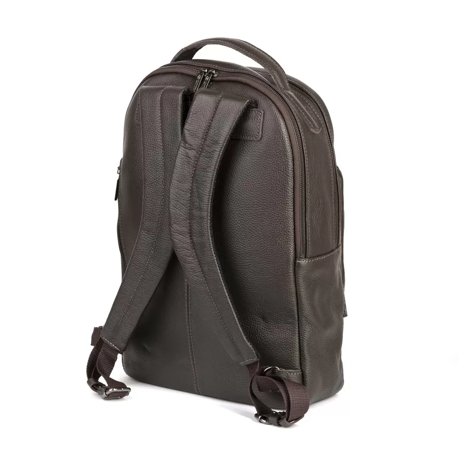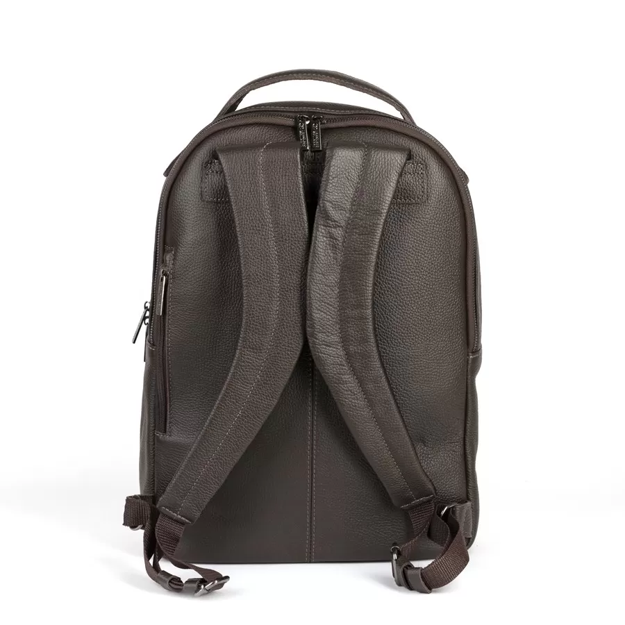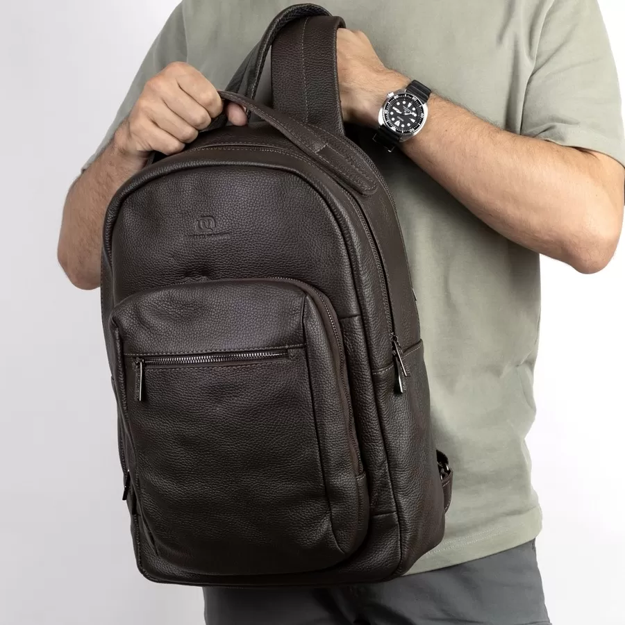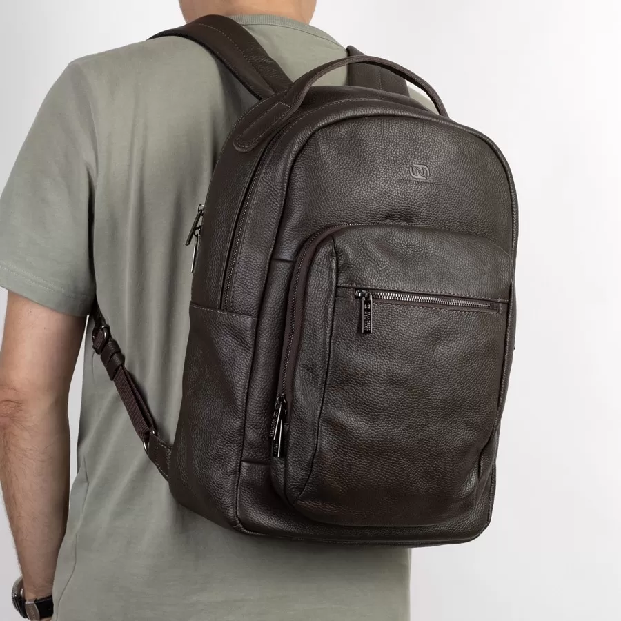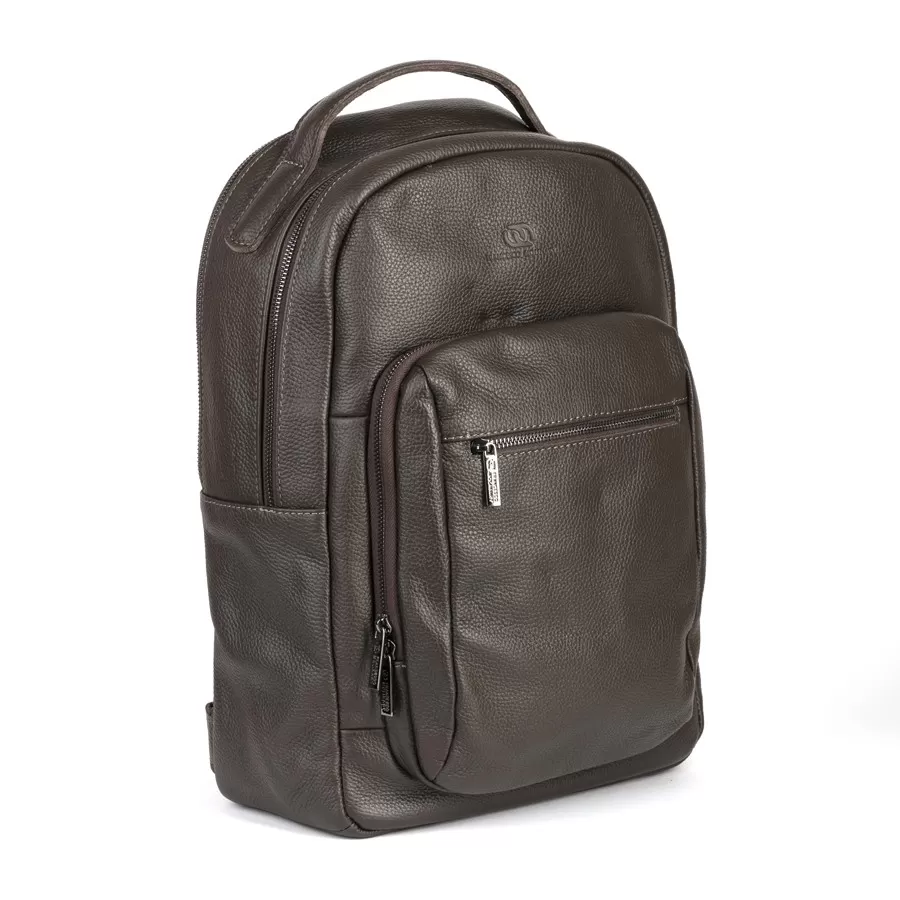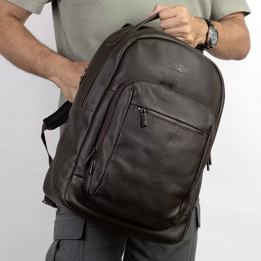 Вместительный мужской рюкзак Francesco Molinary темно-коричневого цвета из натуральной кожи с естественной фактурой. Внутри фирменная подкладка, все карманы и отделения на металлических молниях. Основное отделение с двумя отсеками. Отделение под ноутбук с двумя отсеками и потайным карманом на молнии. Спереди малое отделение с 2мя отсеками и отдельный карман на молнии. Широкие крепкие кожаные лямки. Также есть отдельный плечевой карман