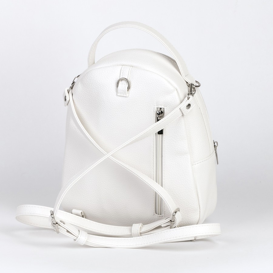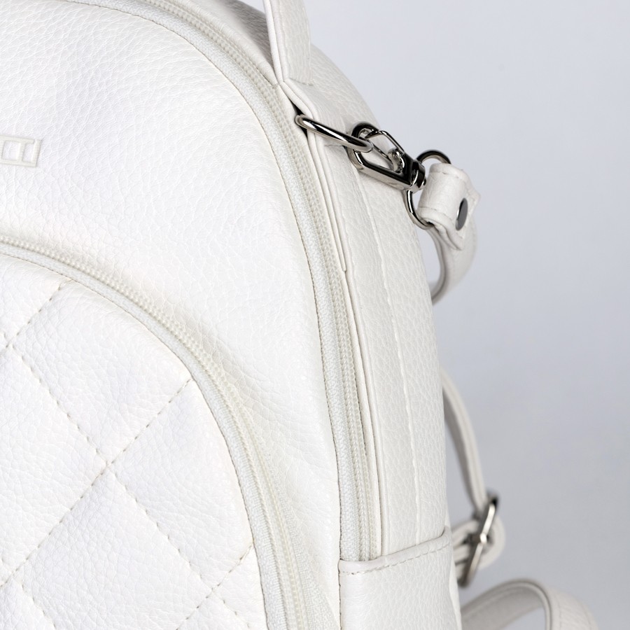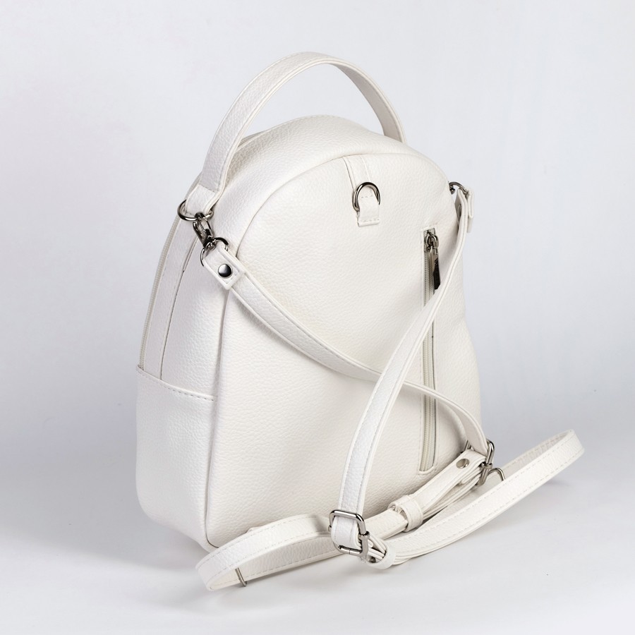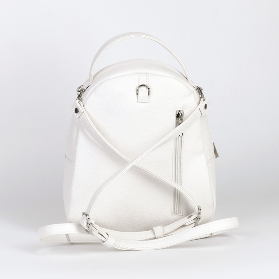 Стильный женский рюкзак из белой искусственной кожи с аккуратной стёжкой на фронтальном кармане. Форма — округлая сверху, с плавными линиями и минималистичным дизайном. Фурнитура выполнена в серебристом цвете, что подчёркивает современный и элегантный вид.