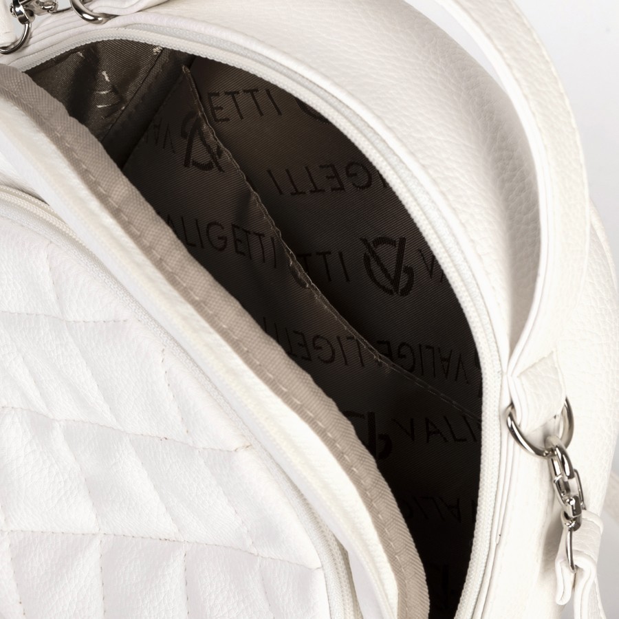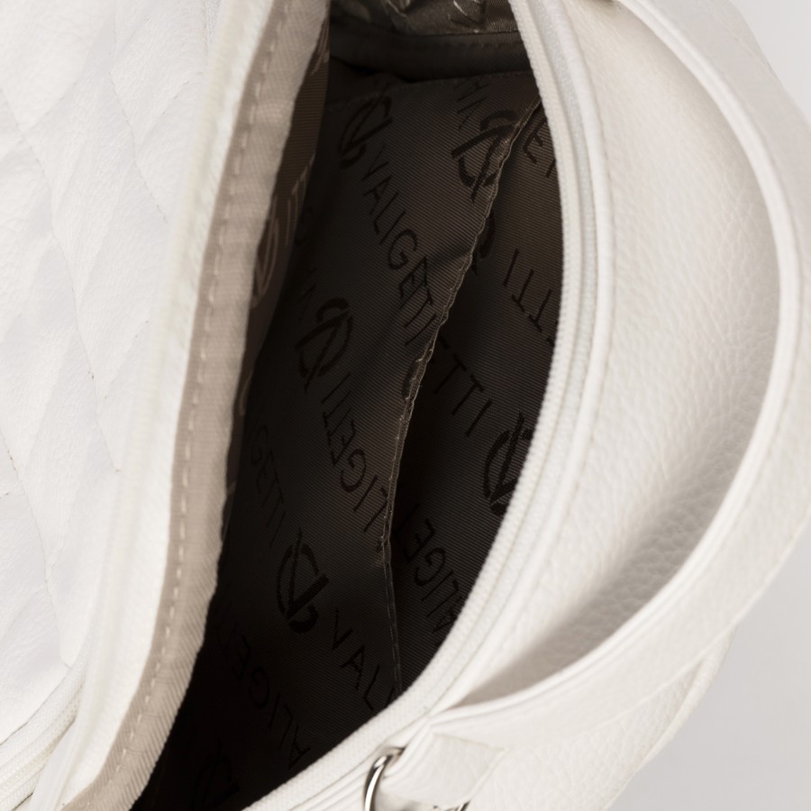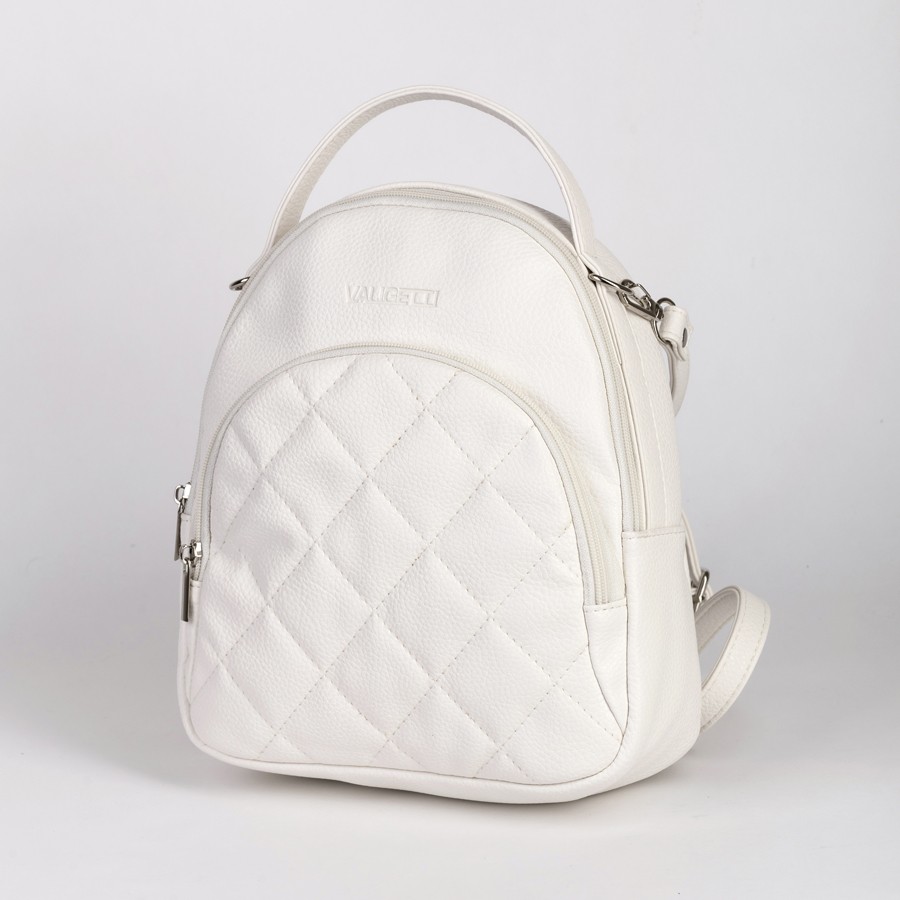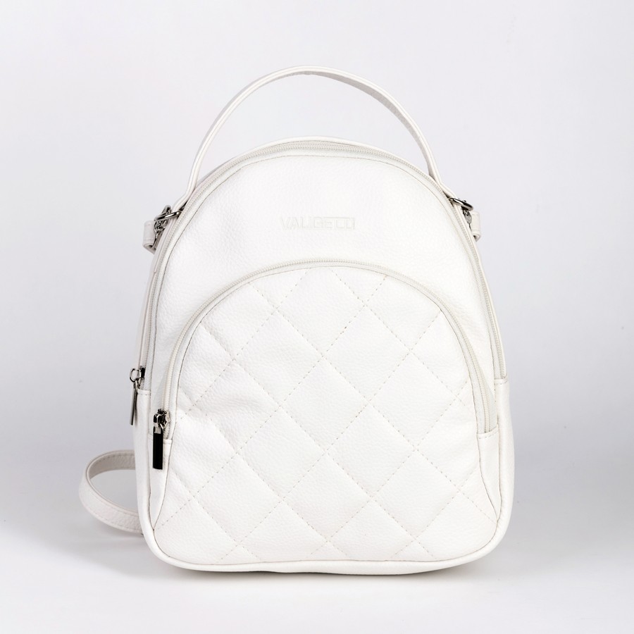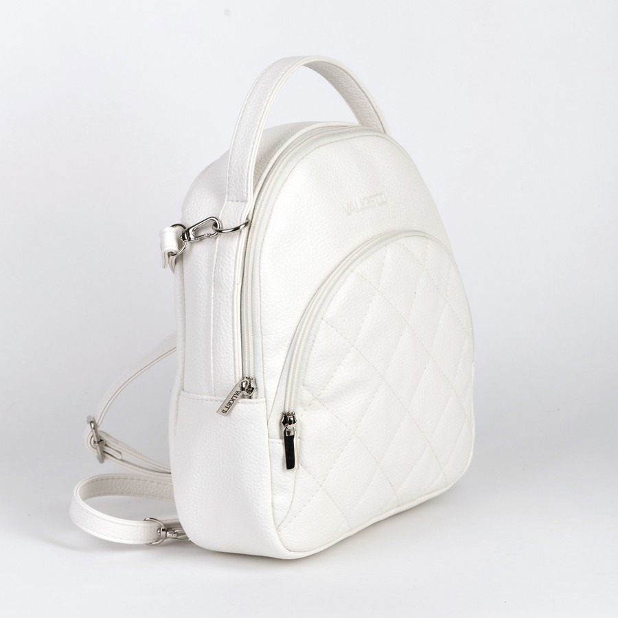 Стильный женский рюкзак из белой искусственной кожи с аккуратной стёжкой на фронтальном кармане. Форма — округлая сверху, с плавными линиями и минималистичным дизайном. Фурнитура выполнена в серебристом цвете, что подчёркивает современный и элегантный вид.