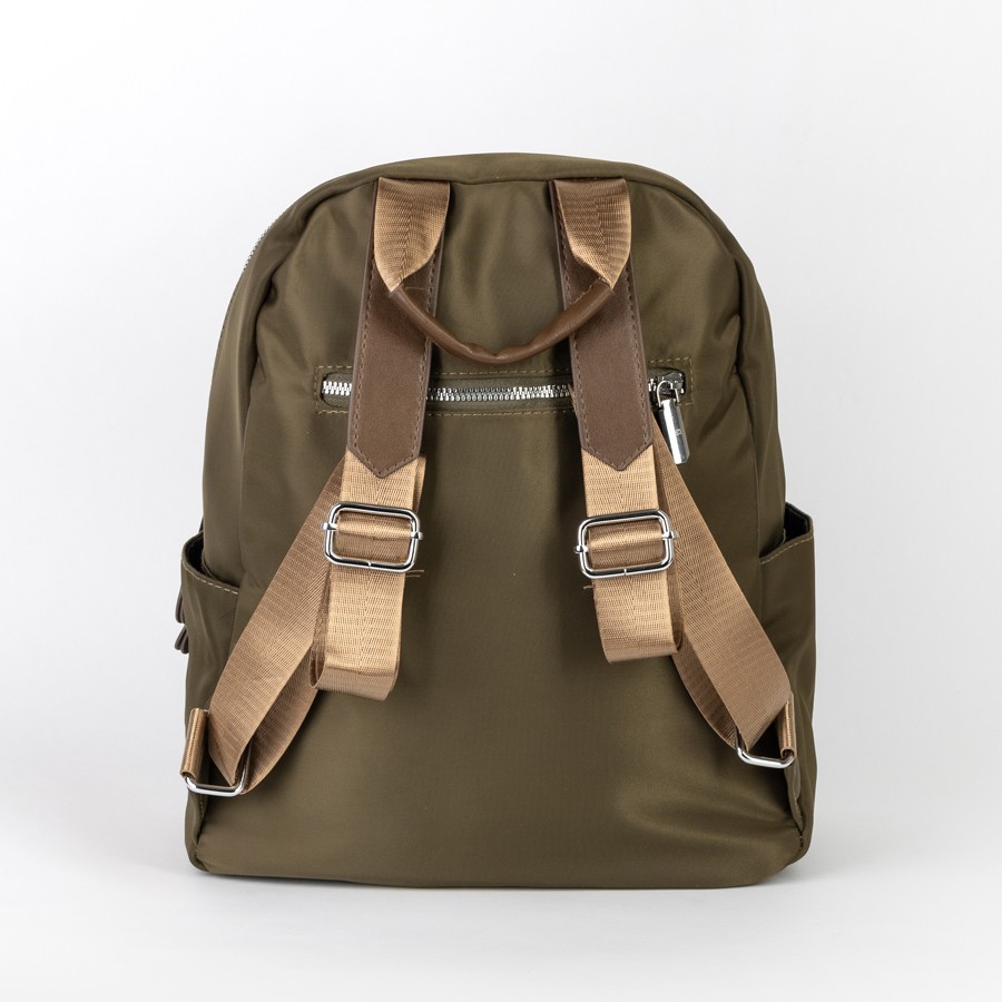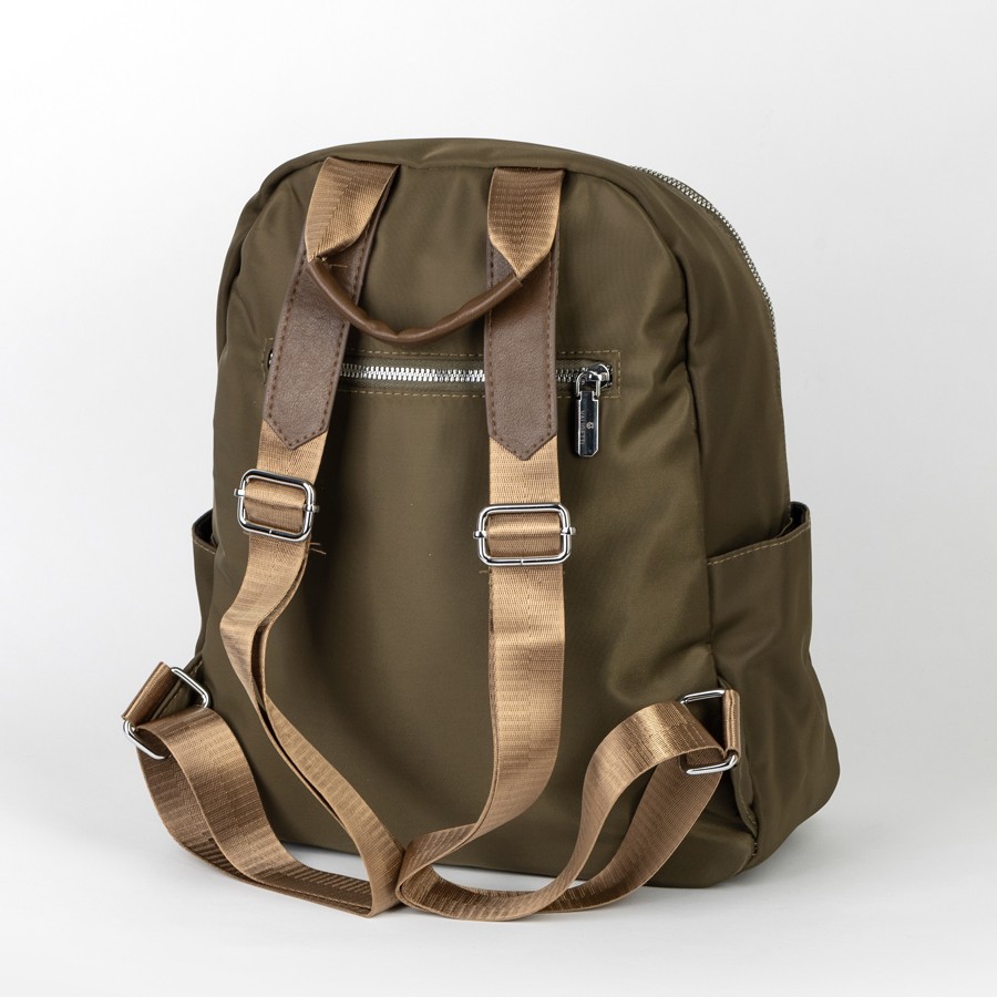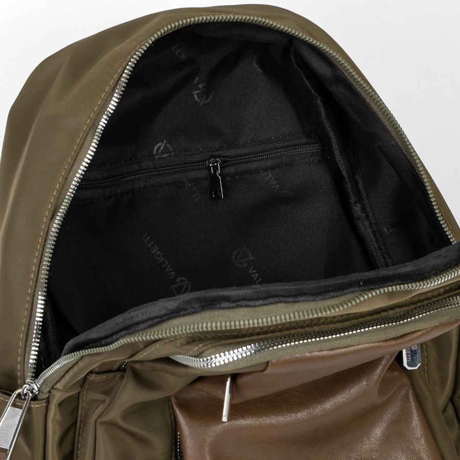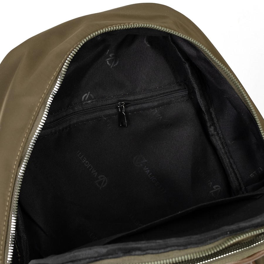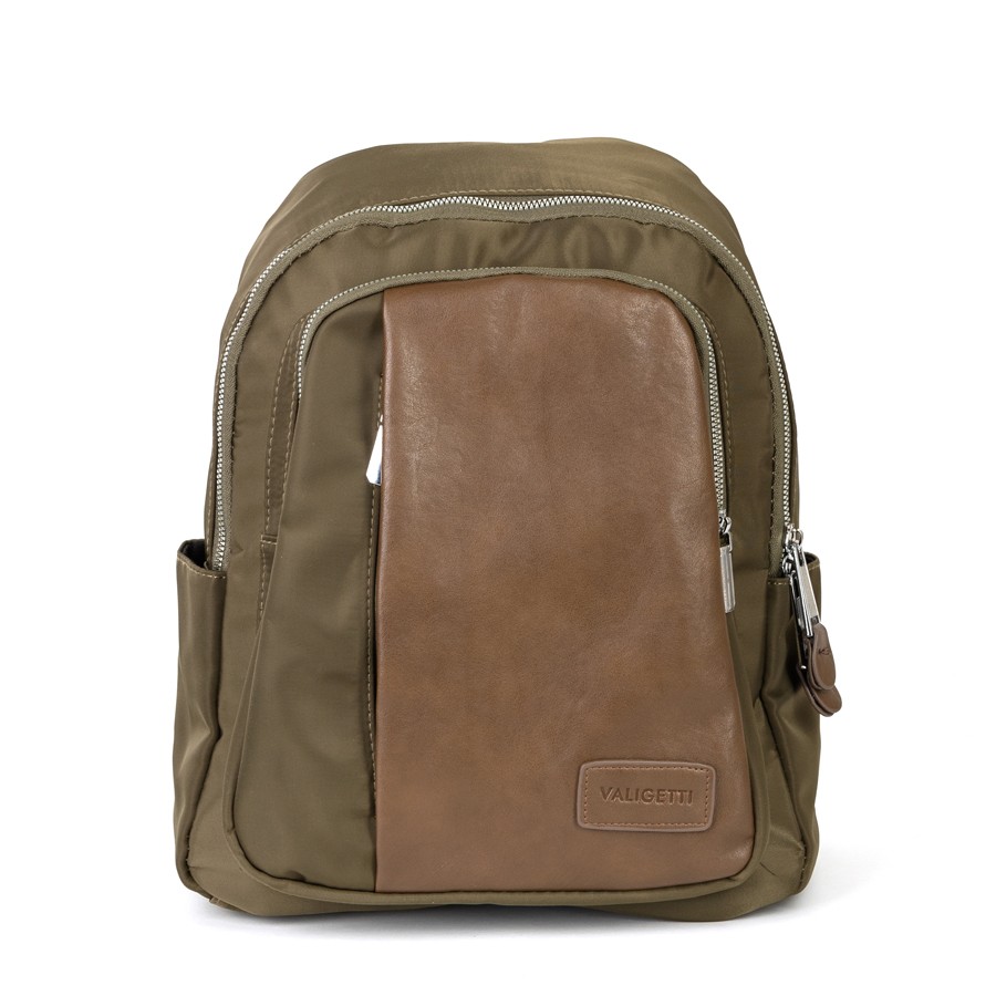 Стильный женский рюкзак бренда Valigetti из искусственной гладкой кожи приятной на ощупь. Имеет плечевые лямки золотистые и пришитую кожаную ручку. Внутри основного отделения есть карман на молнии и кармашек для мелких вещей. На лицевой стороне есть дополнительной отделение и карман на молниях. По бокам 2 открытых кармашка. С задней стороны есть карман на молнии