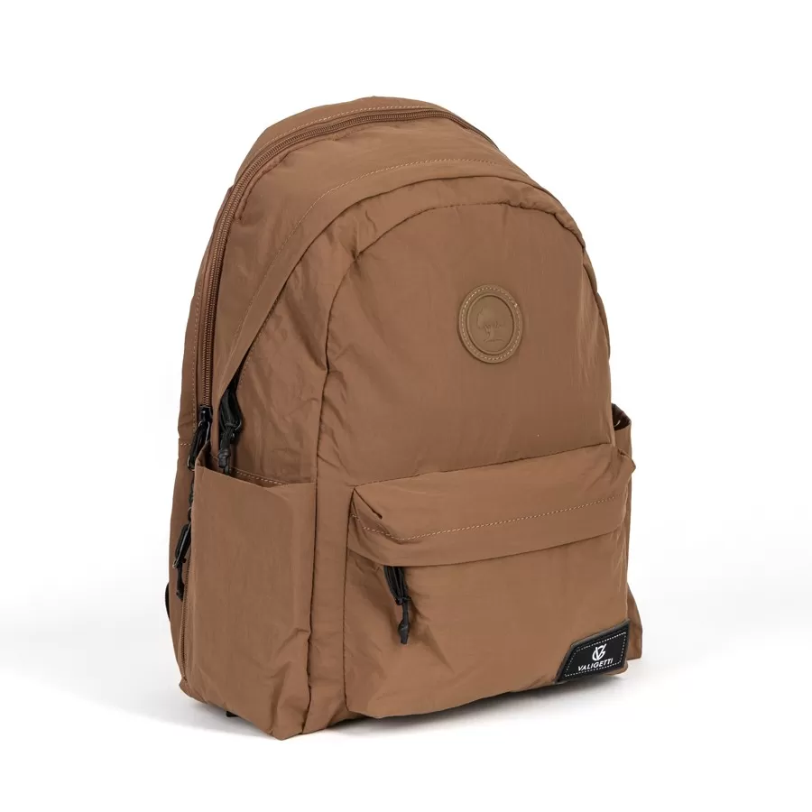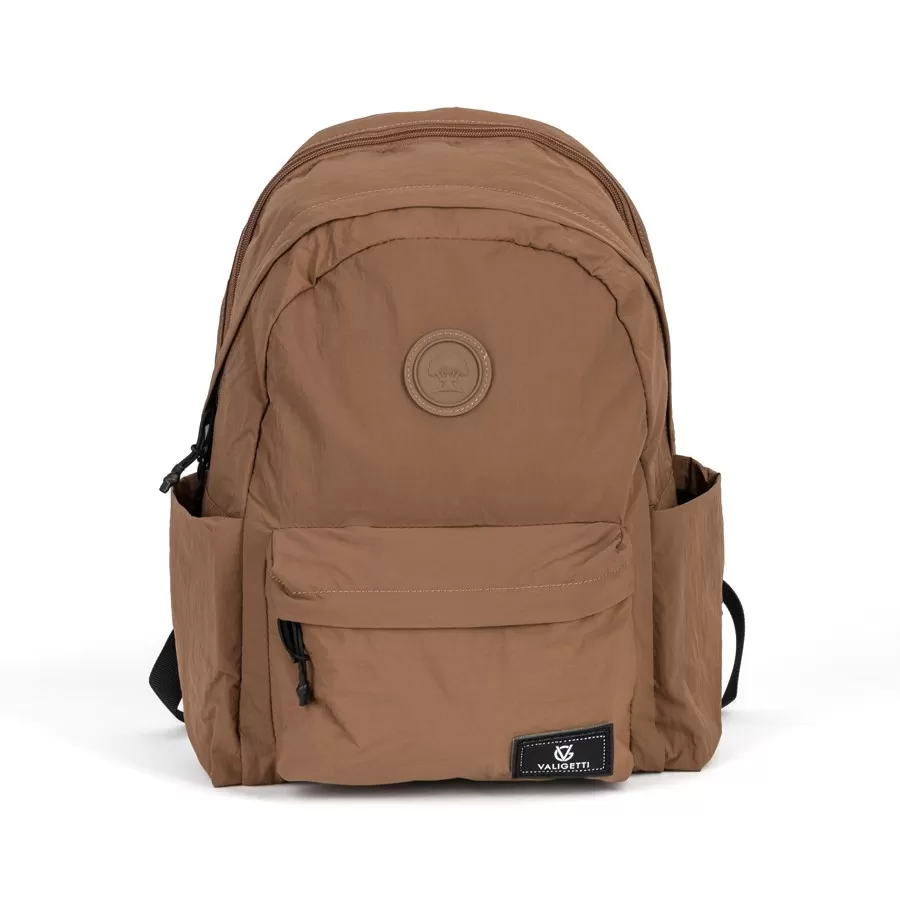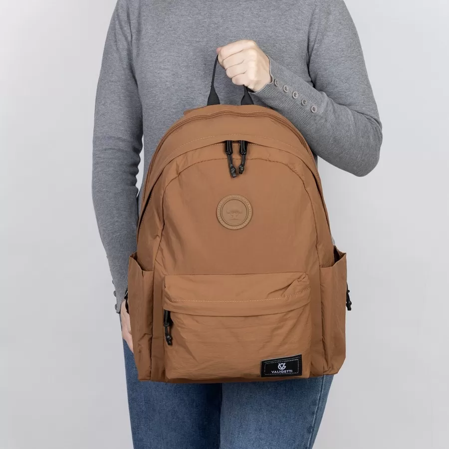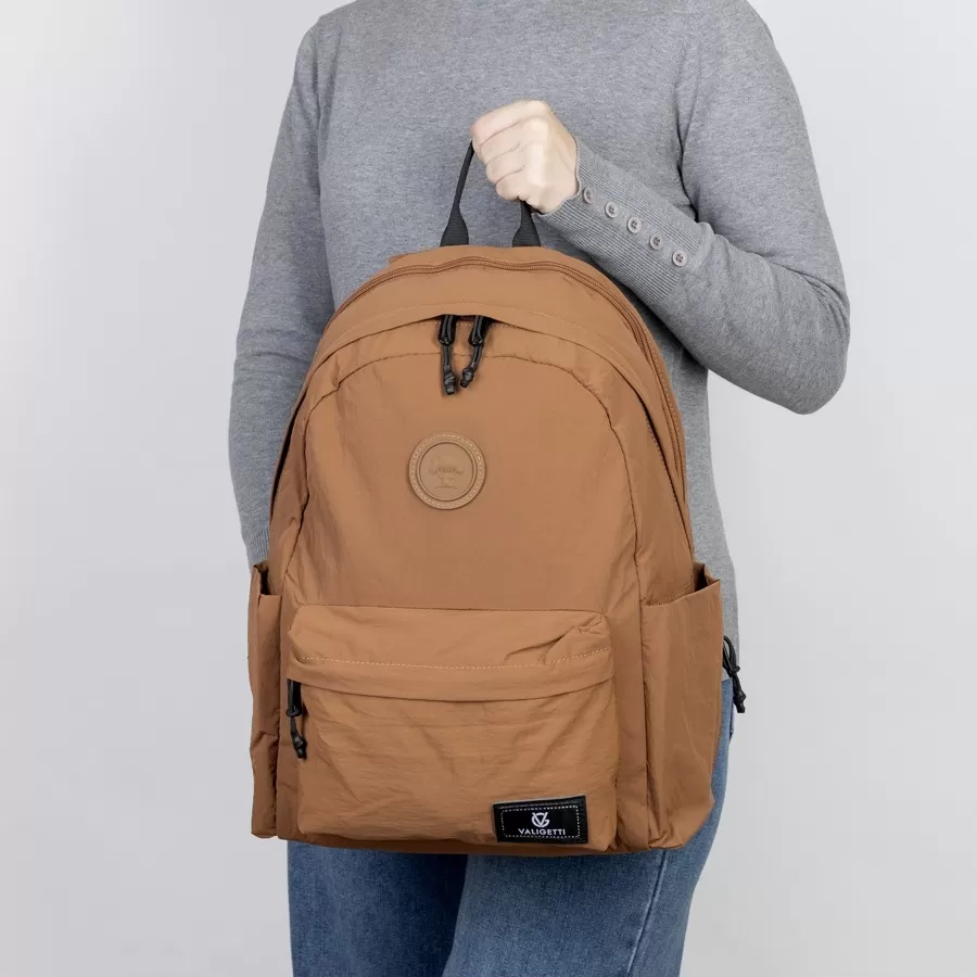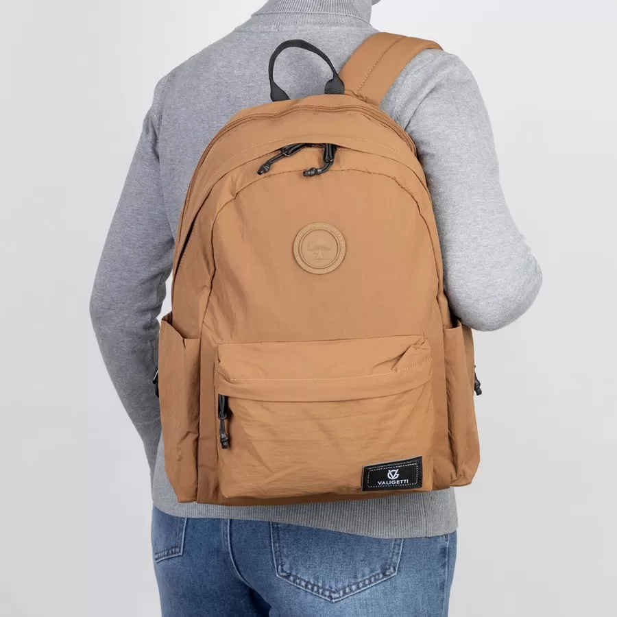 Рюкзак бренда Valigetti из текстиля коричневого цвета. Прошит фирменной подкладочной тканью. Имеет плечевые лямки и пришитую текстильную ручку. Внутри основного отделения есть карман на молнии и отделение для ноутбука. Есть дополнительное отделение сзади На лицевой стороне есть на молнии. По бокам 2 открытых кармашка. С задней стороны есть защищенный карман на молнии