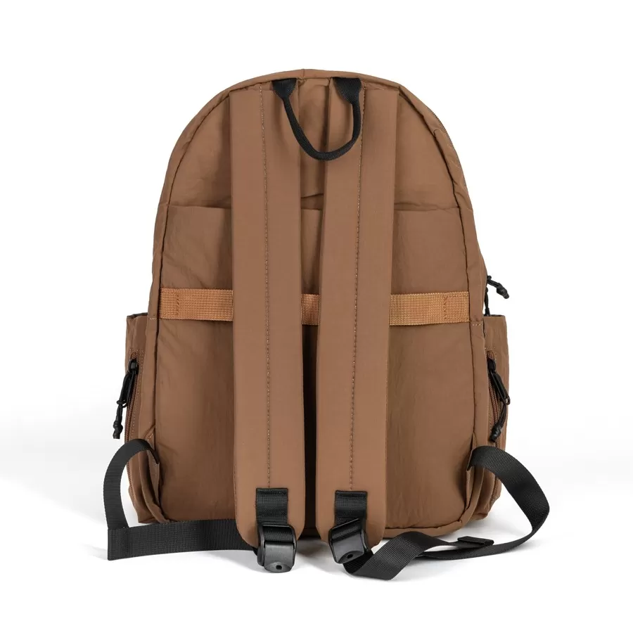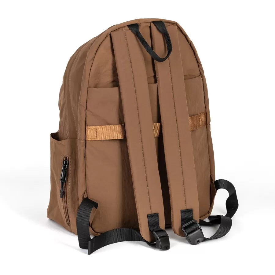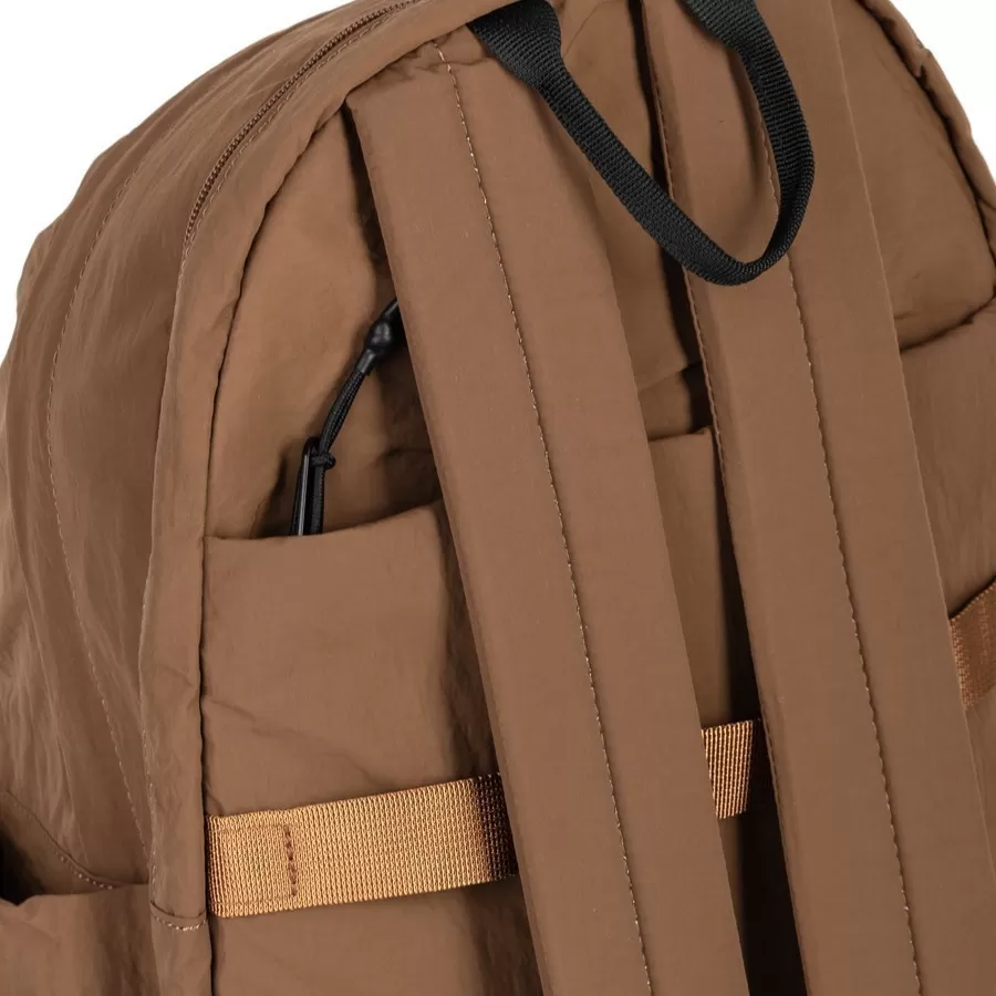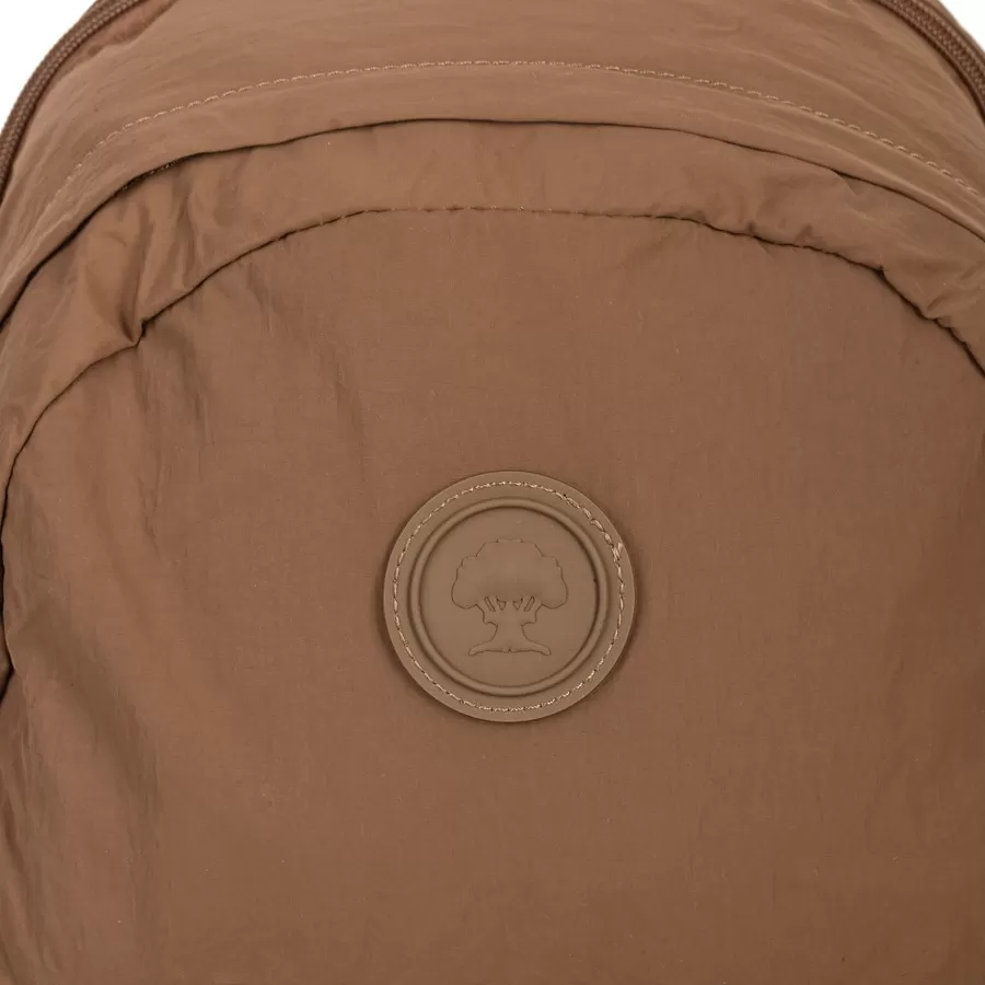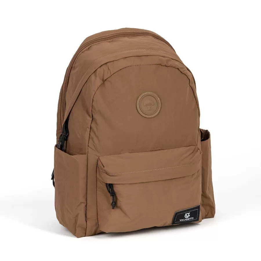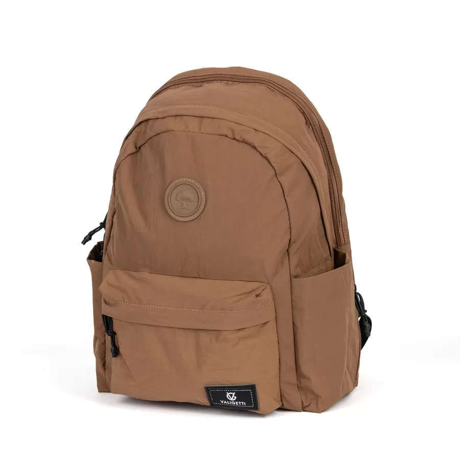 Рюкзак бренда Valigetti из текстиля коричневого цвета. Прошит фирменной подкладочной тканью. Имеет плечевые лямки и пришитую текстильную ручку. Внутри основного отделения есть карман на молнии и отделение для ноутбука. Есть дополнительное отделение сзади На лицевой стороне есть на молнии. По бокам 2 открытых кармашка. С задней стороны есть защищенный карман на молнии