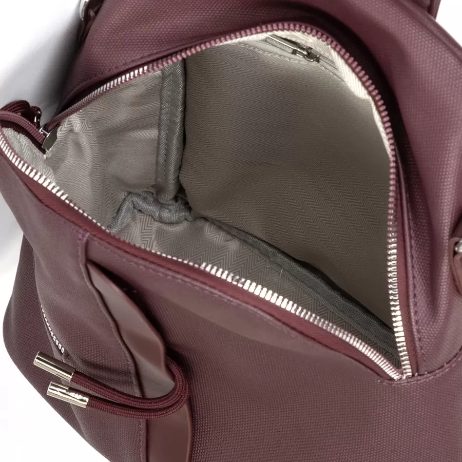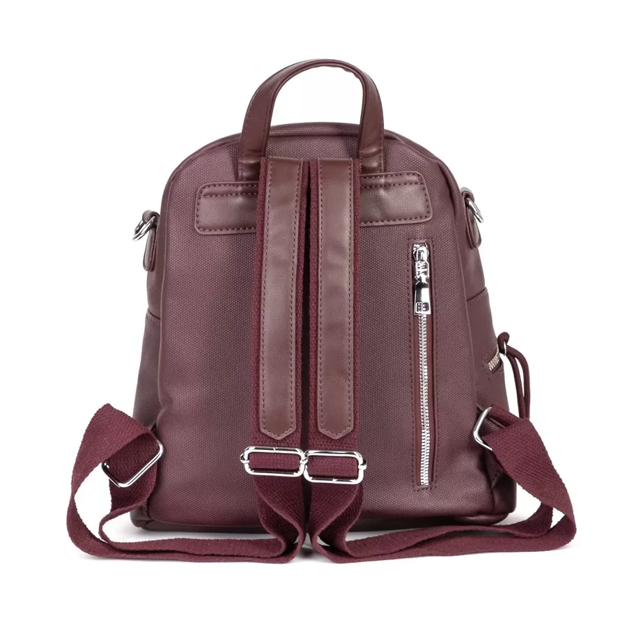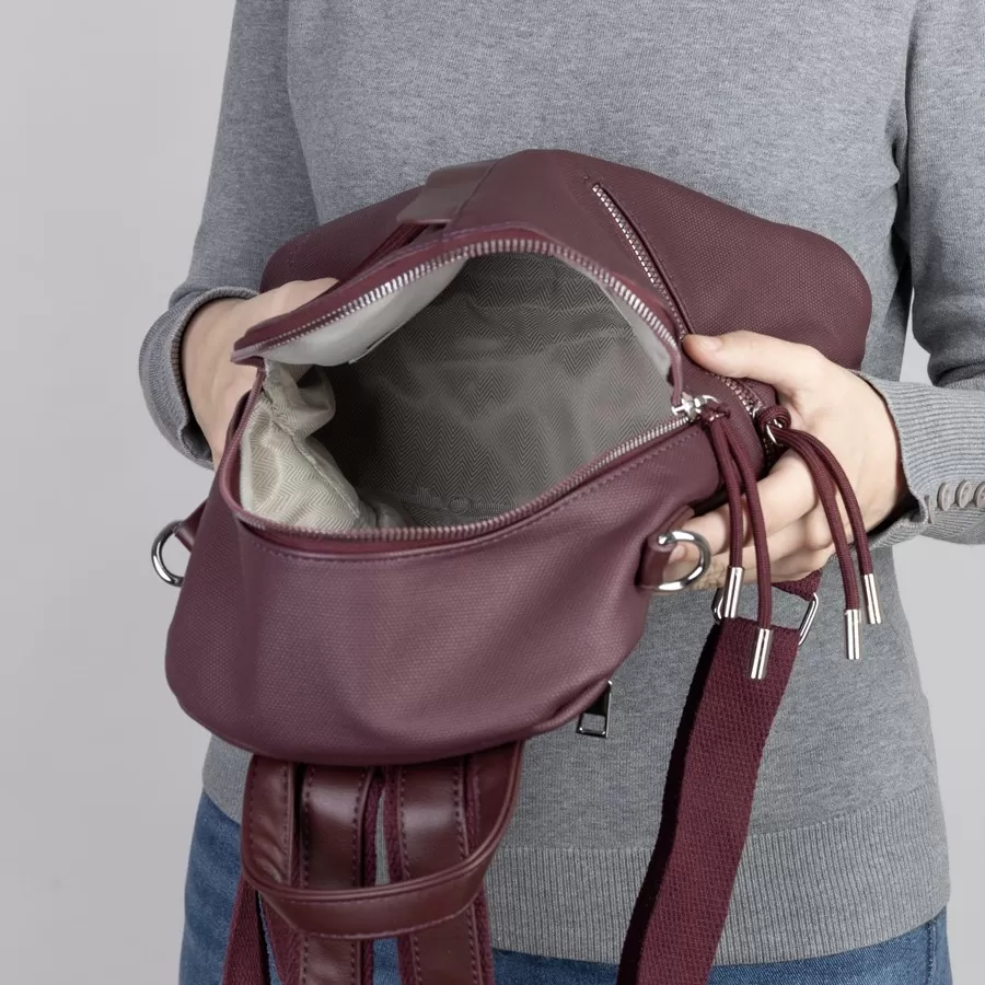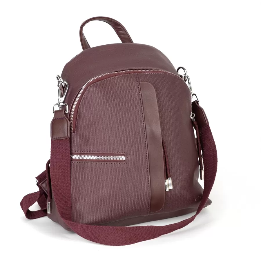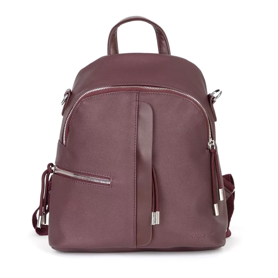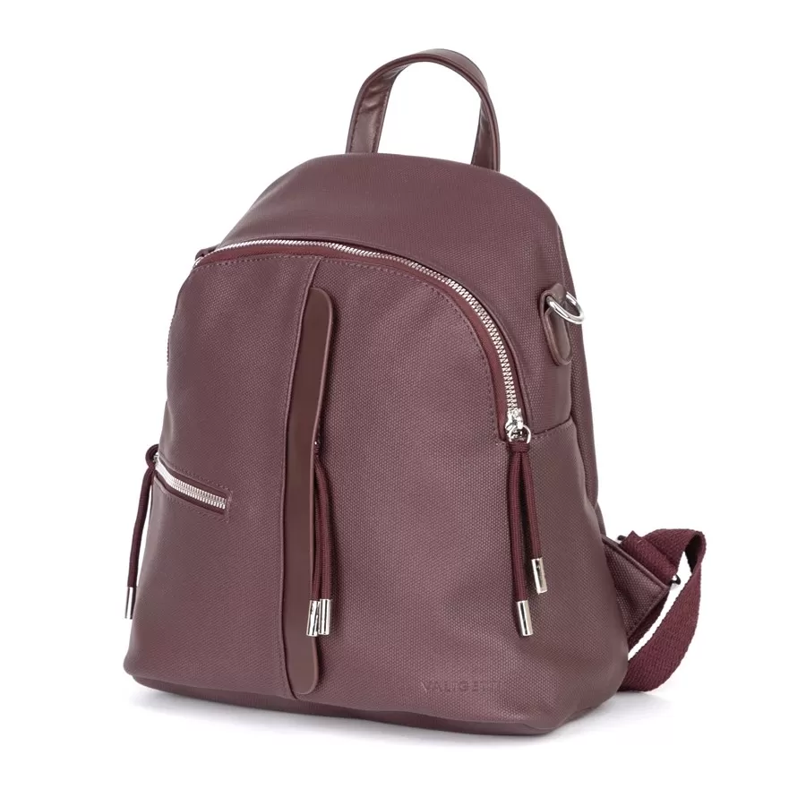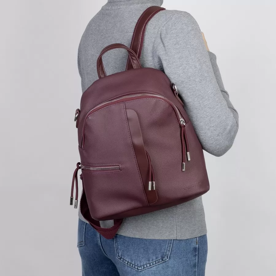 Рюкзак от торговой марки Valigetti из искусственной кожи бордового цвета. Модель с лямкой-переноской, уплотненными регулируемыми плечевыми лямками. Одно отделение на молнии, с фирменной подкладкой. В основном отделении: карман на молнии, накладной карман. На лицевой и задней сторонах – карман на молнии.