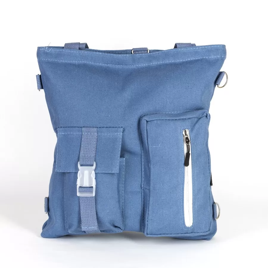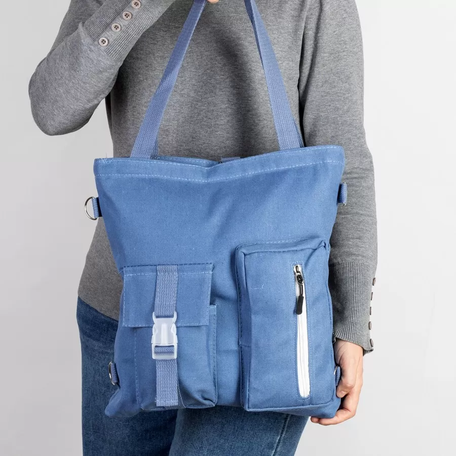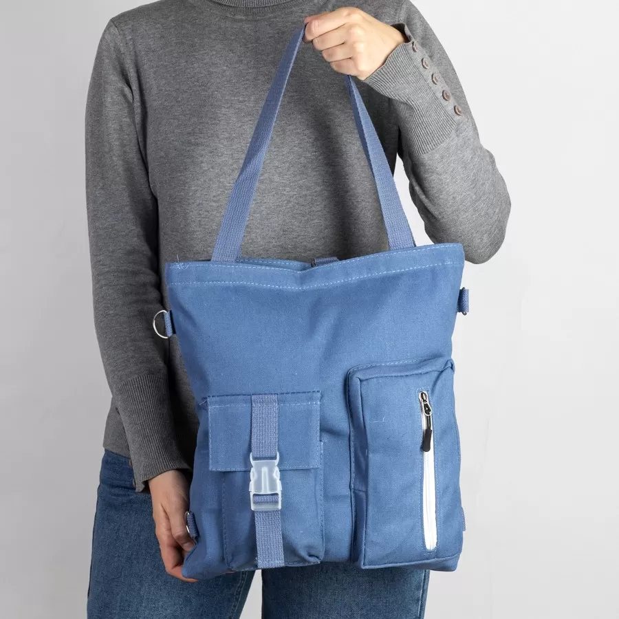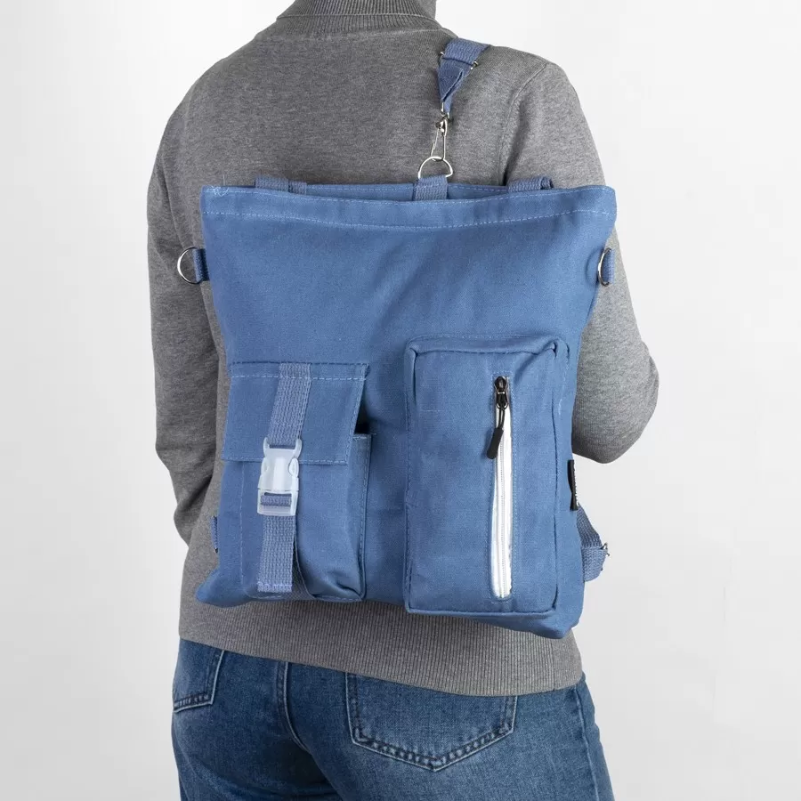 Сумка-рюкзак от торговой марки Ecotope из плотного практичного текстильного материала голубого цвета. Модель с двумя удлиненными ручками и съемным регулируемым плечевым ремнем, который также можно использовать в качестве плечевых лямок. Отделение на молнии. Внутри: без подкладки, навесной карман без застежки. На лицевой стороне – два накладных карман, один из которых на молнии, другой – с застежкой фастекс.