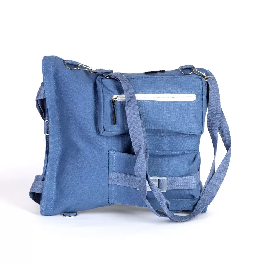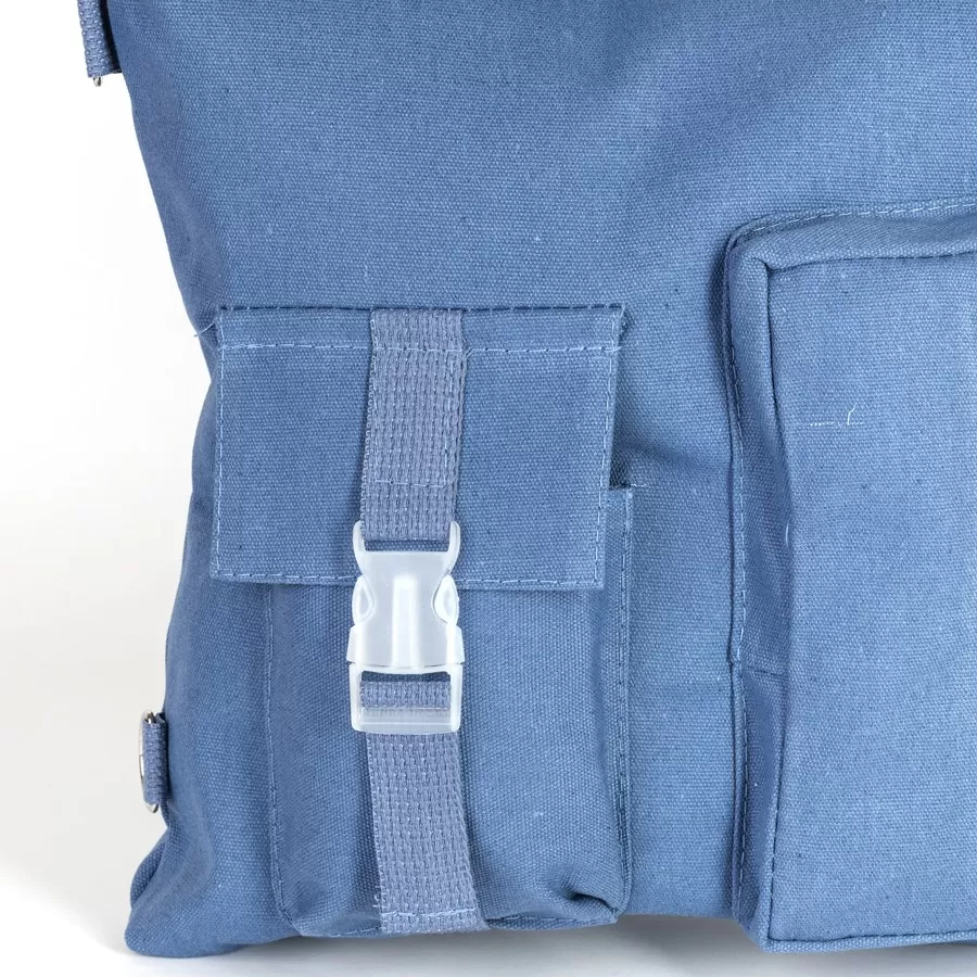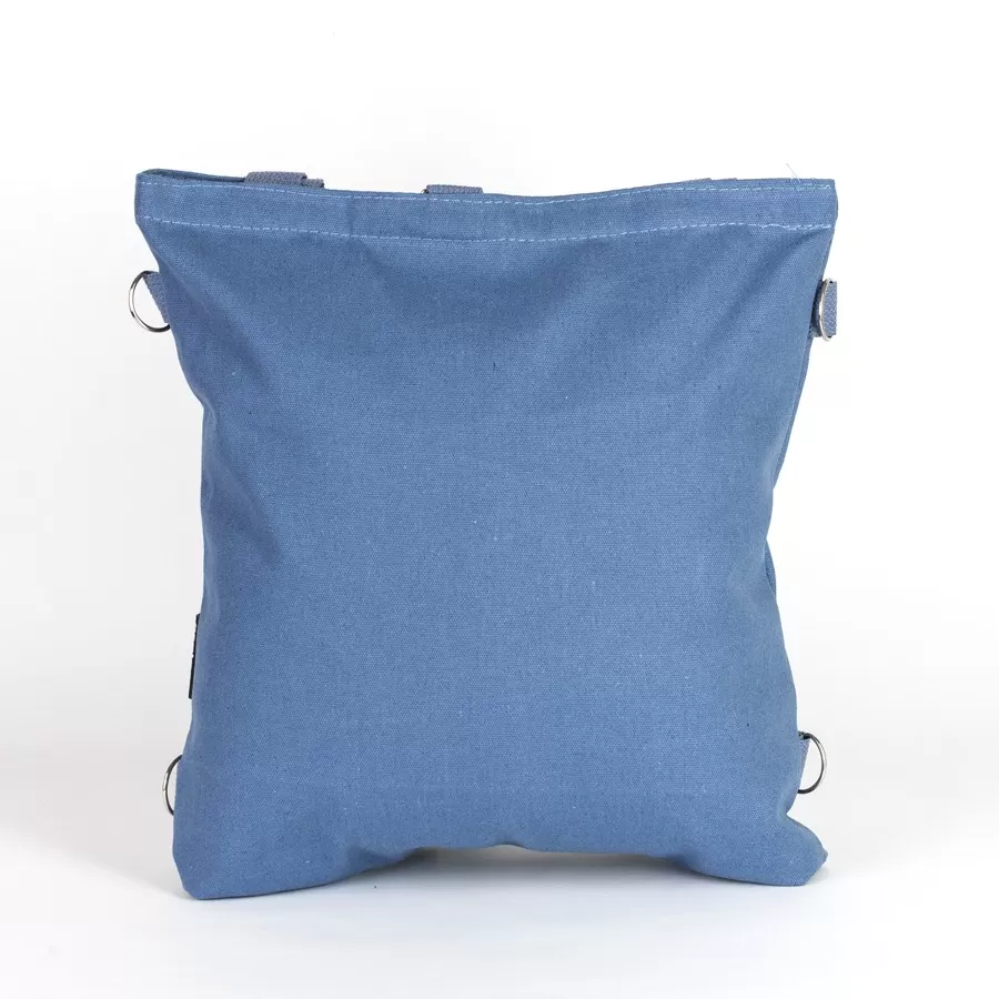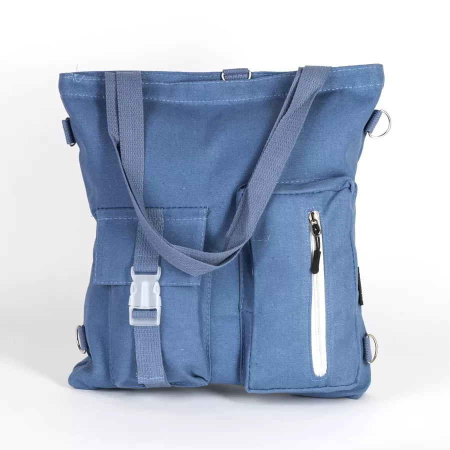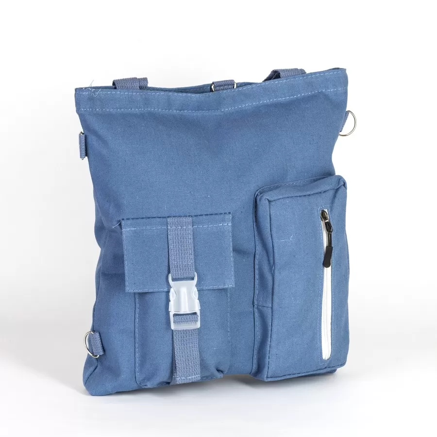 Сумка-рюкзак от торговой марки Ecotope из плотного практичного текстильного материала голубого цвета. Модель с двумя удлиненными ручками и съемным регулируемым плечевым ремнем, который также можно использовать в качестве плечевых лямок. Отделение на молнии. Внутри: без подкладки, навесной карман без застежки. На лицевой стороне – два накладных карман, один из которых на молнии, другой – с застежкой фастекс.